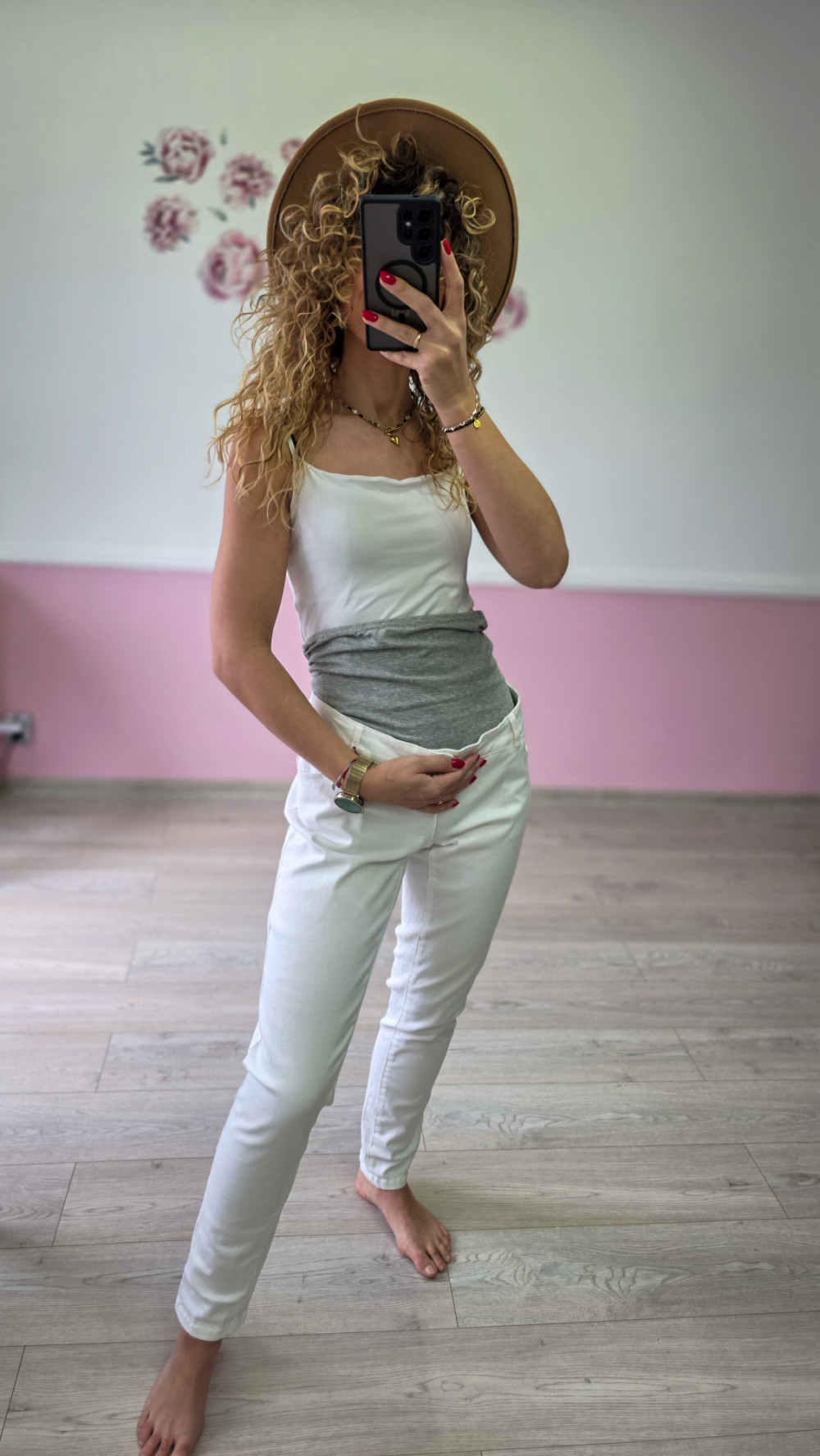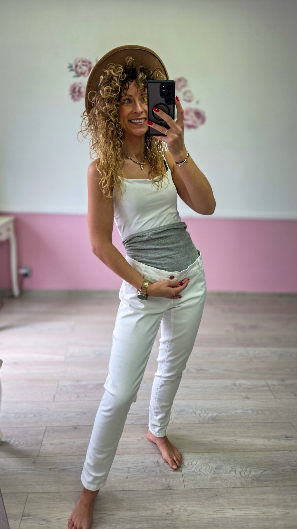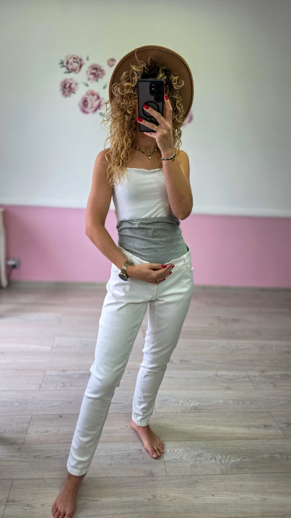 Szeroki, miękki pas z dzianiny idealnie otula rosnący brzuszek, zapewniając wsparcie, nie uciskając i dopasowując się do zmieniającej się sylwetki. Prosta, delikatnie dopasowana nogawka sprawia, że spodnie wyglądają stylowo zarówno w codziennych, jak i bardziej eleganckich stylizacjach.