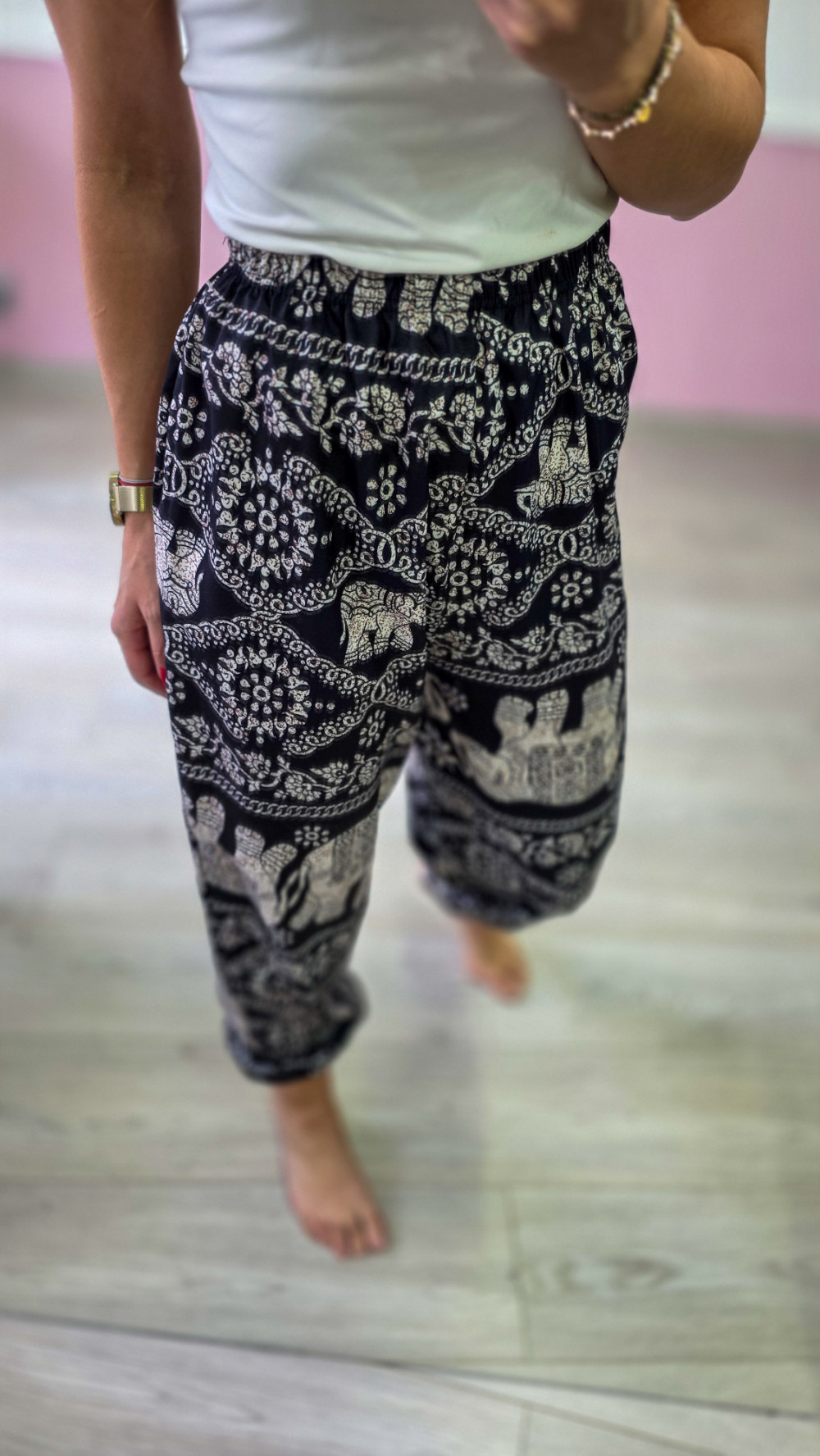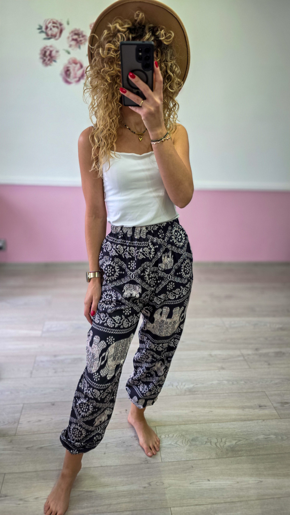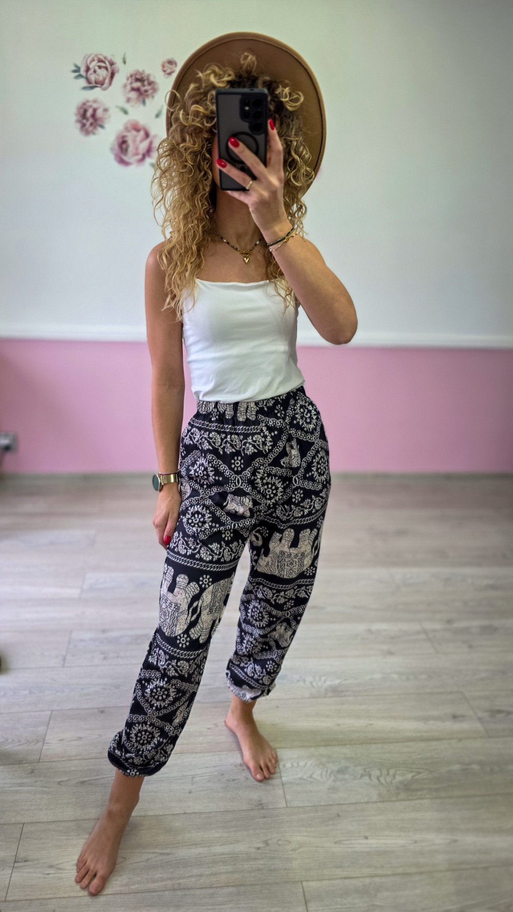 Odkryj wyjątkowy komfort i oryginalny styl dzięki naszym materiałowym spodniom ozdobionym etnicznym wzorem ze słoniami. Wykonane z lekkiego, przewiewnego materiału idealnie sprawdzą się zarówno na co dzień, jak i podczas wakacyjnych wyjazdów czy domowego relaksu.
