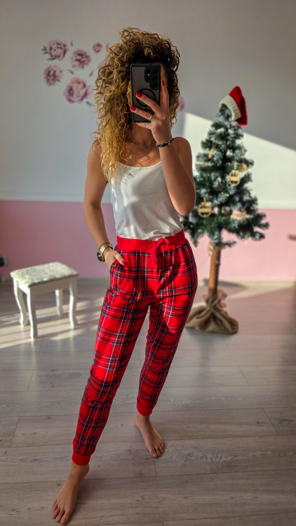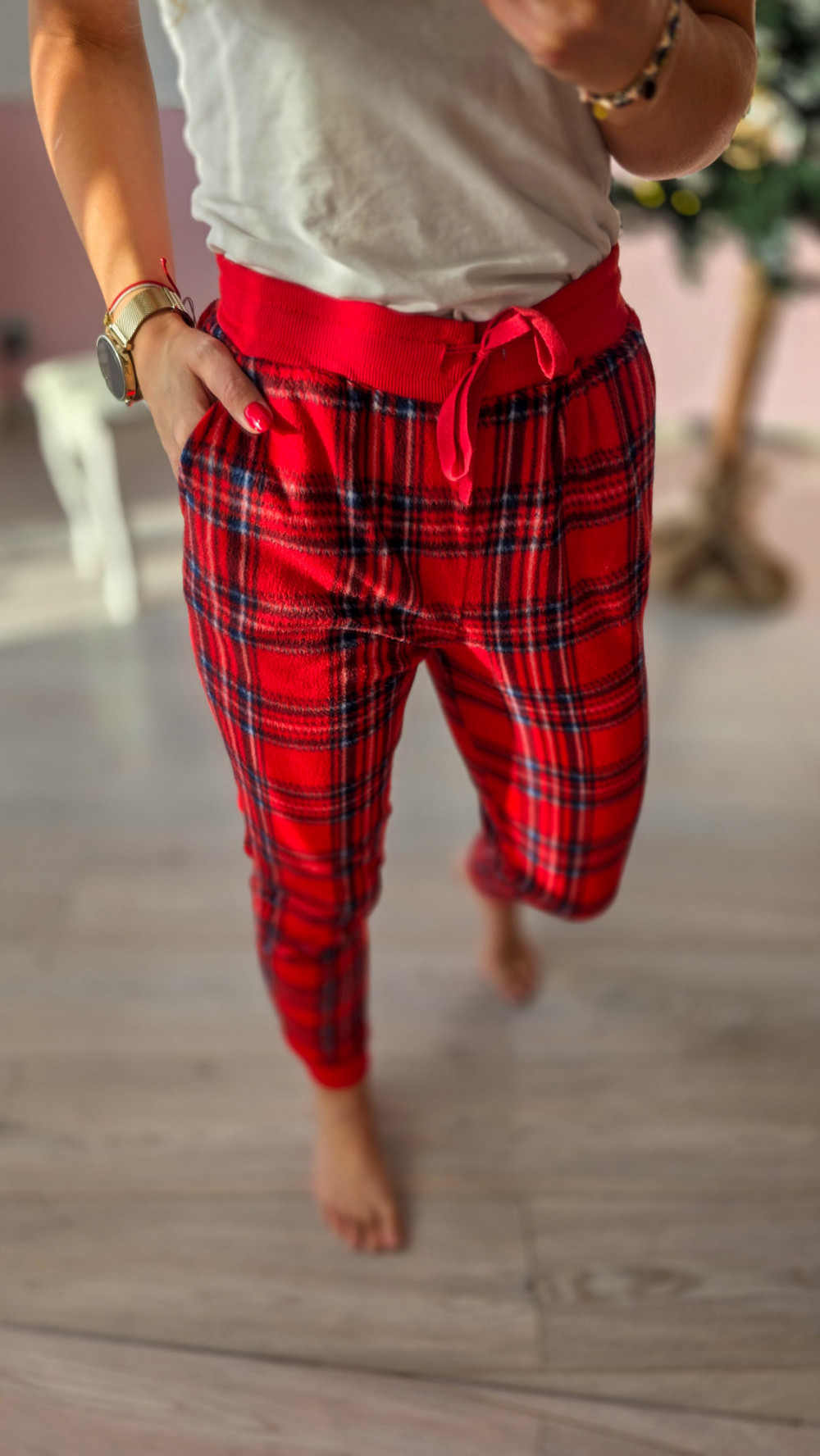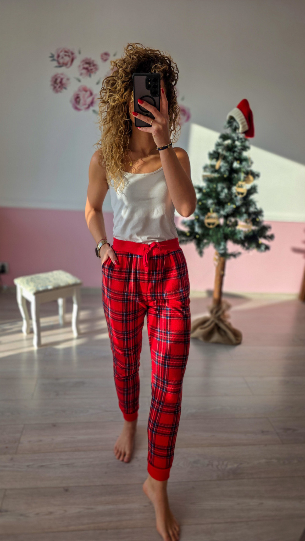 Czerwone spodnie damskie w świąteczną kratę – idealne na zimowy sezon