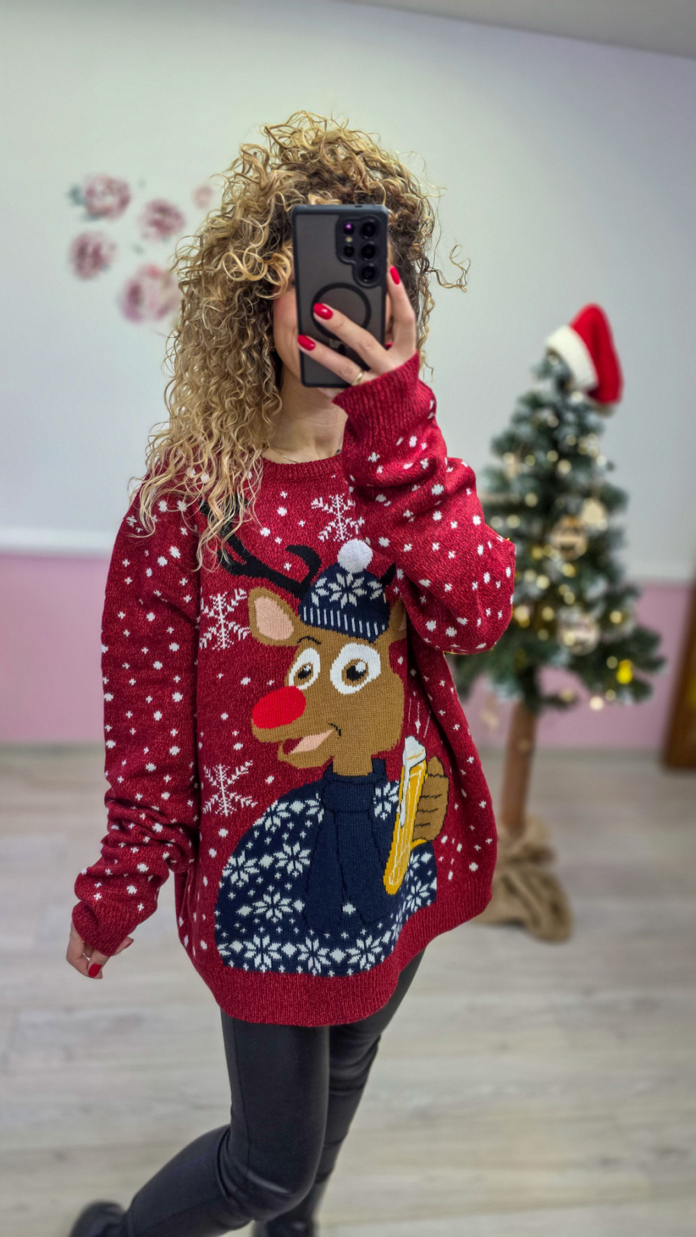 Sweter świąteczny damski – czerwony renifer z piwem / kubkiem