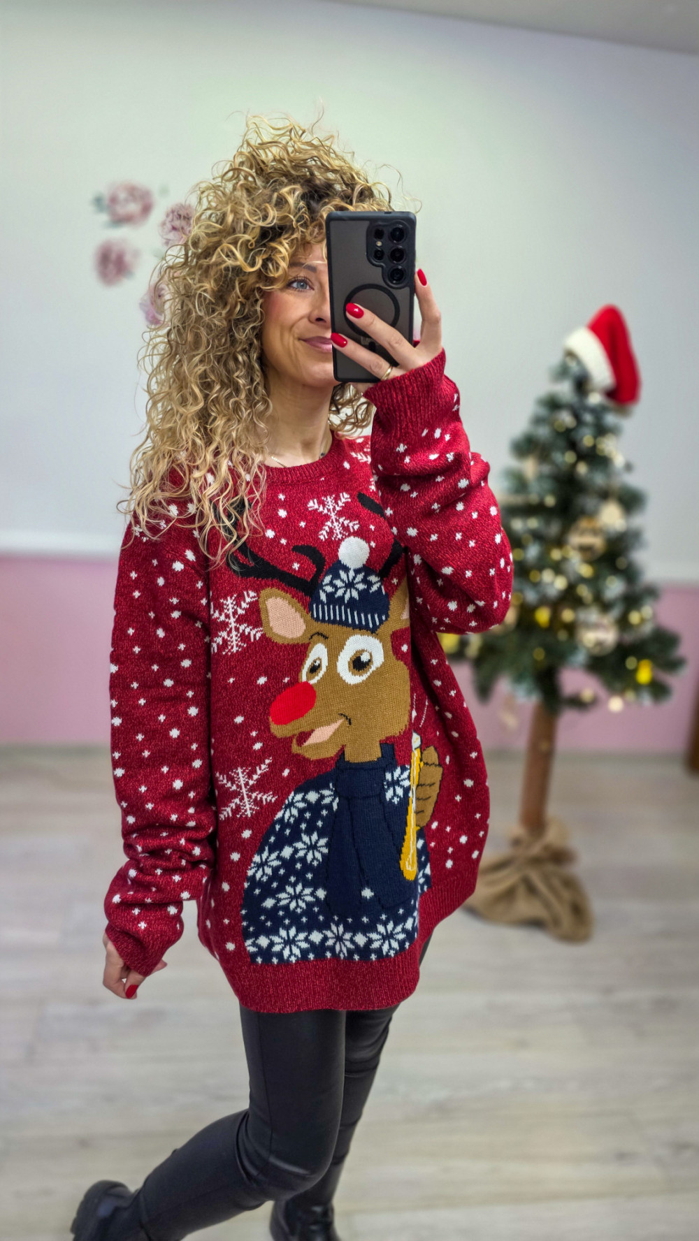 Sweter ma klasyczny, lekko oversize’owy fason, dzięki czemu świetnie wygląda zarówno do legginsów, jak i jeansów. To idealna propozycja na świąteczne spotkania, firmowe Christmas party, zdjęcia pod choinką i wszystkie grudniowe okazje.