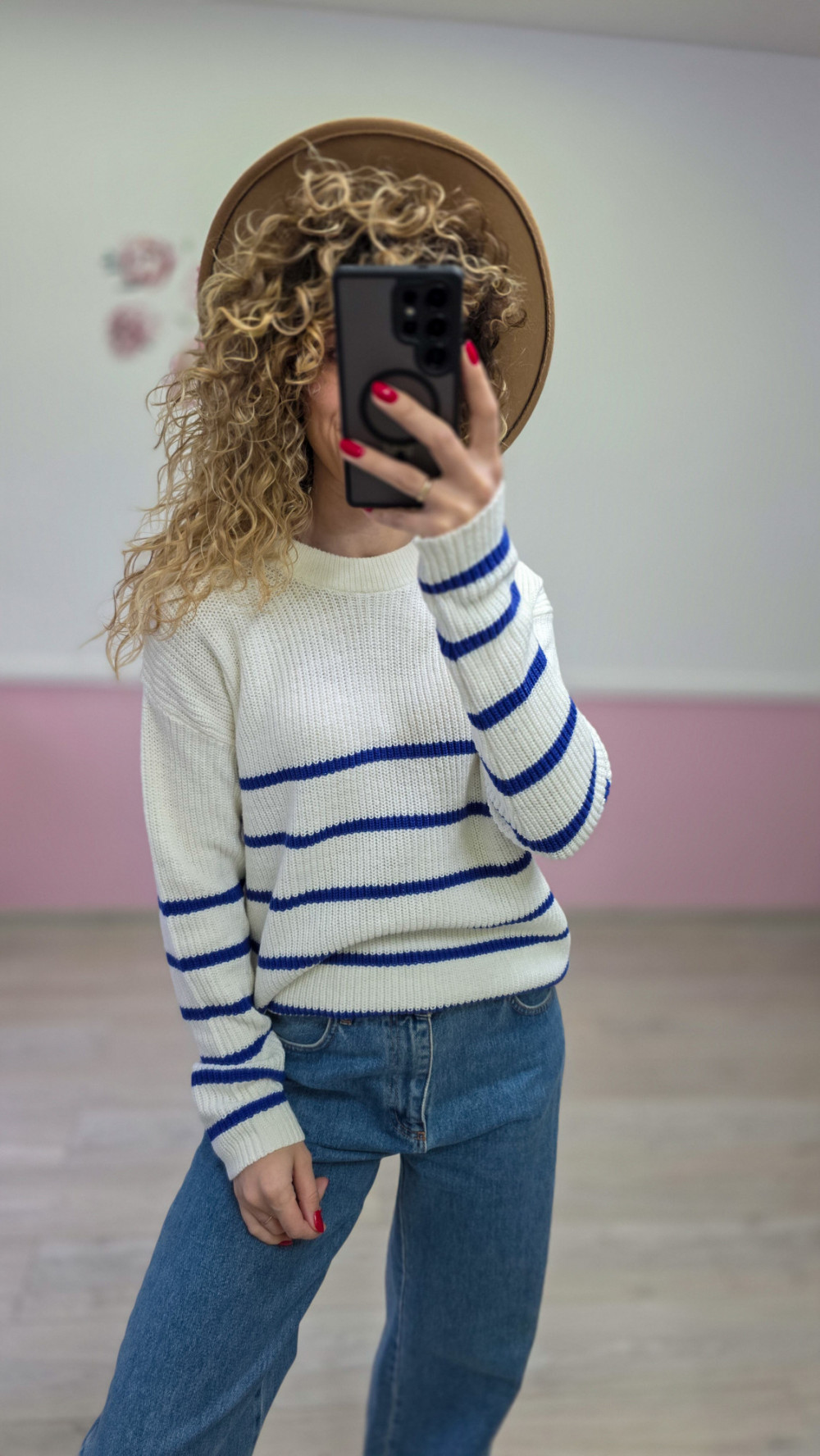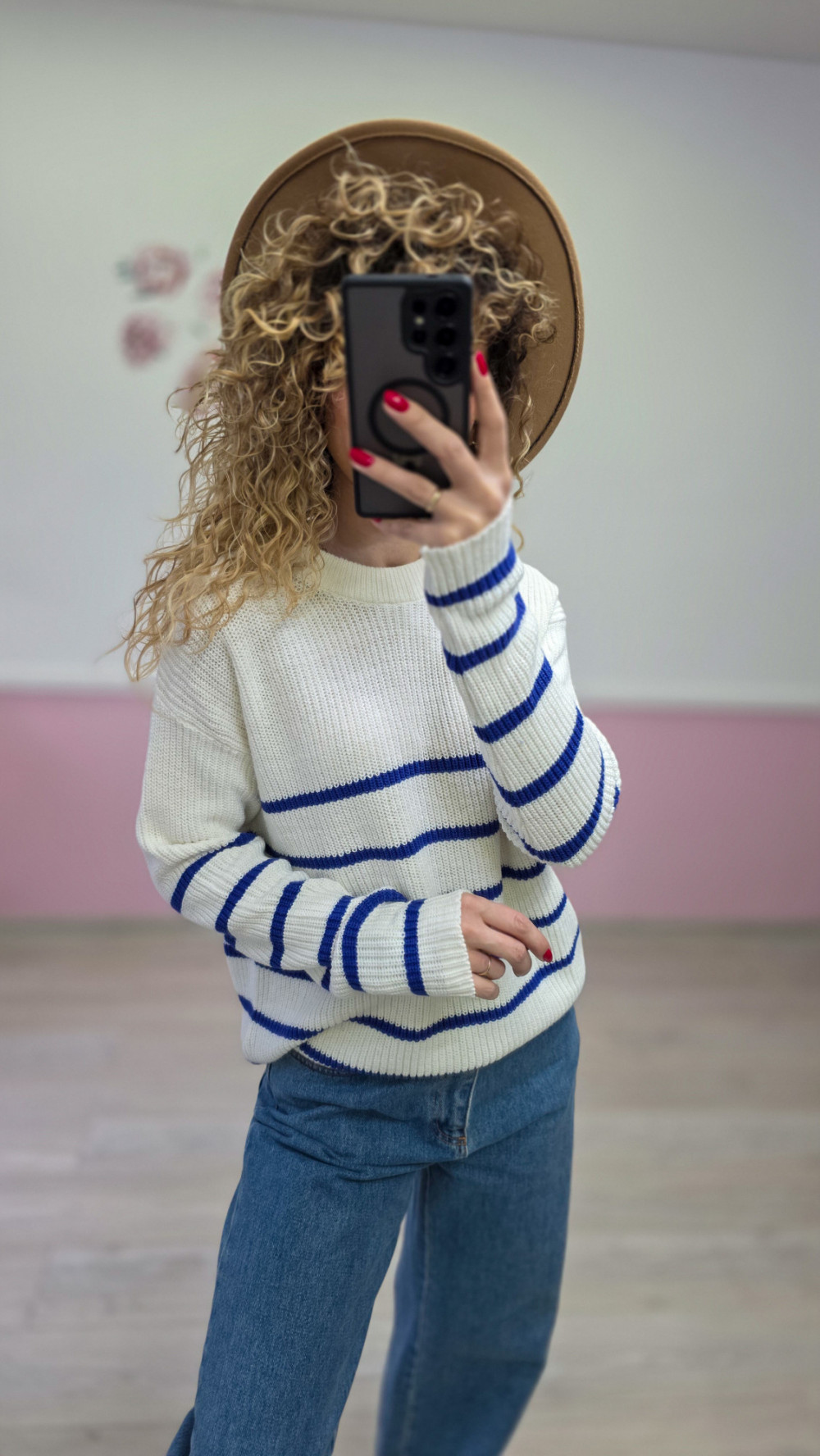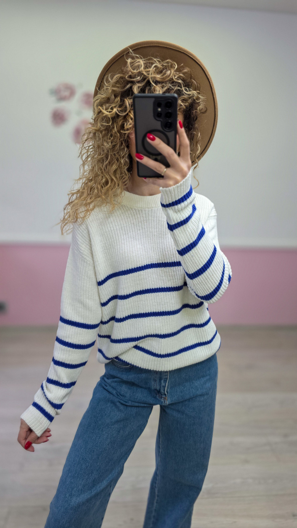Biały sweter damski z poziomymi niebieskimi paskami. Model wykonany z miękkiej, prążkowanej dzianiny zapewniającej ciepło i komfort. Klasyczny krój i ponadczasowy wzór sprawiają, że sweter pasuje do jeansów, szortów oraz stylizacji typu basic. Uniwersalny, idealny na sezon jesień–zima.
