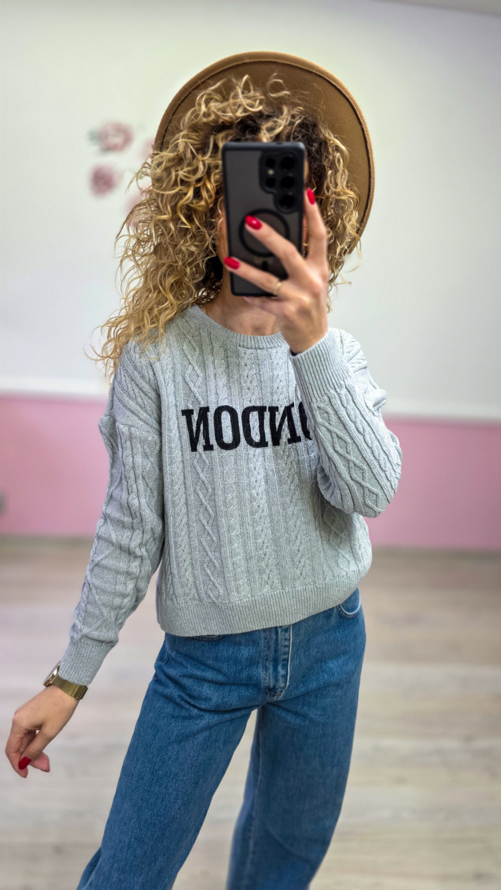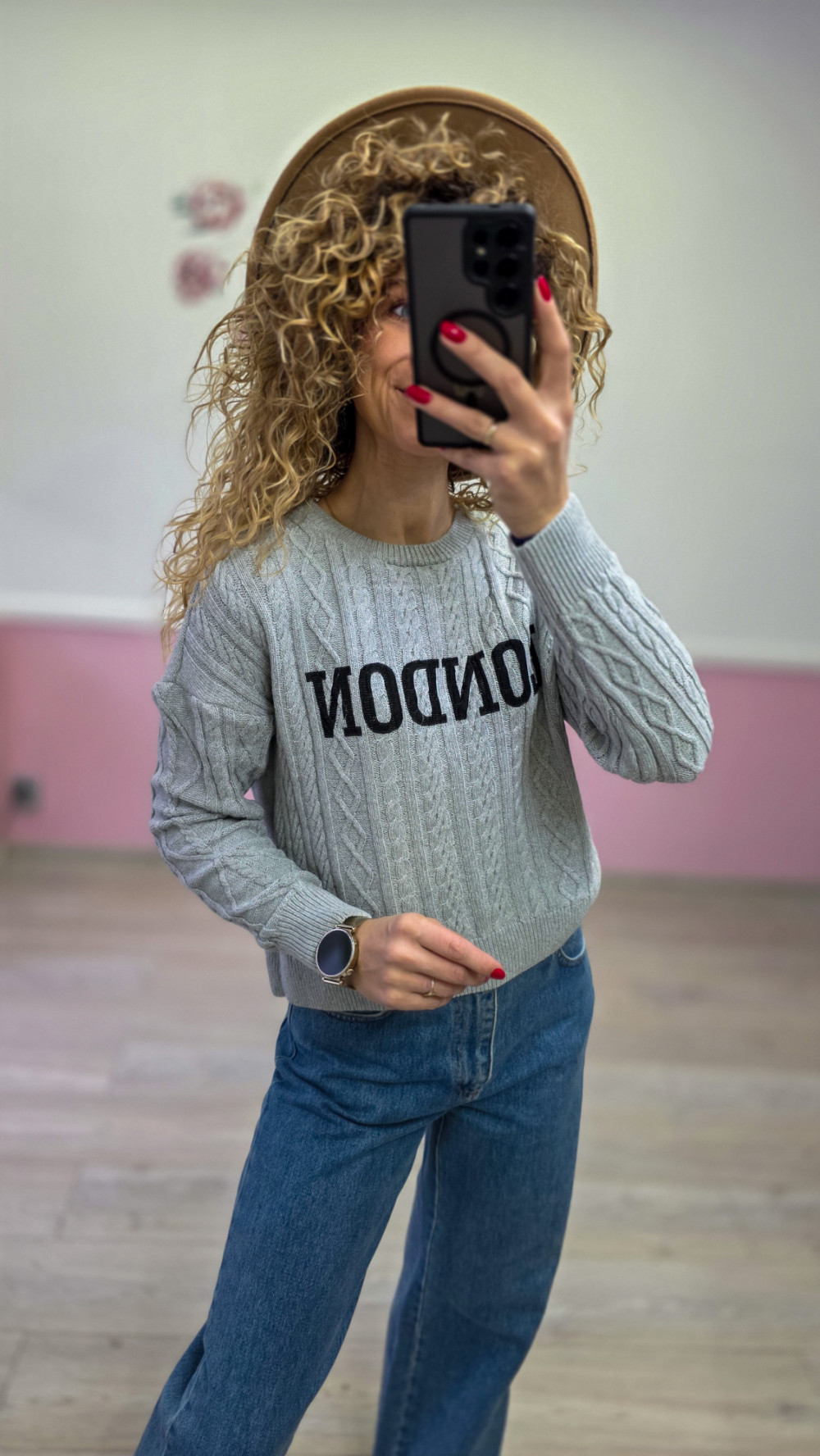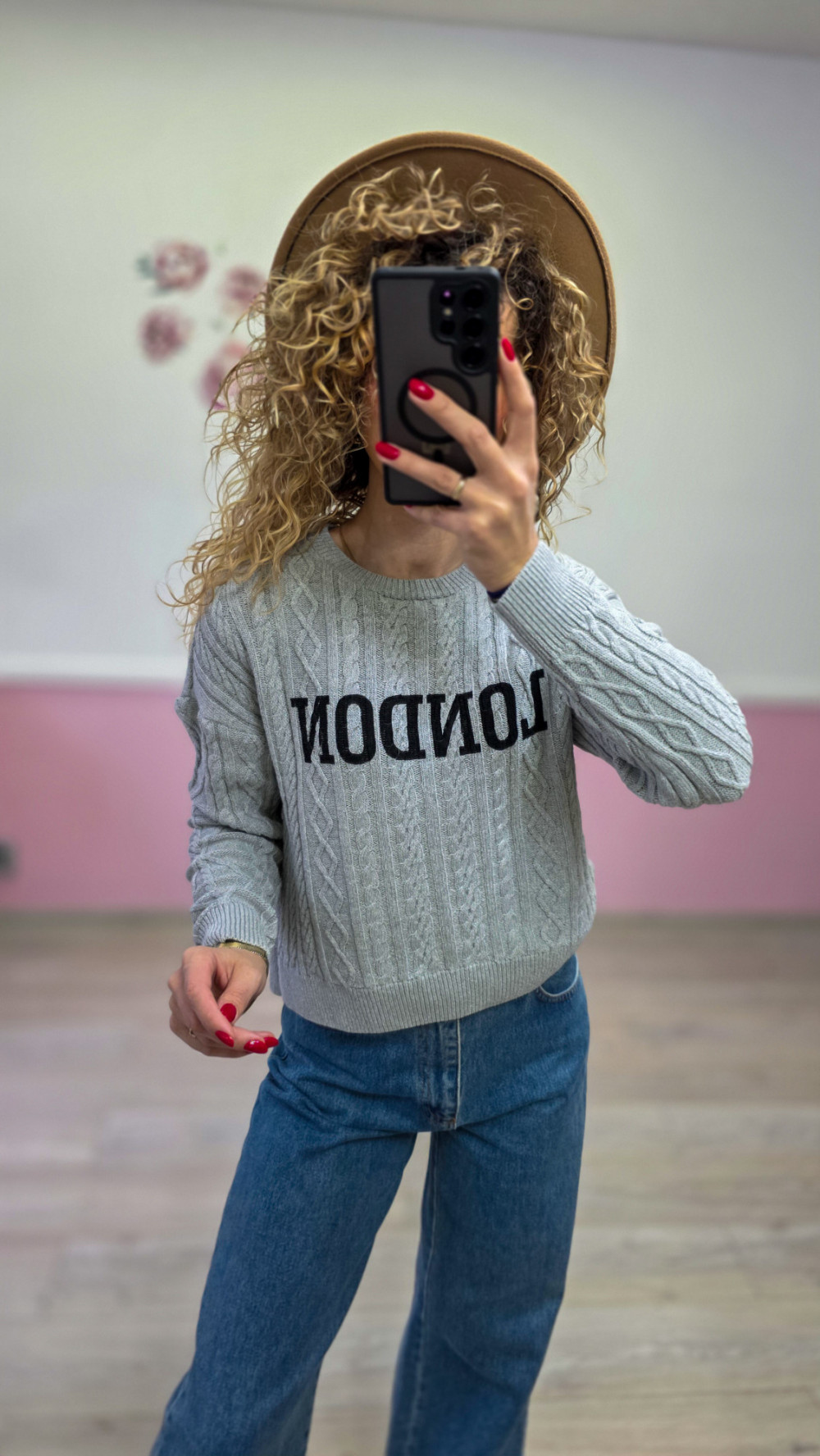 Szary sweter z napisem „LONDON” – warkoczowy splot