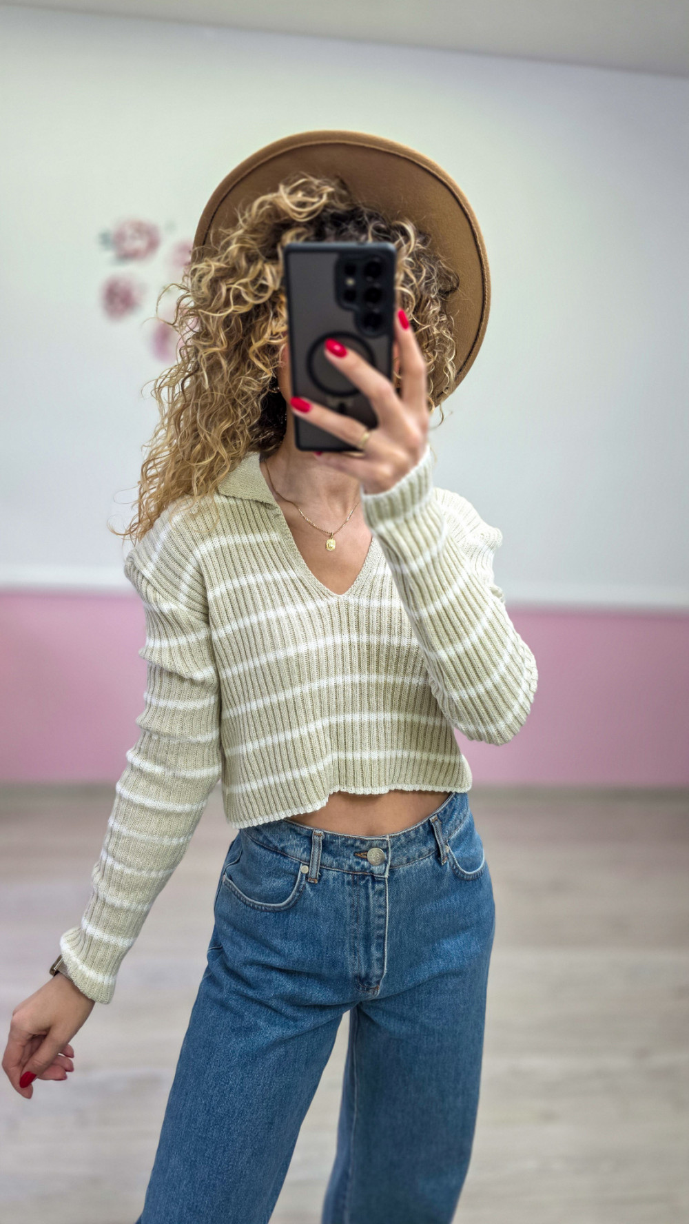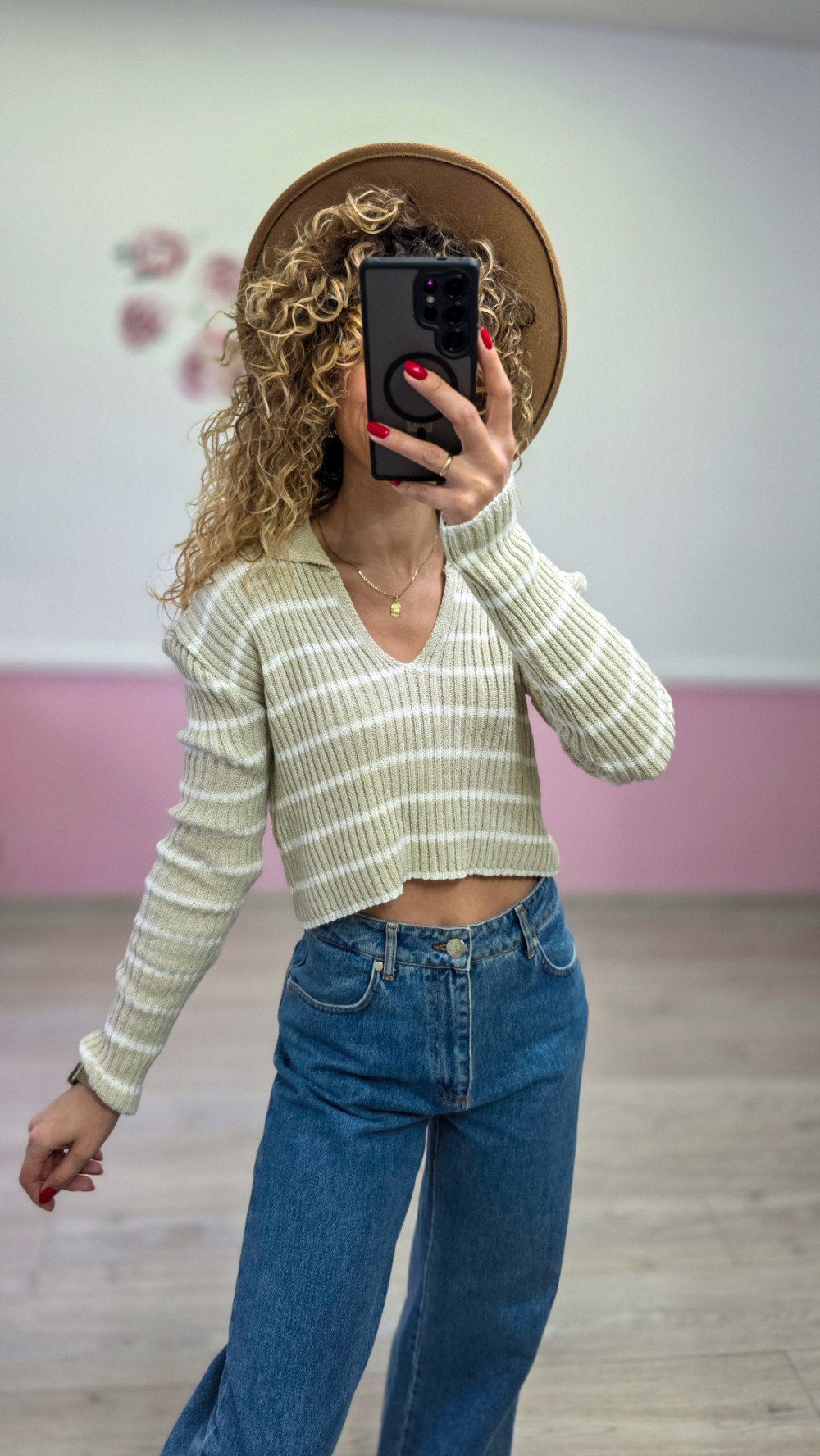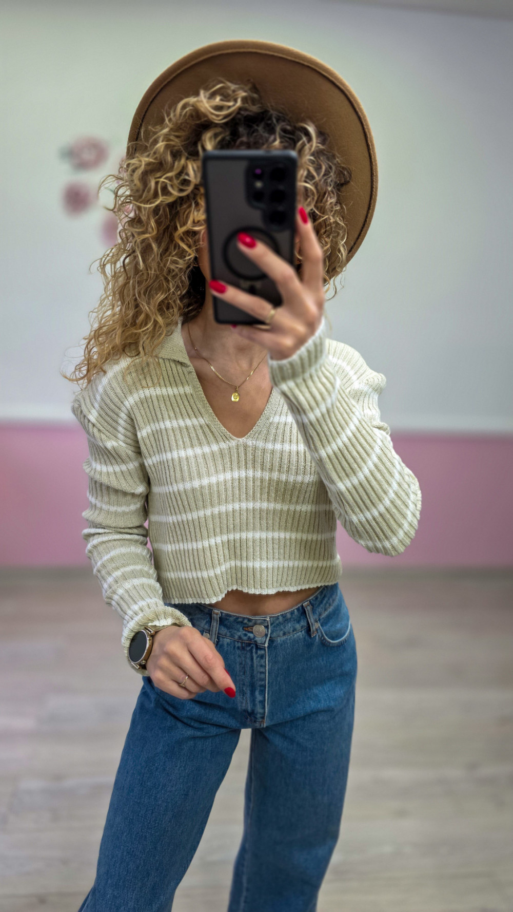 Beżowy prążkowany sweter crop z kołnierzykiem