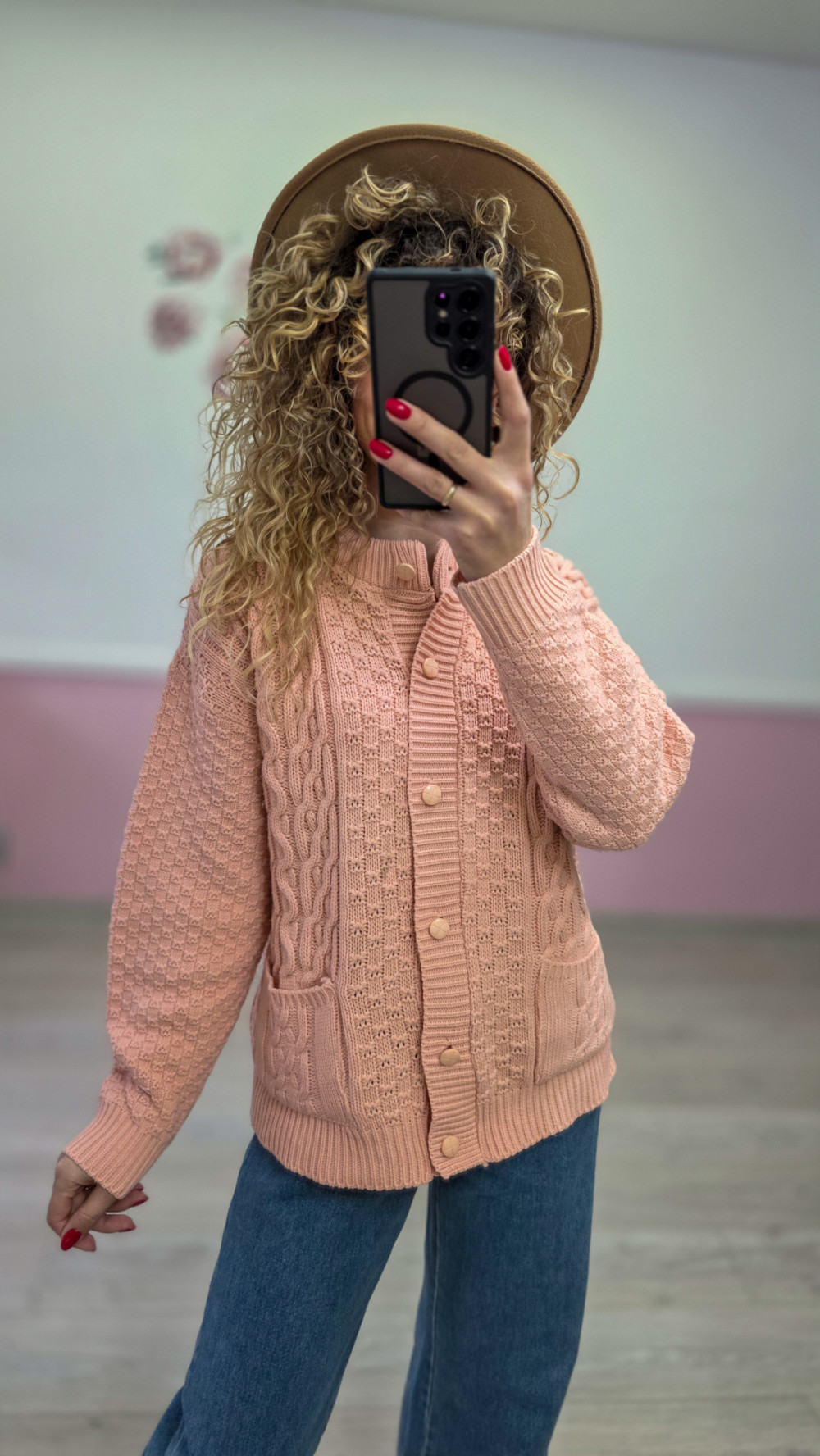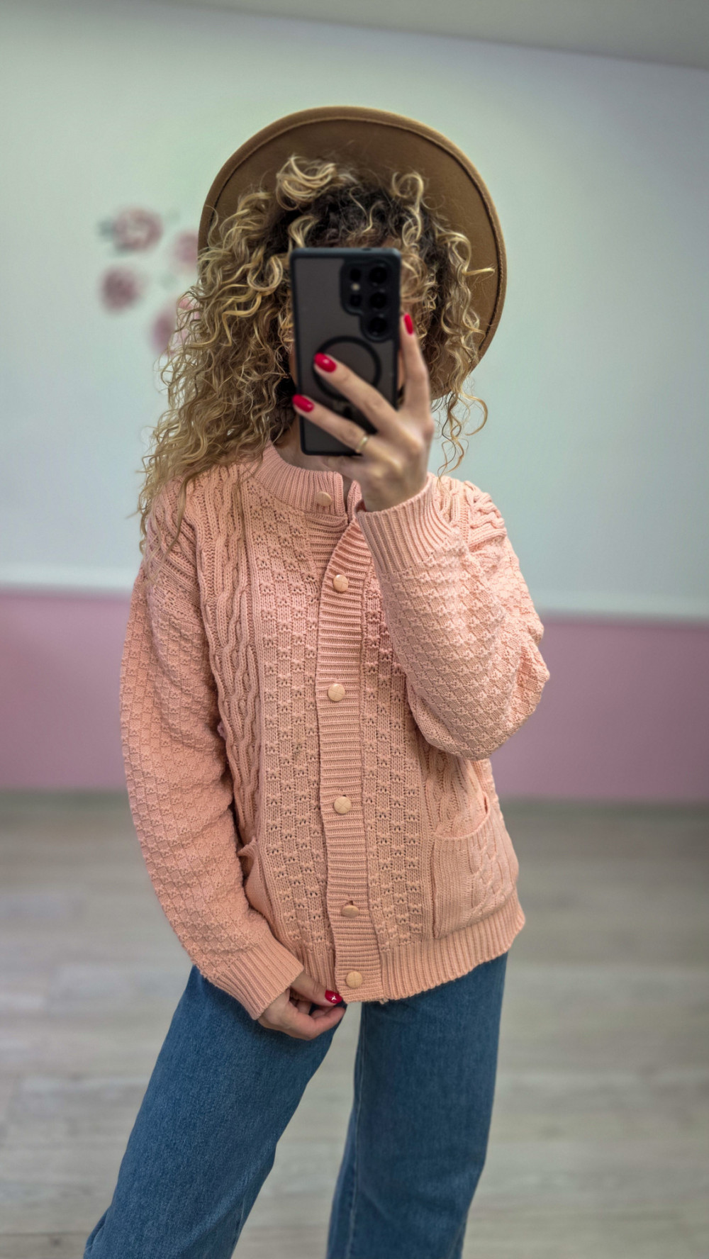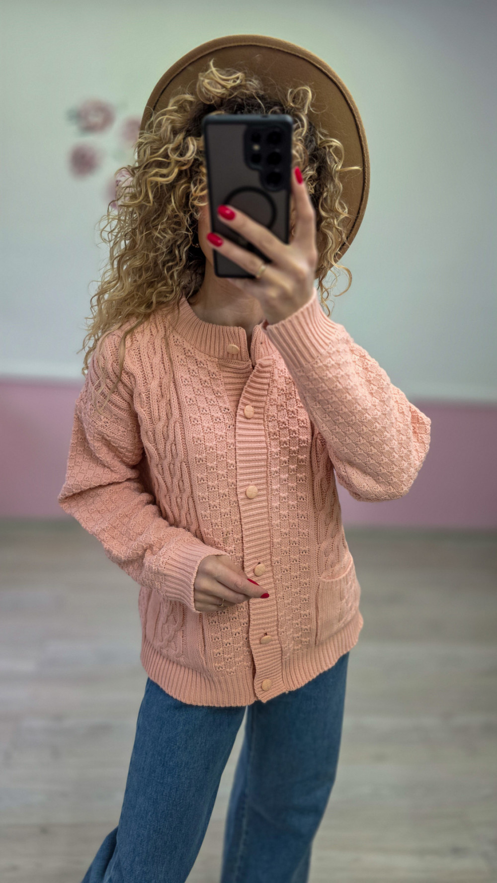 Brzoskwiniowy kardigan o ozdobnym splocie