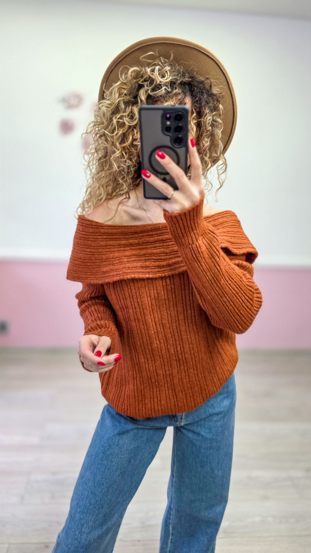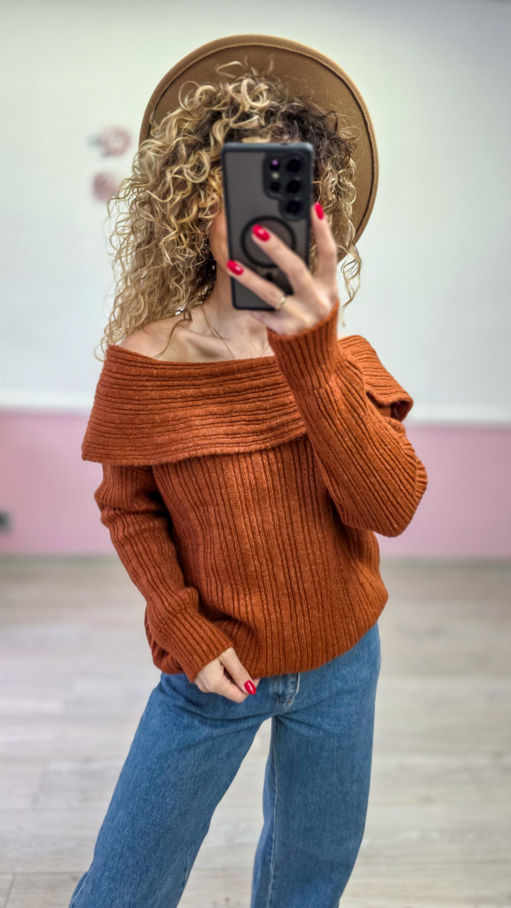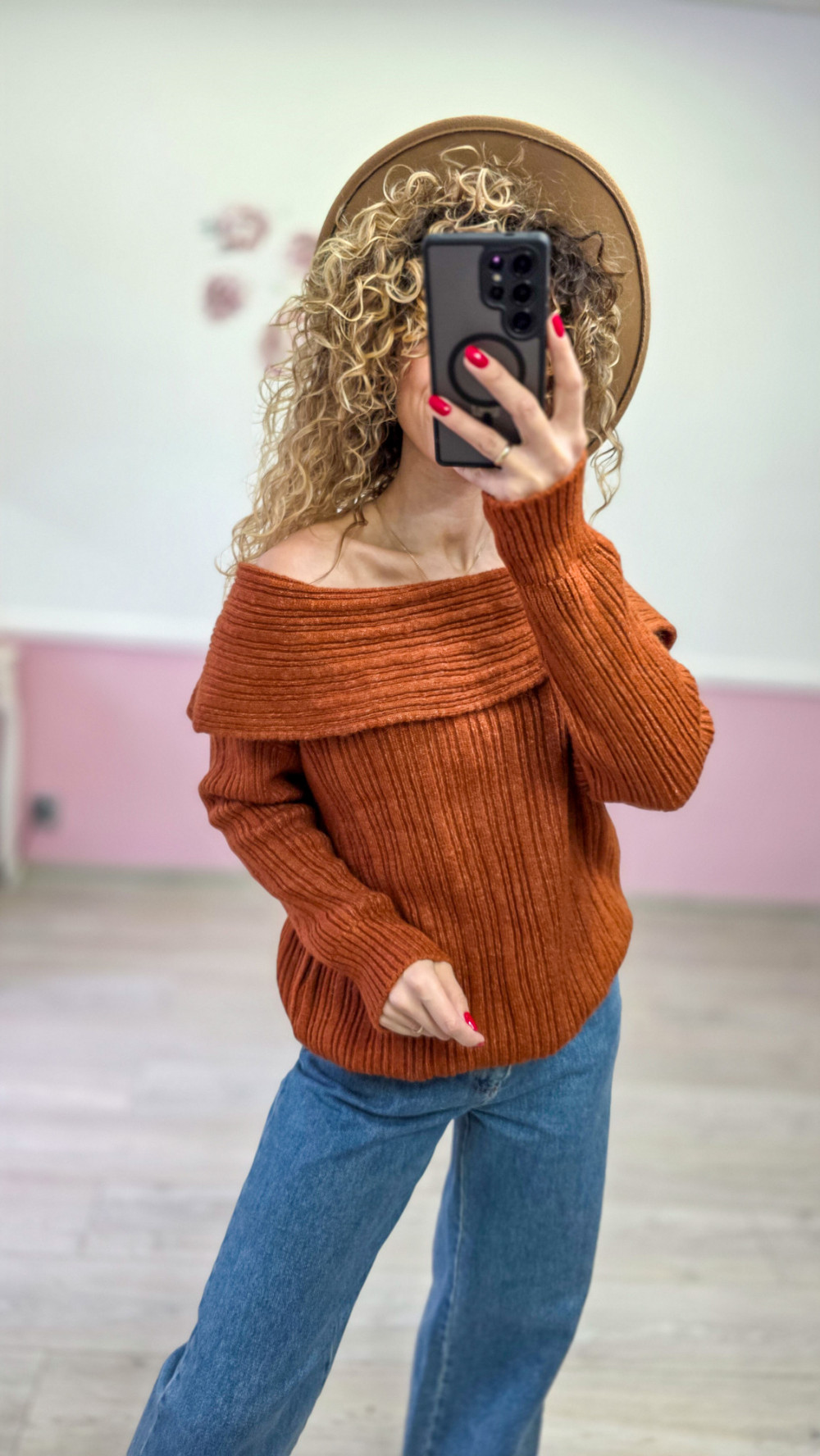 Sweter hiszpanka w kolorze karmelowym – idealny wybór na jesień i zimę. Model z szerokim, opadającym kołnierzem pięknie podkreśla ramiona i dodaje kobiecego charakteru każdej stylizacji. Wykonany z miękkiej, przyjemnej w dotyku dzianiny o prążkowanej strukturze, zapewnia komfort noszenia przez cały dzień.