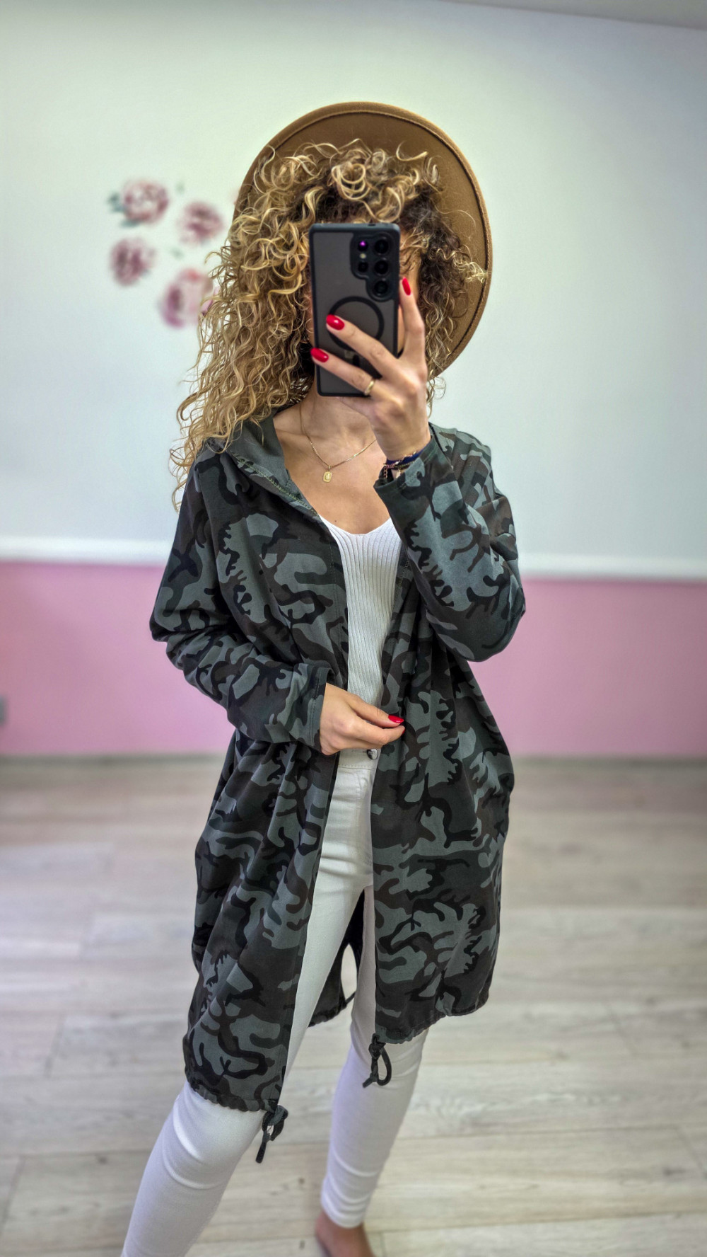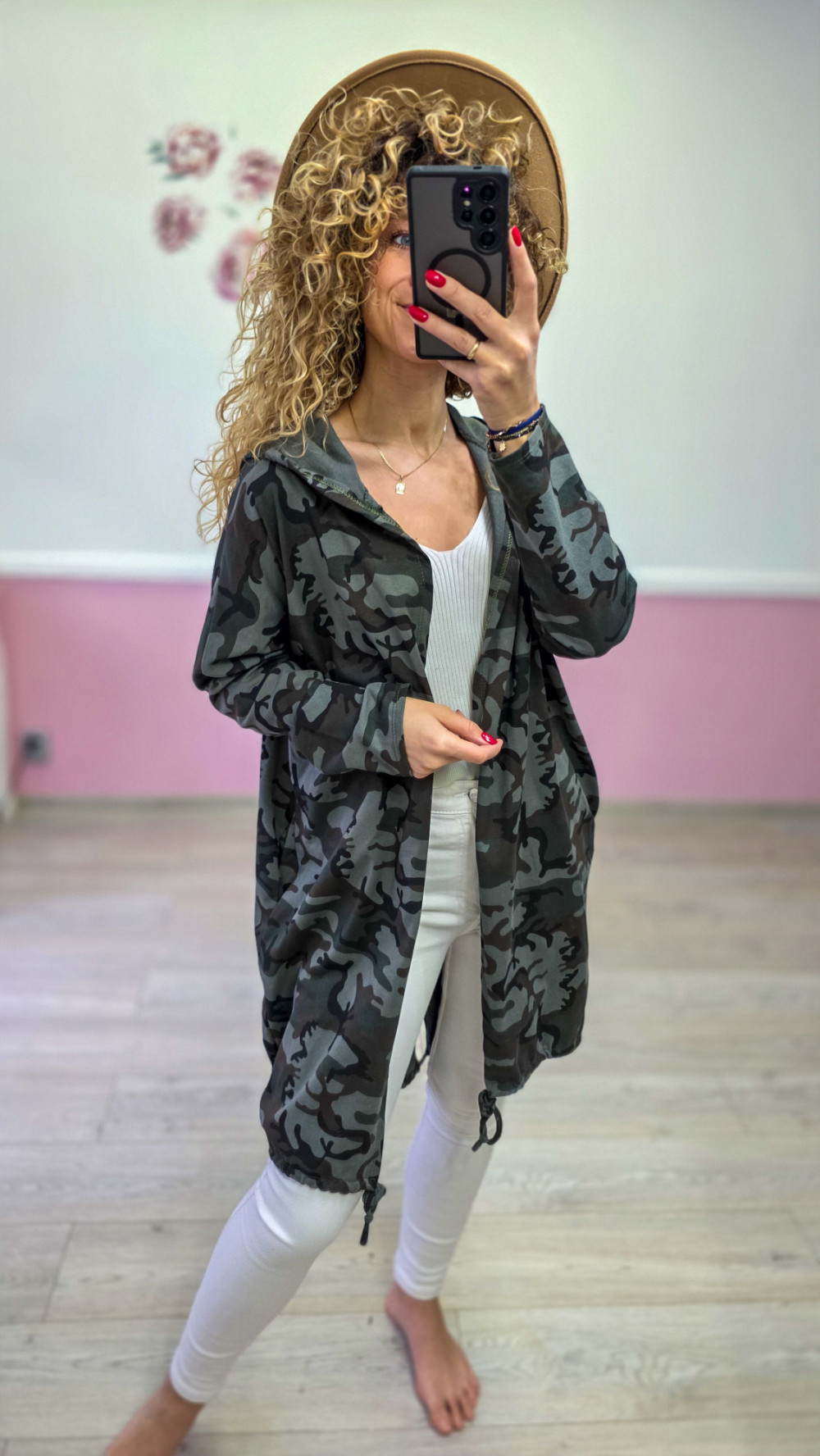 Dłuższa bluza damska w modny wzór moro, wykonana z miękkiego, wygodnego materiału. Model posiada kaptur, przedłużony krój oraz regulowane troczki na dole, dzięki czemu można swobodnie dopasować jej fason. Z przodu klasyczna, minimalistyczna – a z tyłu robi prawdziwe wrażenie: duże, błyszczące cekinowe skrzydła nadają jej wyjątkowego, stylowego charakteru.