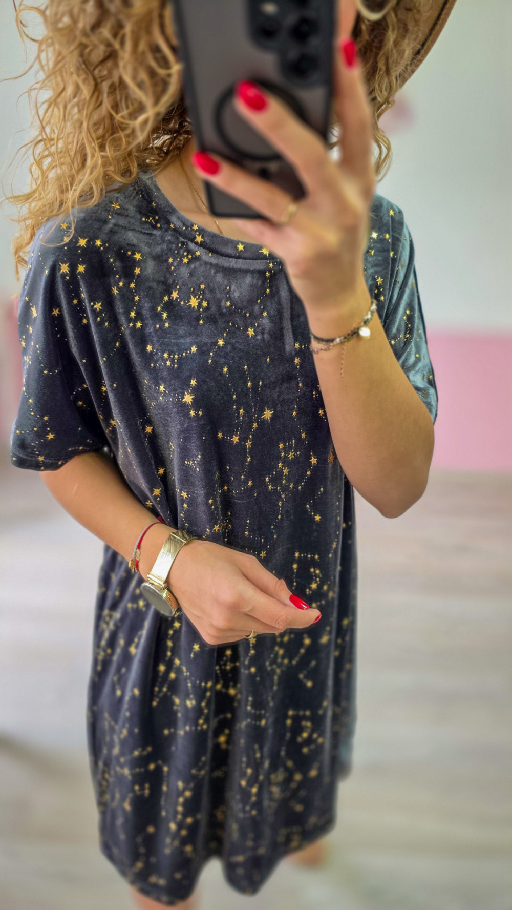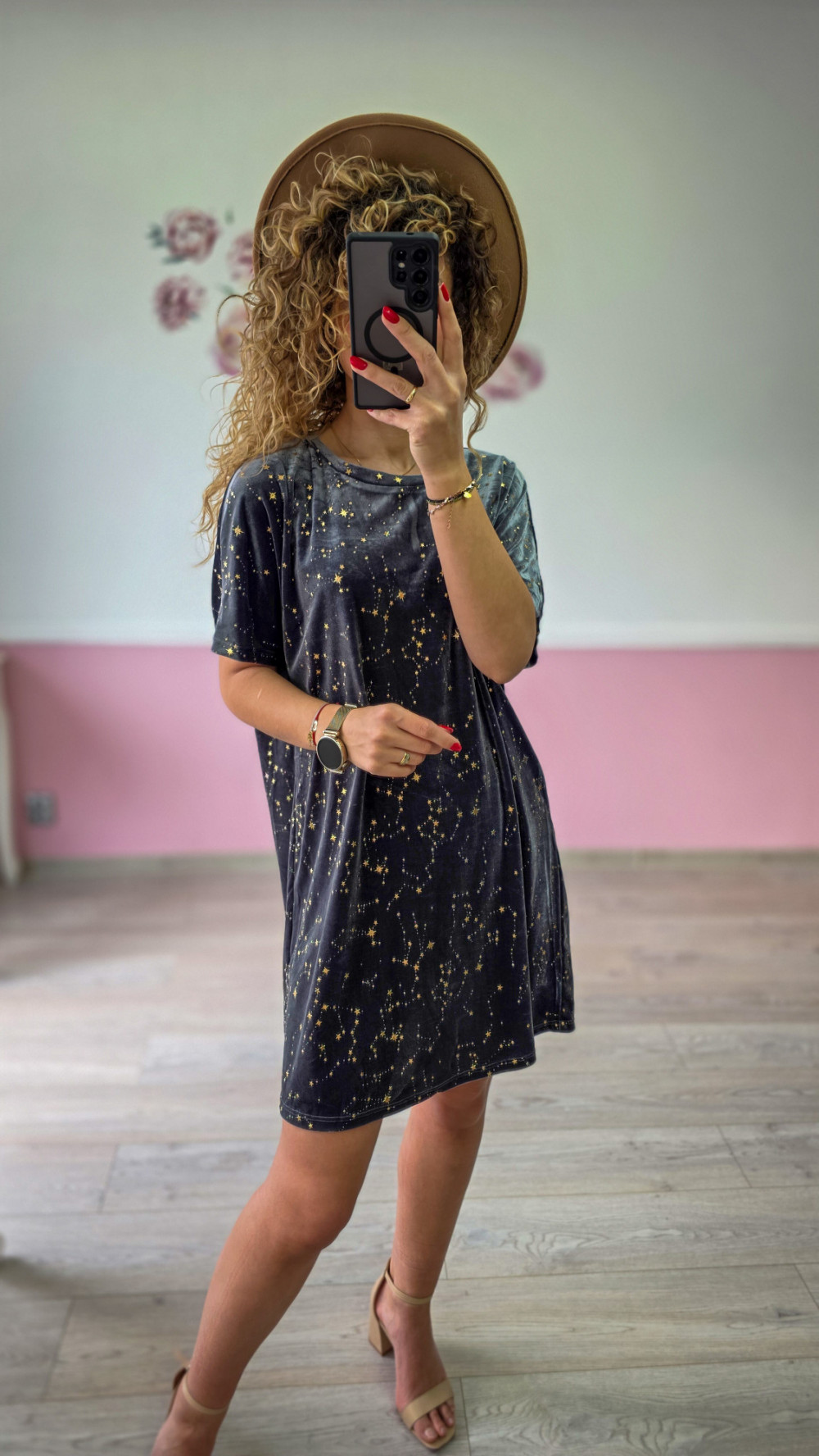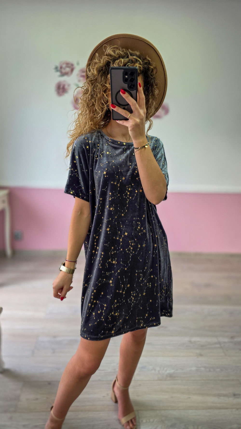 Szara sukienka oversize ze złotym motywem gwiazd