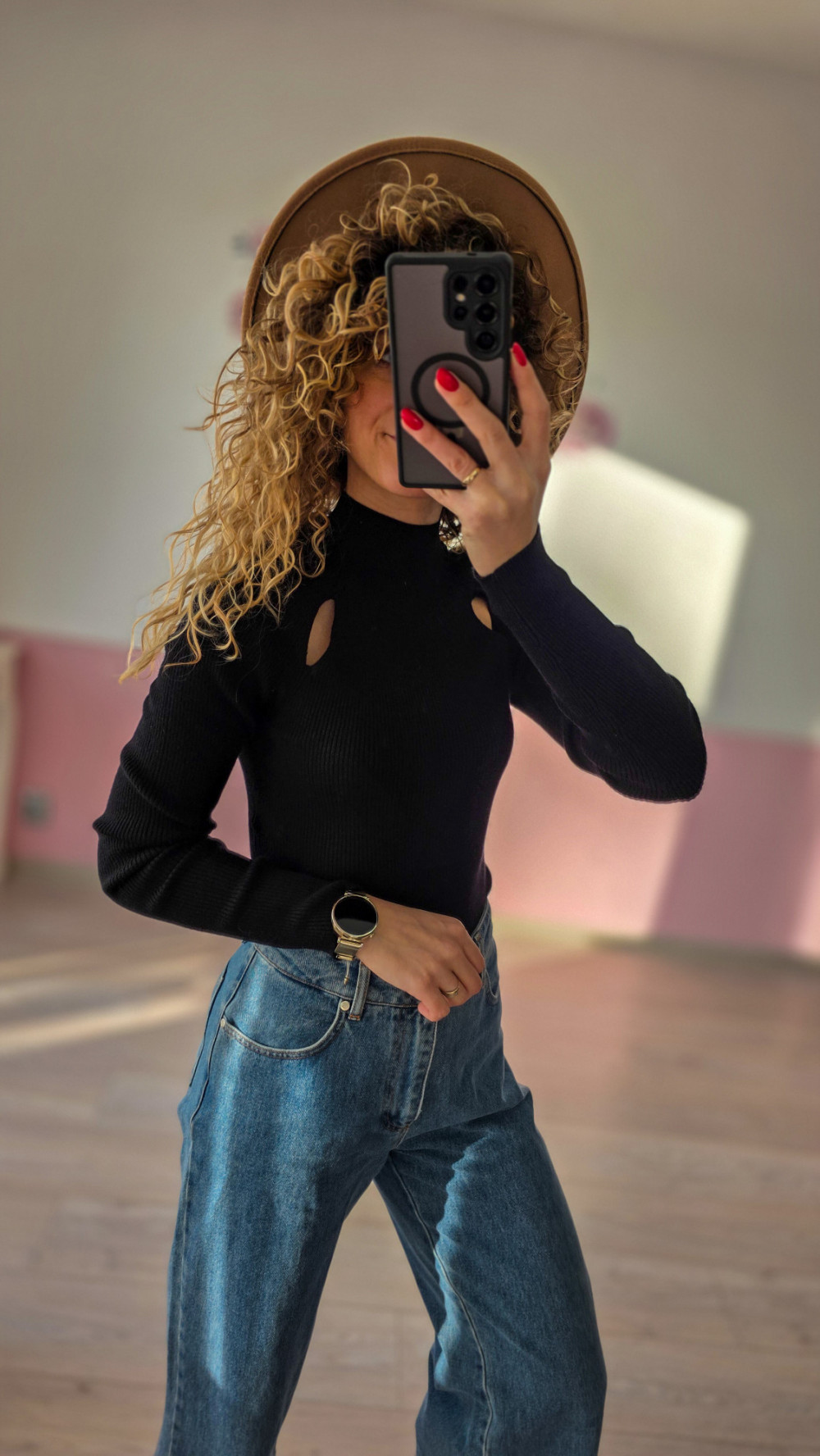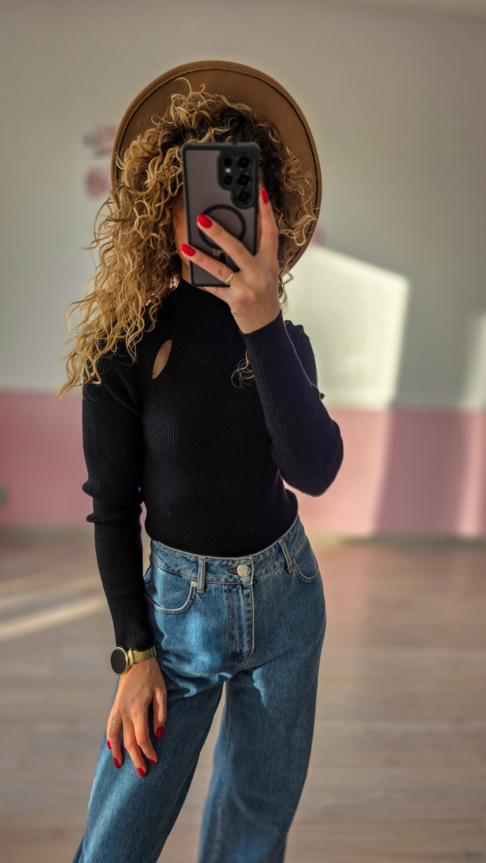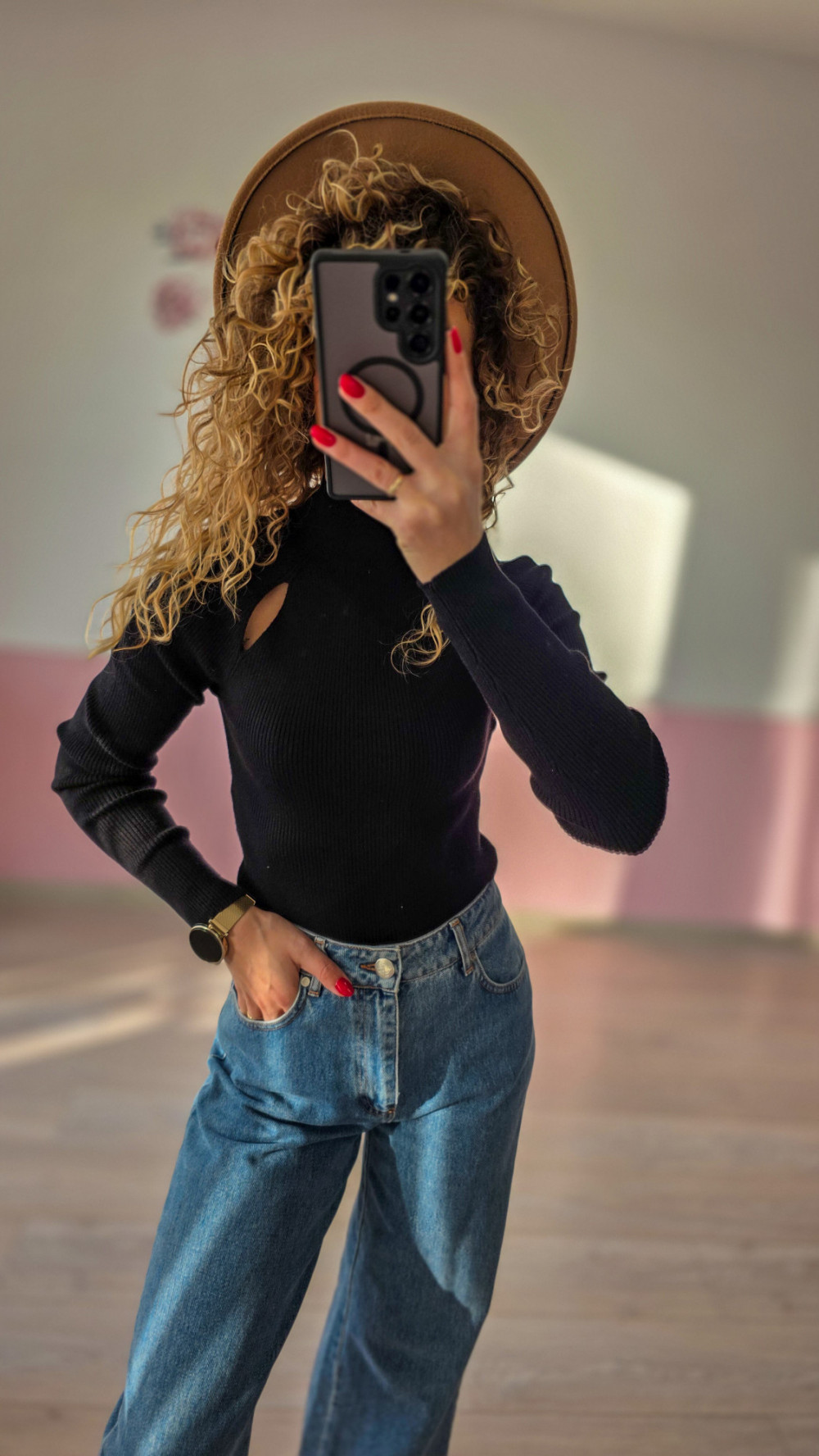 Czarny prążkowany sweter z ozdobnym wycięciem przy dekolcie to idealny wybór dla kobiet, które lubią modę z charakterem. Elastyczny materiał dopasowuje się do sylwetki, podkreśla talię i jest bardzo wygodny w noszeniu. Minimalistyczny krój przełamany subtelnym wycięciem dodaje całości nowoczesnego, kobiecego stylu. Doskonały do jeansów, spódnic i eleganckich stylizacji — świetnie sprawdzi się na co dzień, do pracy czy na wieczorne wyjścia.