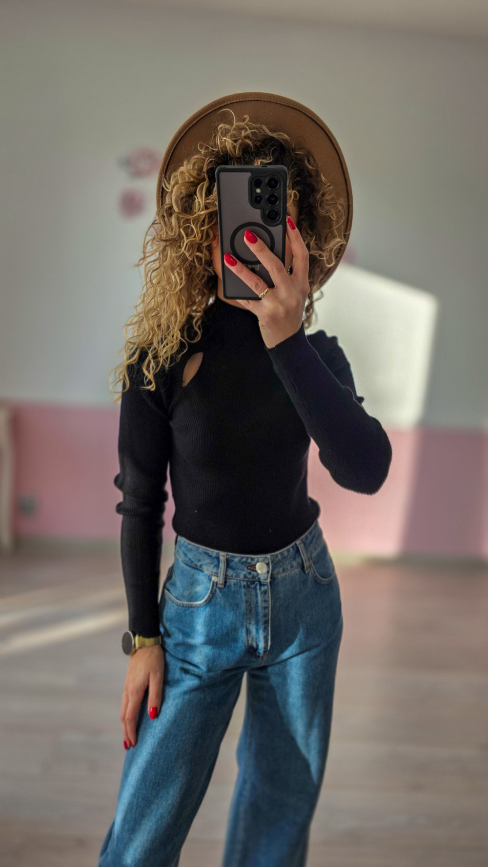 Czarny prążkowany sweter z ozdobnym wycięciem — kobiecy i nowoczesny - wiskoza
