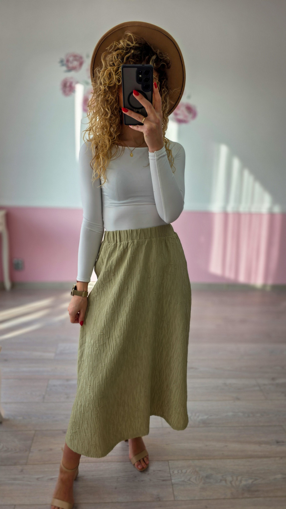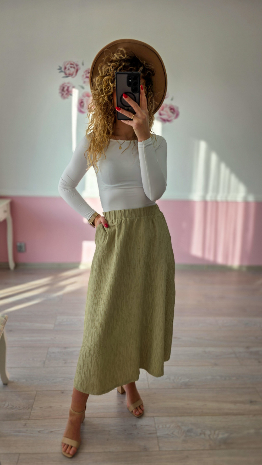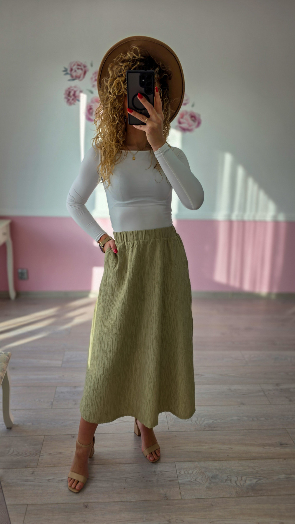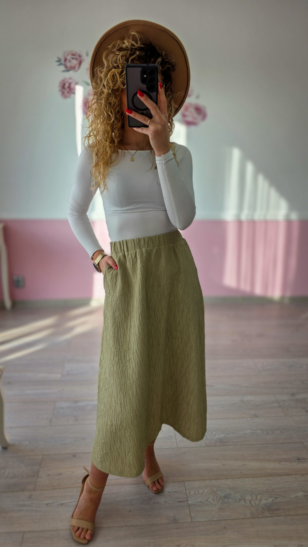 Oliwkowa rozkloszowana spódnica to stylowa propozycja dla kobiet, które lubią elegancję w lekkim, nowoczesnym wydaniu. Jej delikatnie rozszerzany fason pięknie podkreśla talię i nadaje sylwetce zwiewności, tworząc kobiecy i harmonijny look. Odcień oliwki doskonale komponuje się z neutralnymi kolorami, dzięki czemu spódnica jest bardzo uniwersalna i łatwa do stylizacji. Wykonana z przyjemnego materiału, zapewnia komfort noszenia i świetnie układa się na ciele. Idealna na co dzień, do pracy, na spacery i wyjścia w ciepłe dni.