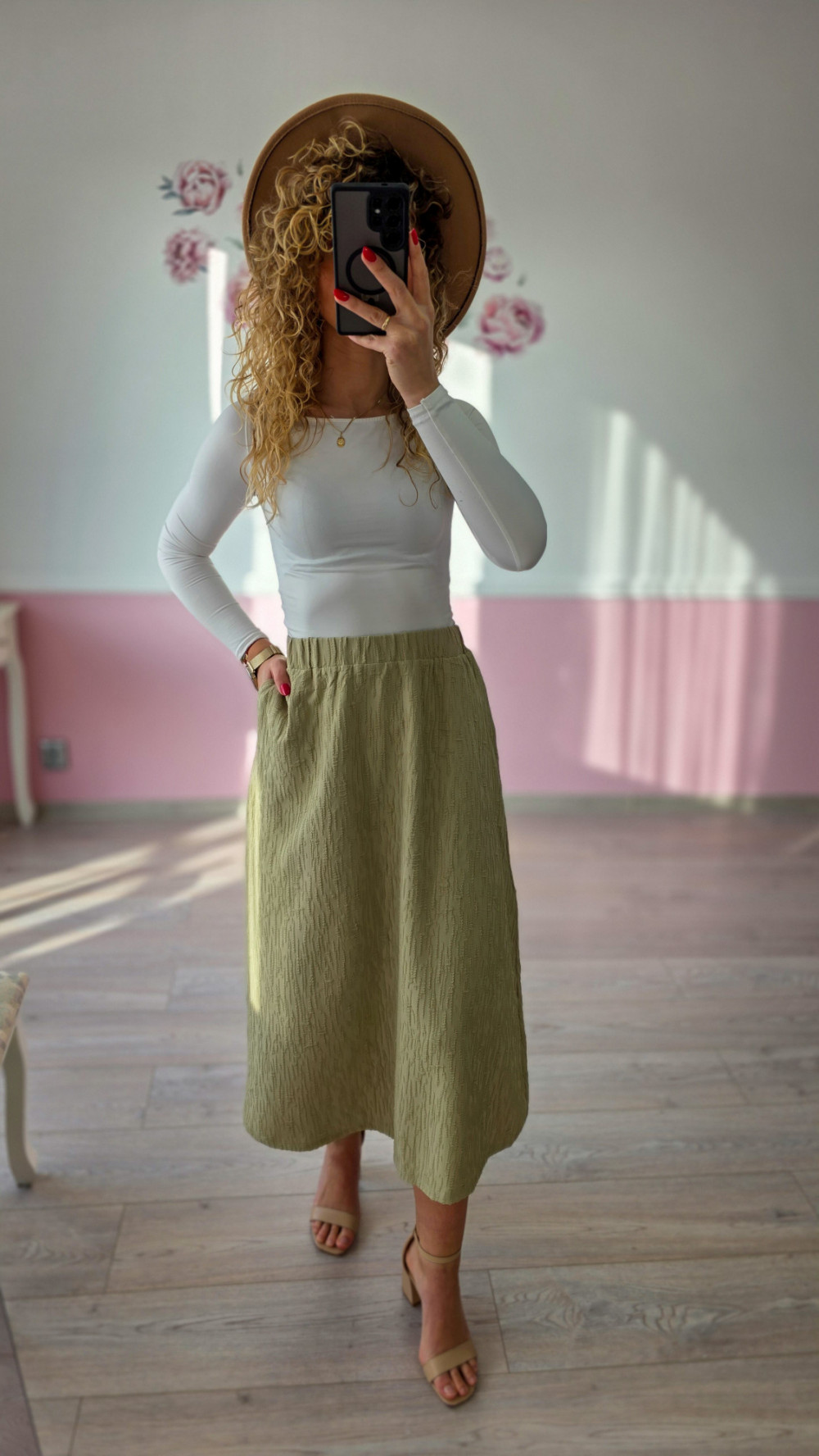 Oliwkowa rozkloszowana spódnica – kobieca, lekka i modna s/m