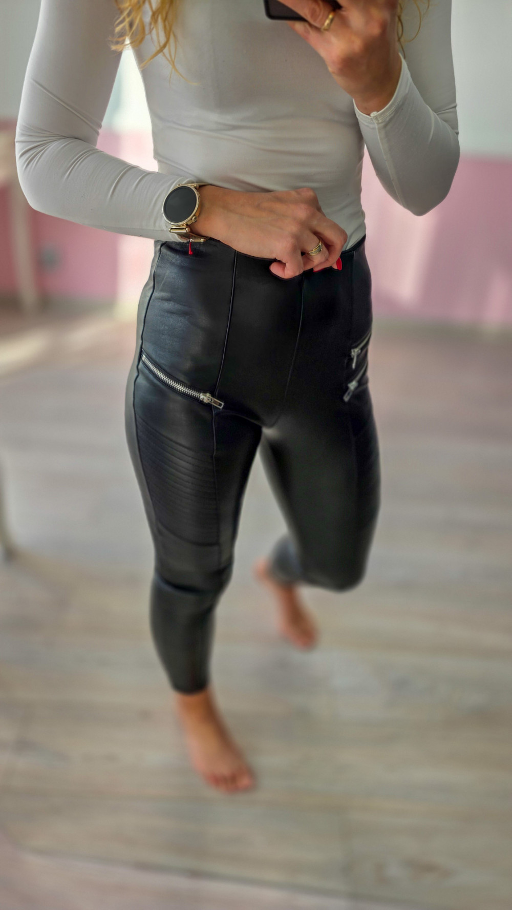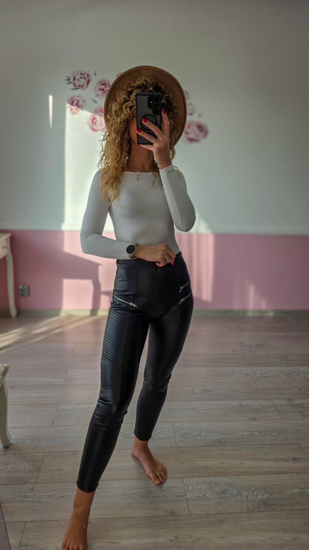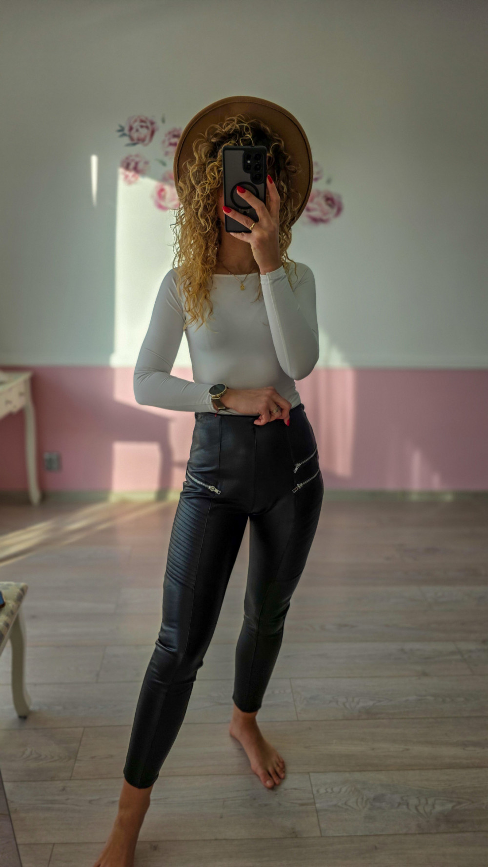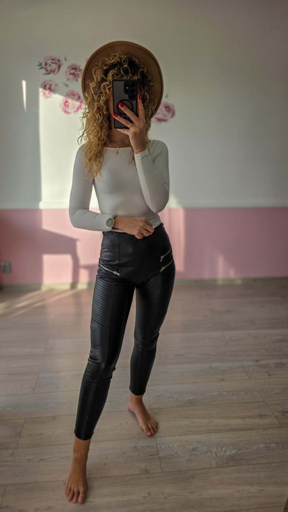 Czarne spodnie z ekoskóry z zamkami po bokach – eleganckie damskie spodnie