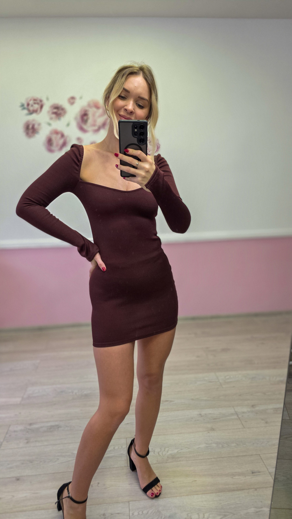 Postaw na kobiecość, która robi wrażenie! Bordowa dopasowana sukienka z dekoltem typu square neckline pięknie podkreśla ramiona i wysmukla sylwetkę. Miękki, elastyczny materiał idealnie dopasowuje się do ciała, zapewniając komfort noszenia i efekt „second skin”. Długie rękawy oraz minimalistyczny fason sprawiają, że to model idealny zarówno na wieczorne wyjście, jak i romantyczną kolację.