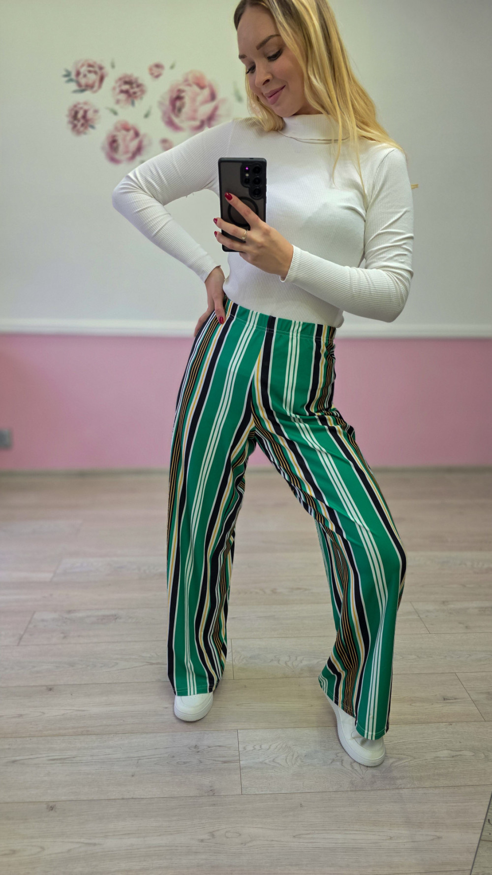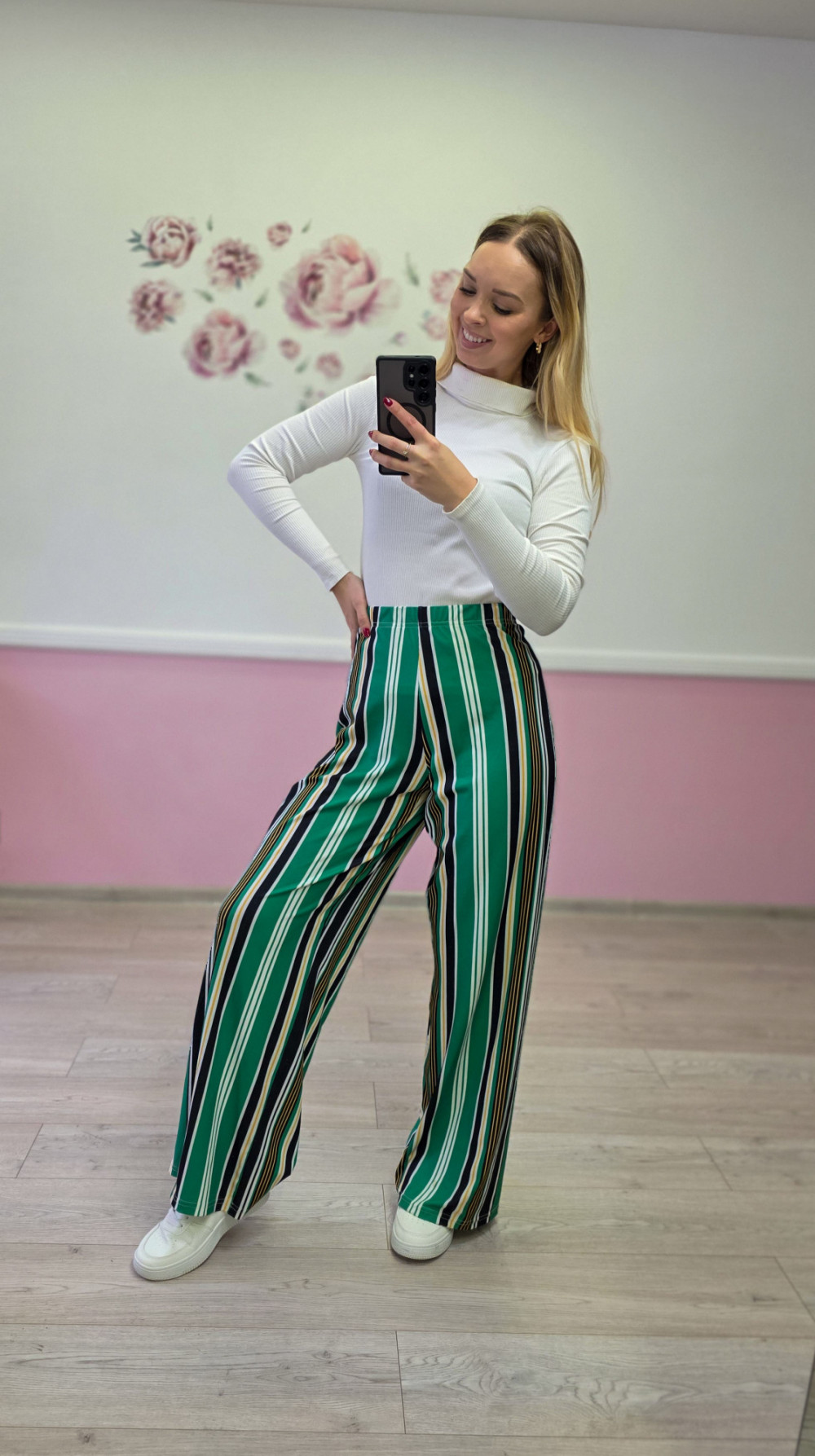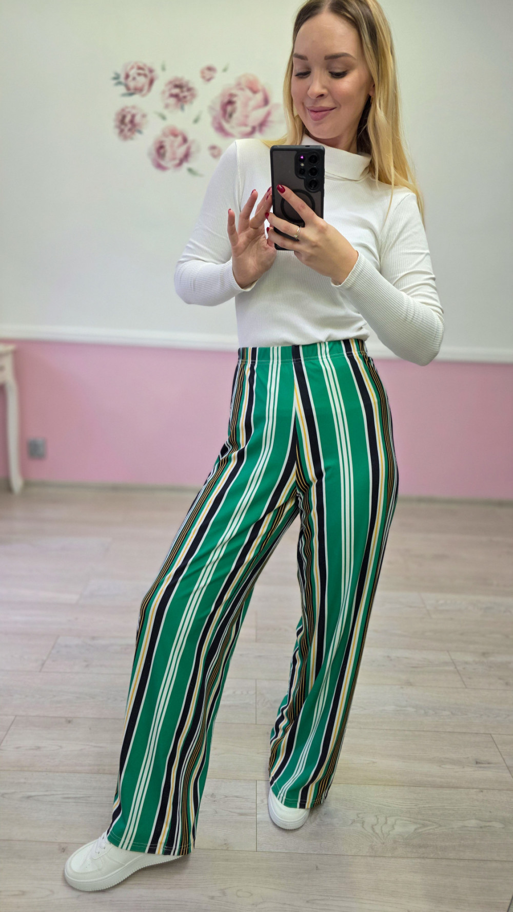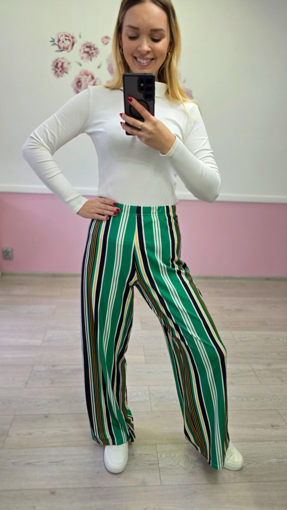 Zielone spodnie w pionowe paski – szerokie nogawki