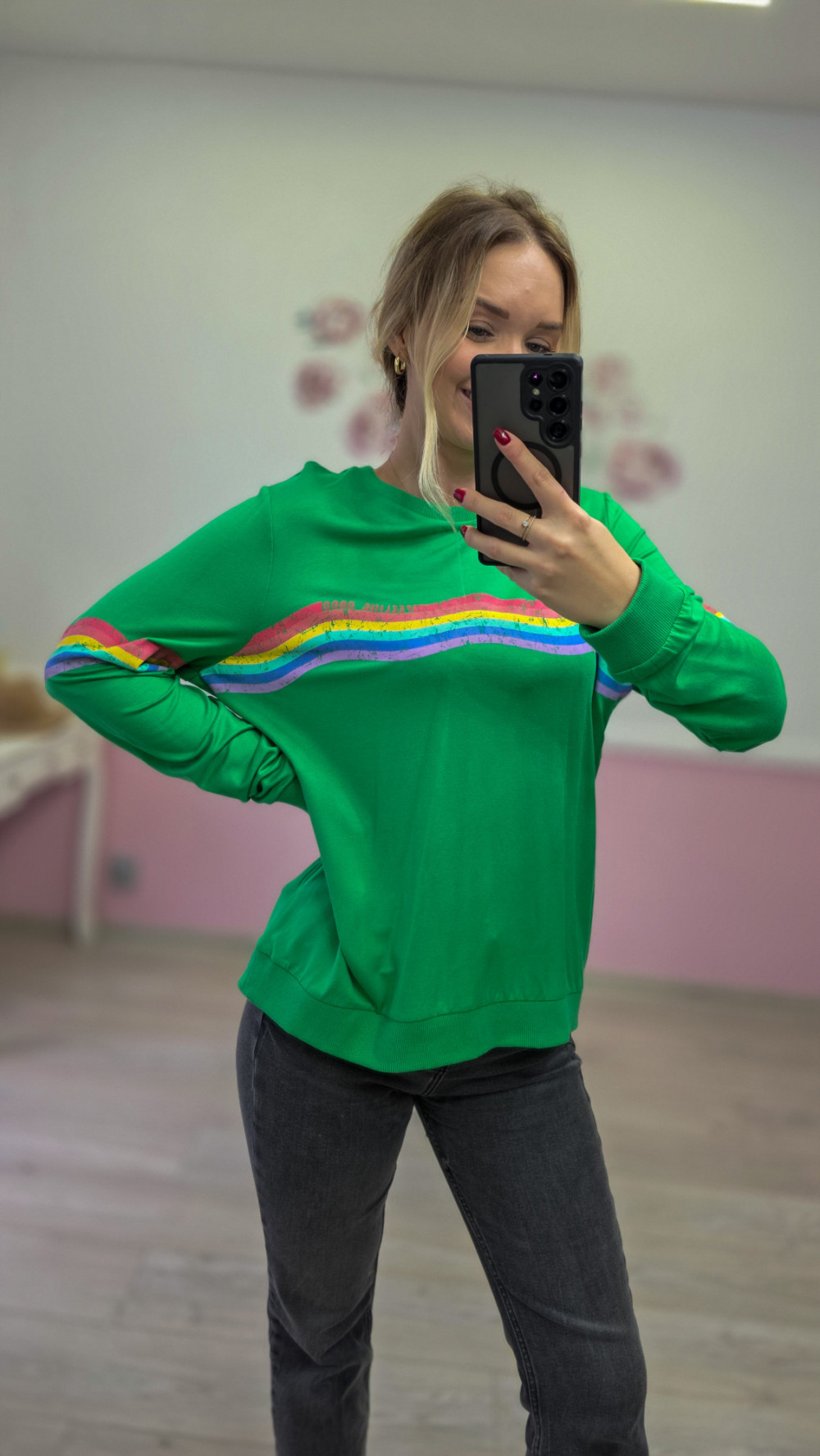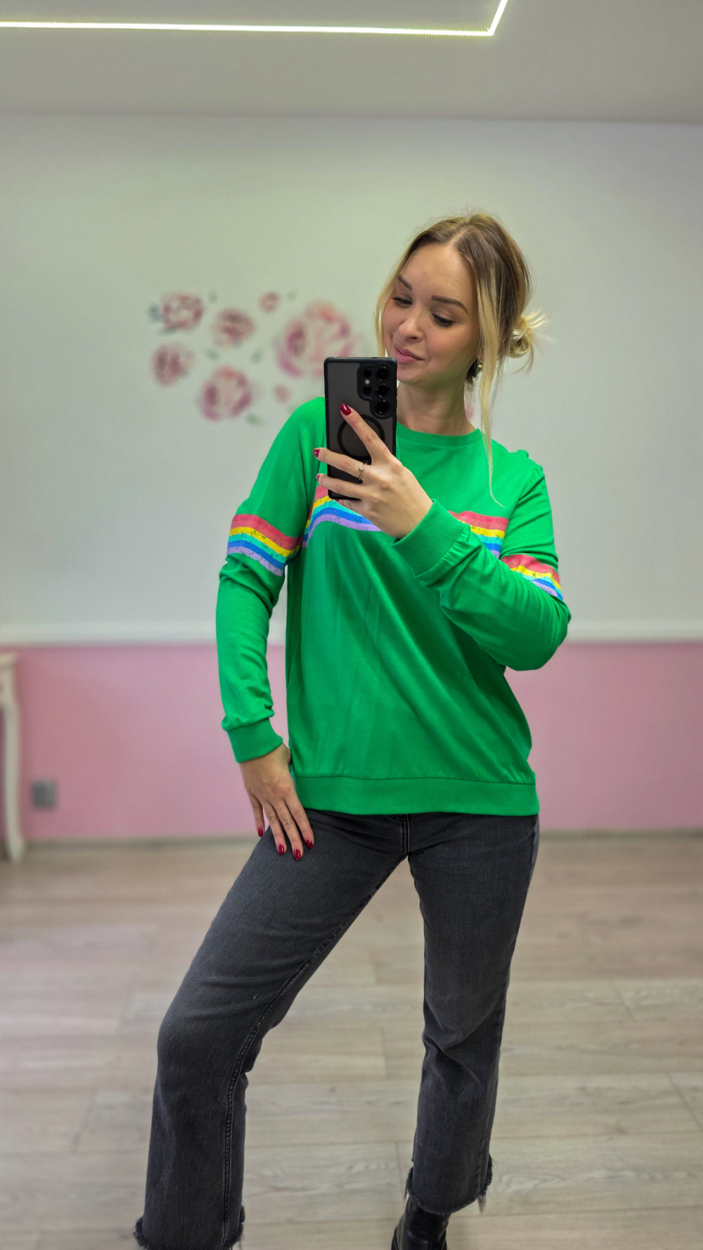 Zielona bluza z kolorowymi, tęczowymi pasami to energetyczny element garderoby, który ożywi każdą stylizację. Wykonana z miękkiej, elastycznej dzianiny zapewnia maksymalny komfort noszenia. Klasyczny krój z okrągłym dekoltem sprawdzi się zarówno do jeansów, jak i sportowych outfitów. Kolorowe pasy na rękawach dodają jej modnego, młodzieżowego charakteru.