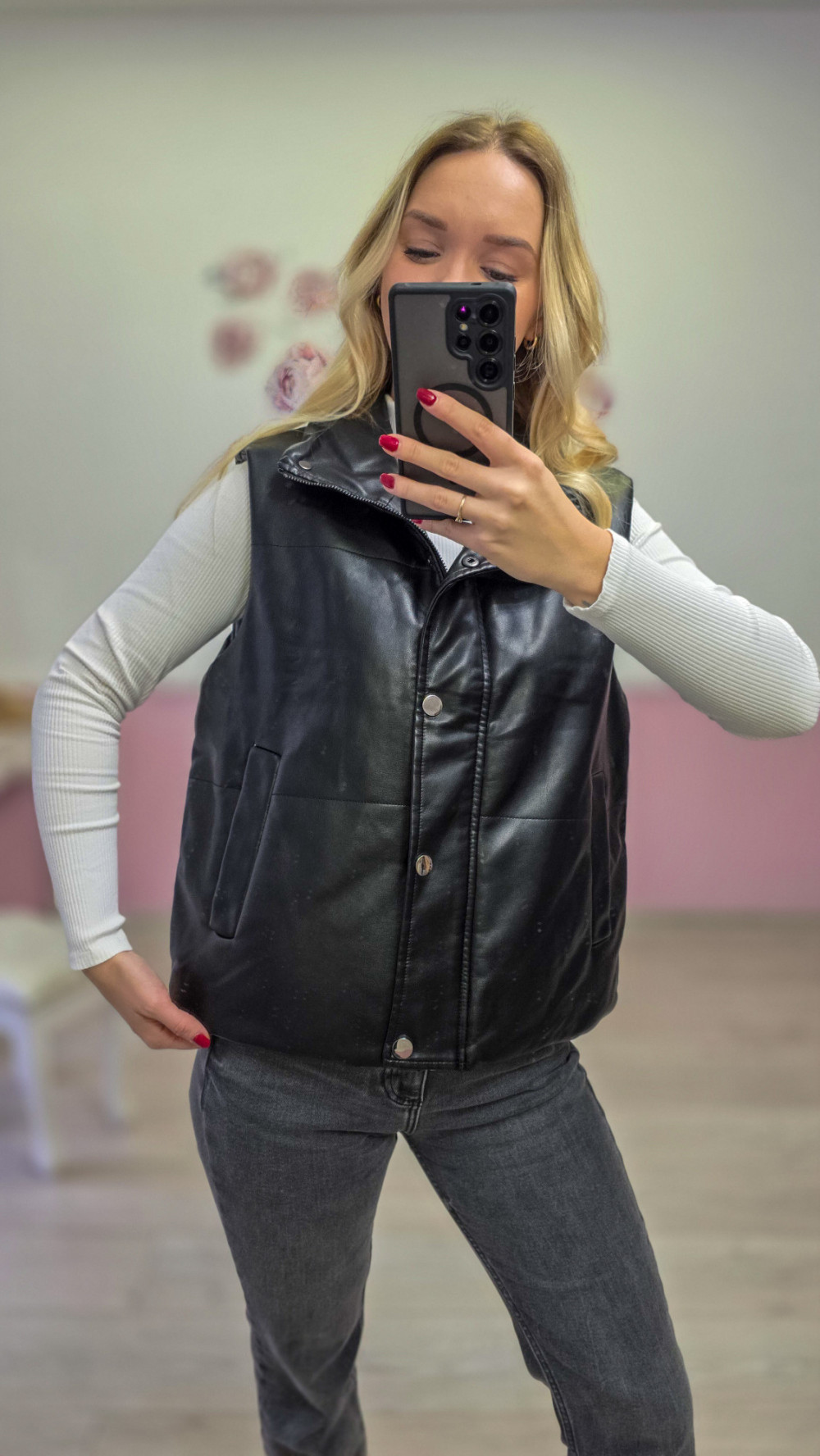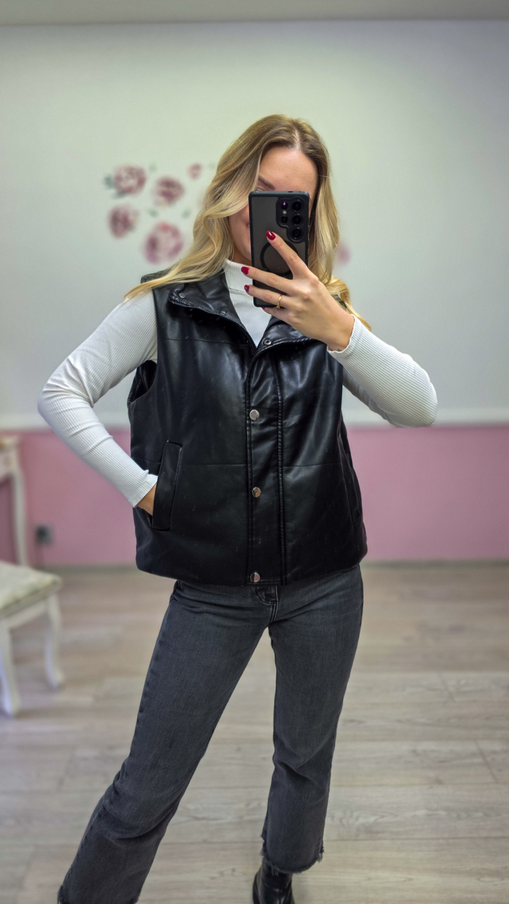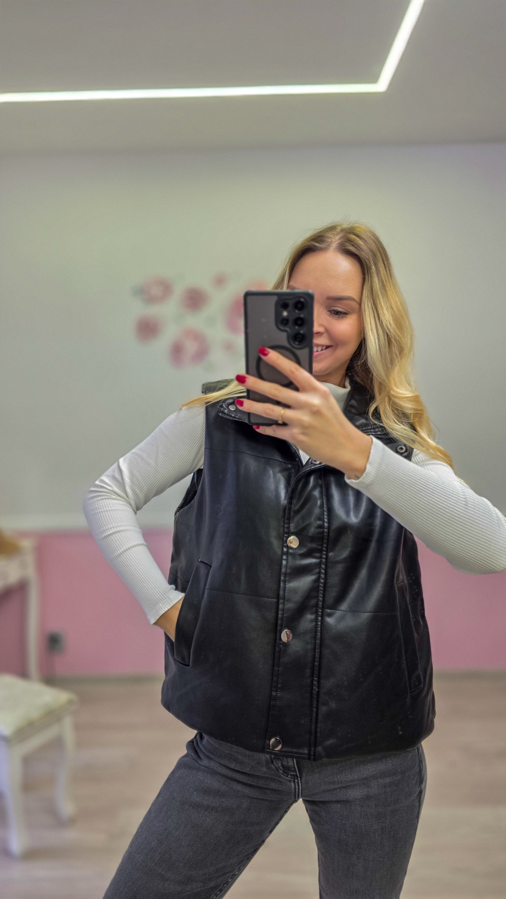 Czarna kamizelka z eko-skóry to ponadczasowy element garderoby, który świetnie podkreśla charakter stylizacji. Lekko ocieplany model sprawia, że kamizelka idealnie nadaje się na chłodniejsze dni, łącząc wygodę z modnym, rockowym akcentem. To doskonały wybór dla kobiet, które lubią funkcjonalne, a jednocześnie stylowe rozwiązania. Kamizelka dobrze komponuje się z golfami, bluzami i casualowymi lookami, dodając im nowoczesnego wykończenia.