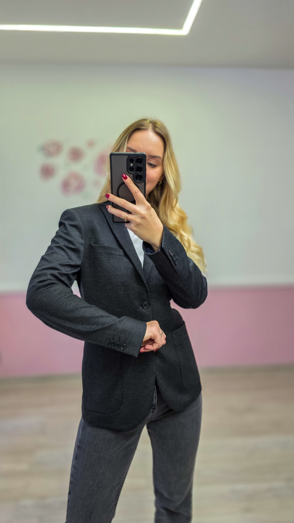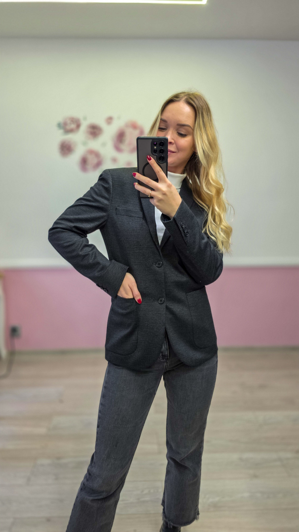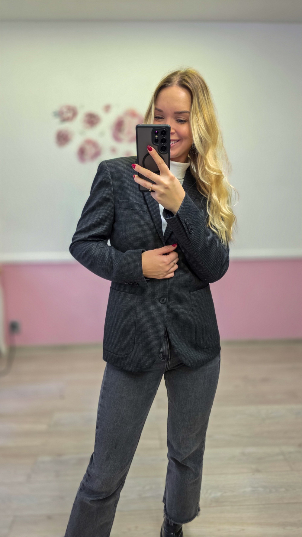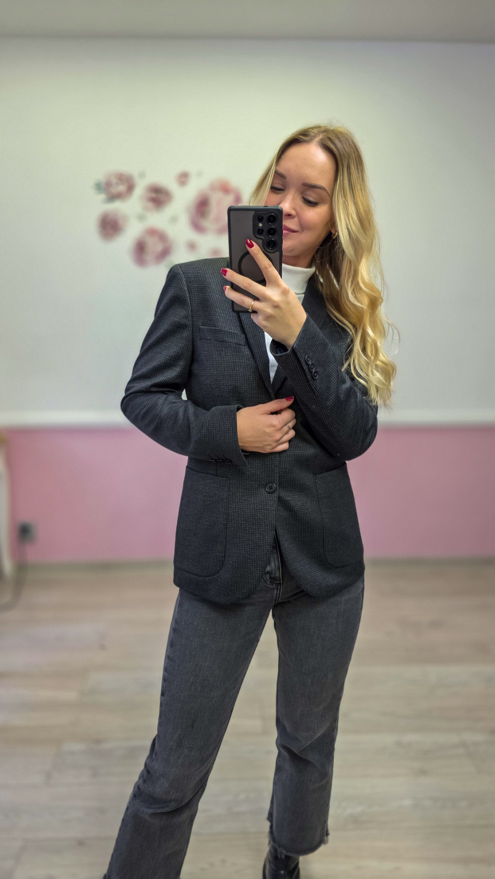 Grafitowa marynarka w delikatny, drobny wzór to klasyczna propozycja dla kobiet ceniących elegancję i ponadczasowy styl. Dopasowany krój pięknie podkreśla sylwetkę, a jednocześnie zapewnia wygodę podczas noszenia. Marynarka świetnie sprawdzi się zarówno w stylizacjach biznesowych, jak i codziennych — można łączyć ją z jeansami, klasyczną koszulą lub cienkim golfem. To uniwersalny model, który doda klasy każdemu outfitowi i idealnie wpisze się w garderobę na cały rok.