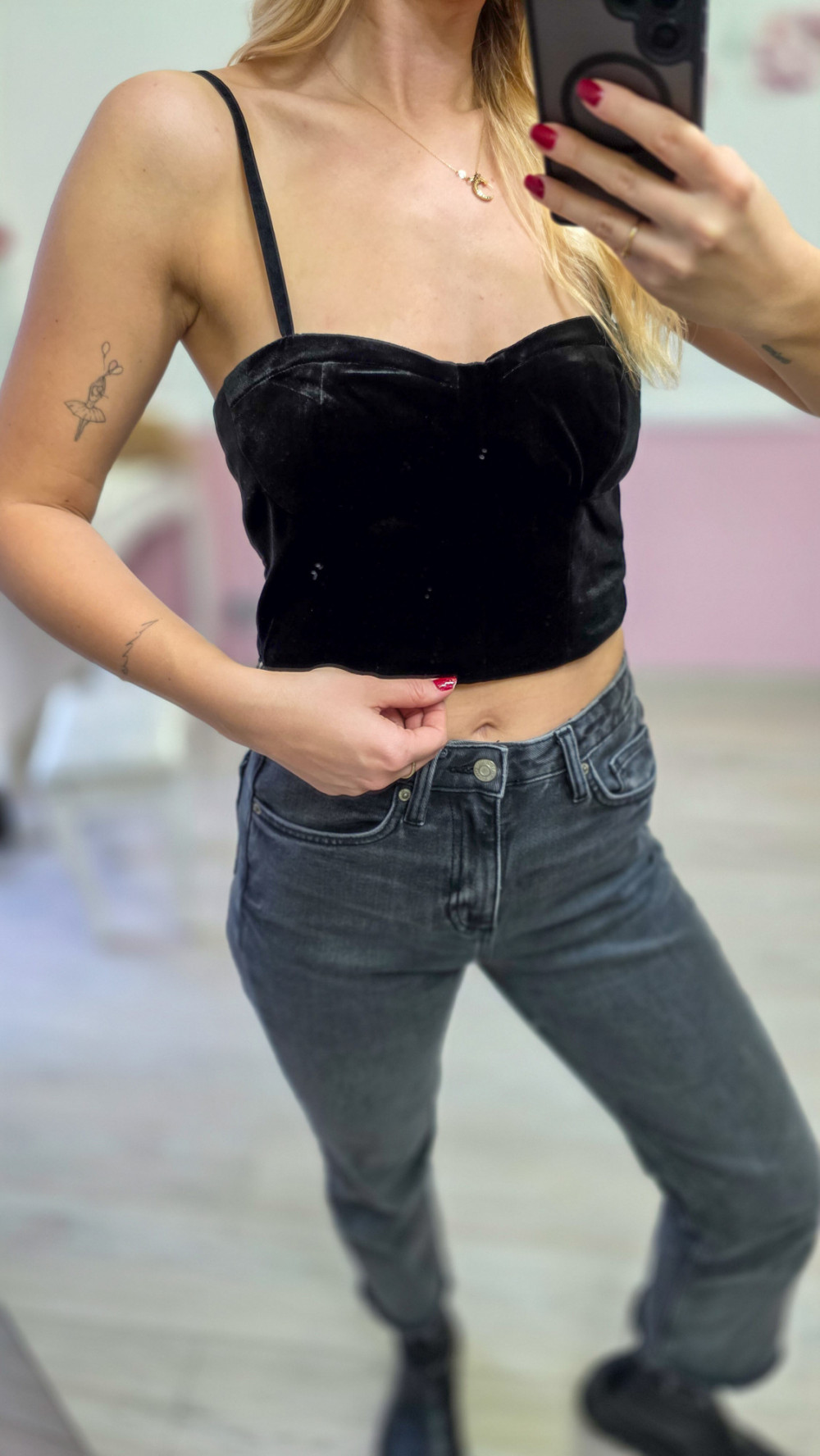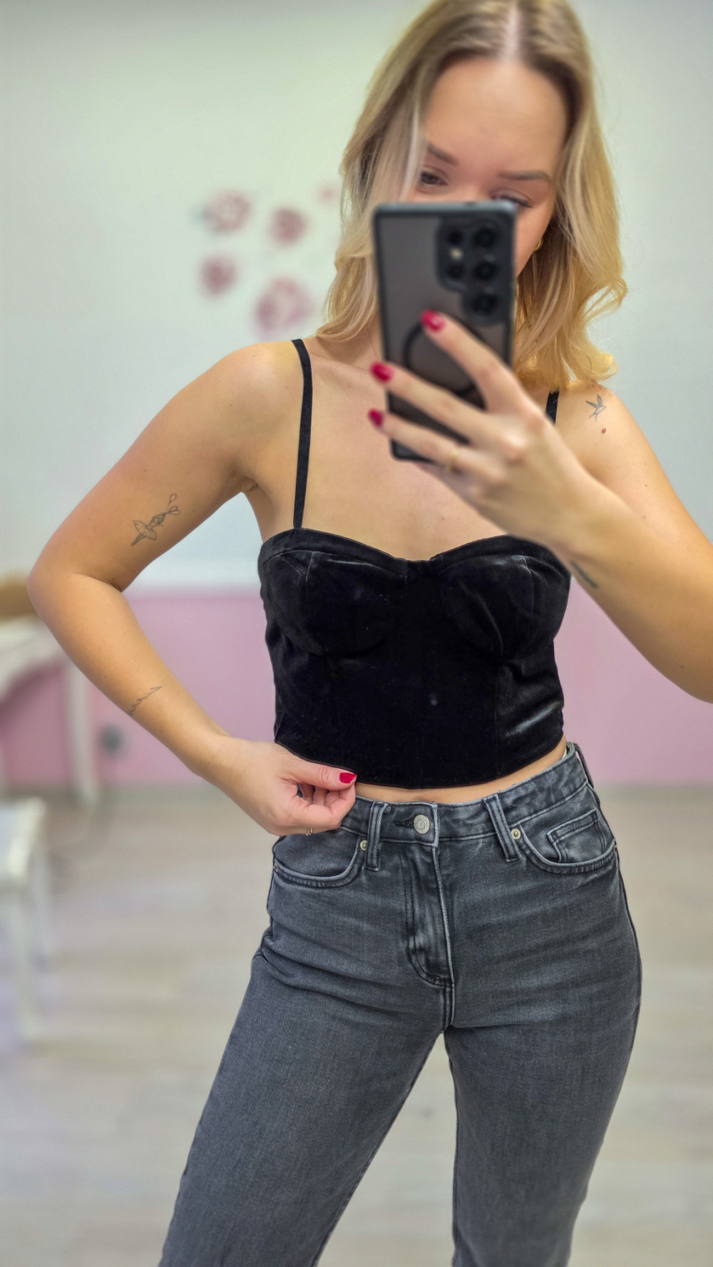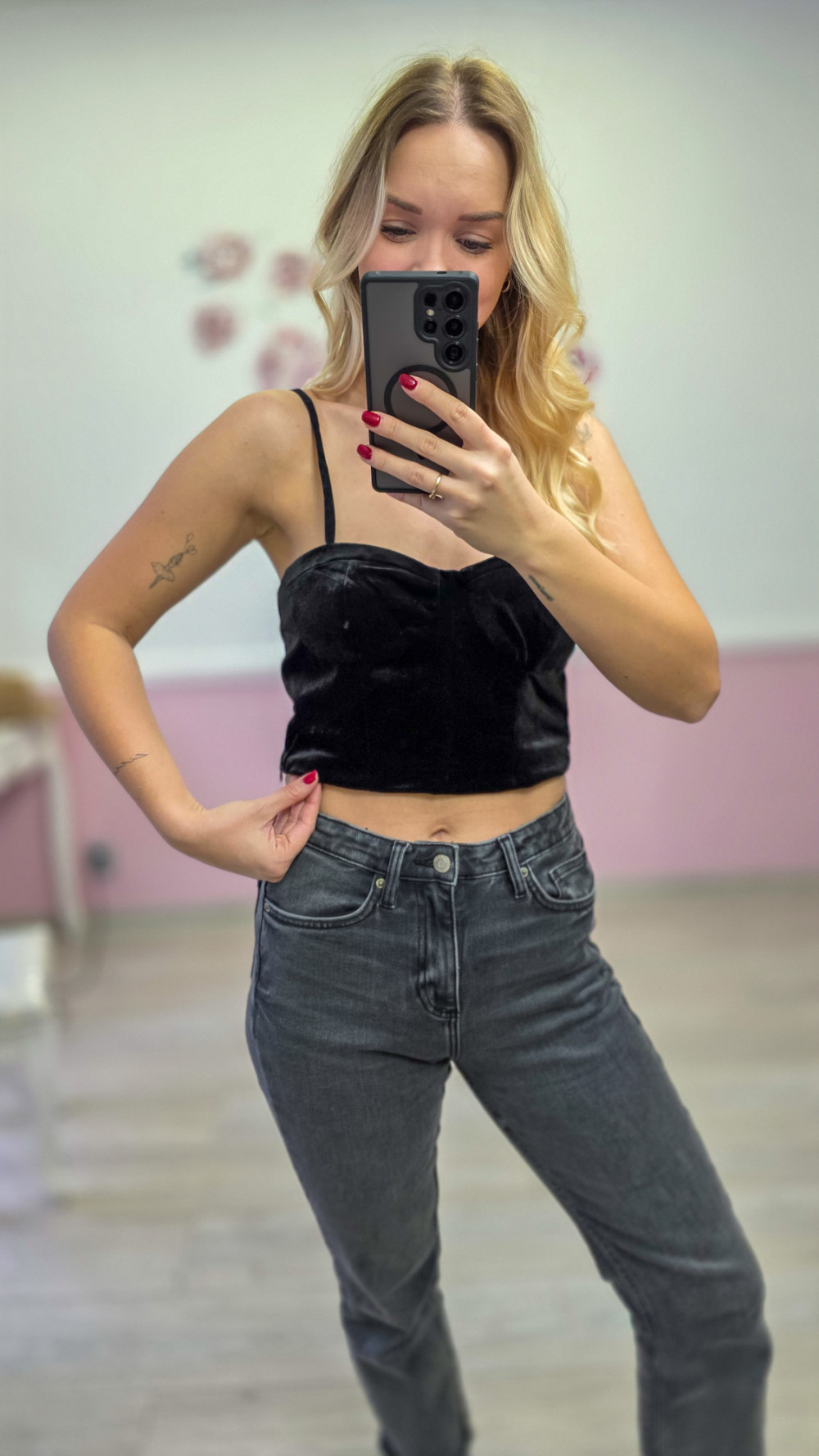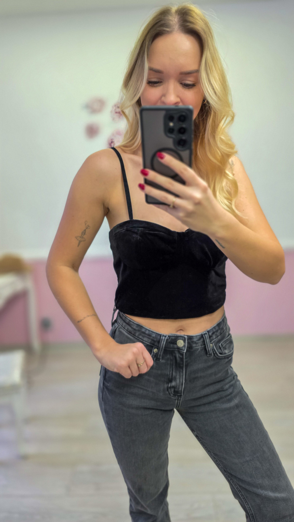 Czarny welurowy top na ramiączkach to wyjątkowo kobiecy i stylowy model, który świetnie sprawdzi się zarówno w codziennych stylizacjach, jak i podczas wieczornych wyjść. Miękki, lekko połyskujący welur pięknie prezentuje się na sylwetce, a dopasowany fason subtelnie podkreśla kształty. To idealna propozycja do marynarek, ramonesek lub samodzielnie — w zestawieniu z ulubionymi jeansami tworzy modny, nowoczesny look z nutą elegancji.