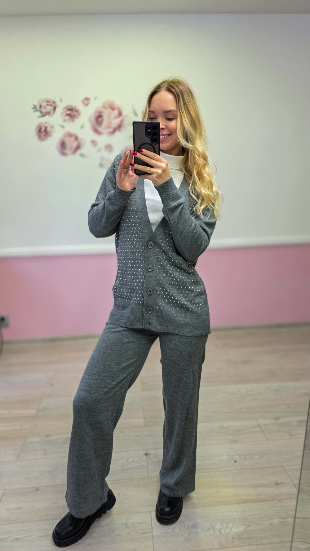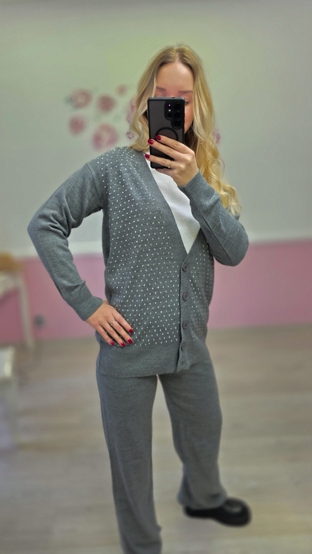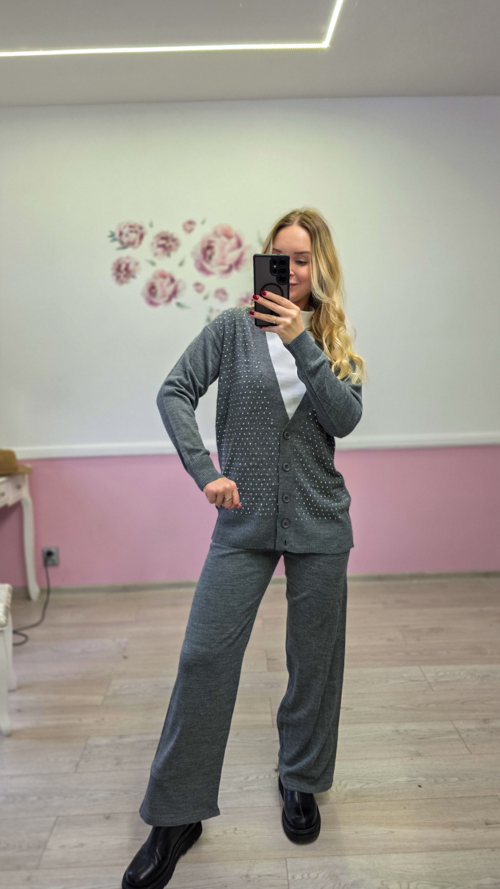 Szary komplet dzianinowy to wygodna i stylowa propozycja dla kobiet, które lubią komfort w połączeniu z modnym wyglądem. Miękka dzianina zapewnia przyjemne dopasowanie, a ozdobny sweter z delikatnym połyskiem nadaje całości subtelnej elegancji. Komplet świetnie sprawdzi się zarówno do codziennego noszenia, jak i na spokojne, domowe dni, oferując pełną swobodę ruchów. To praktyczny wybór, który można nosić razem lub łączyć z innymi elementami garderoby.