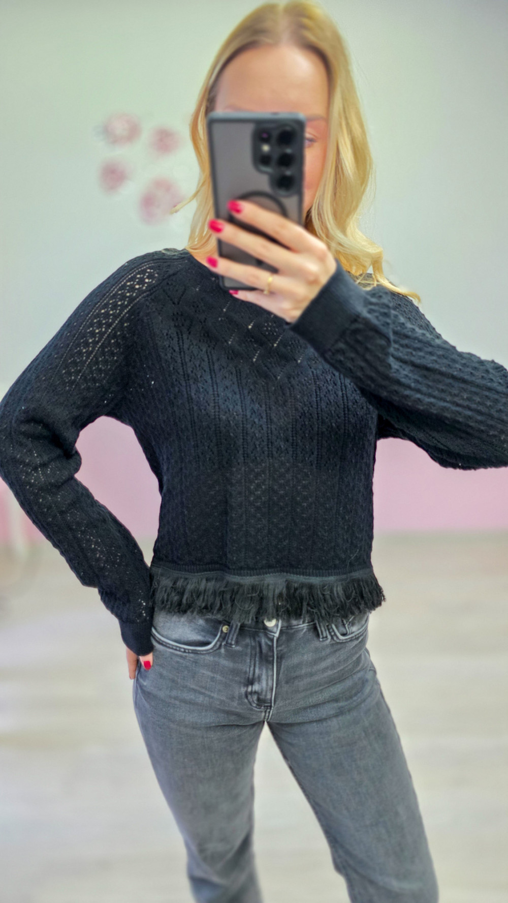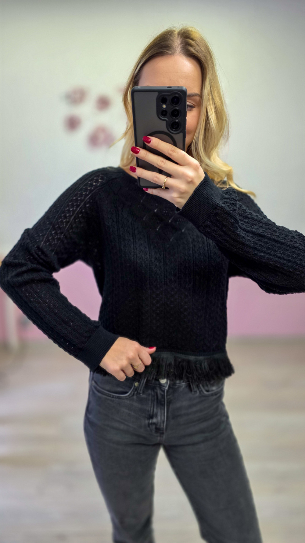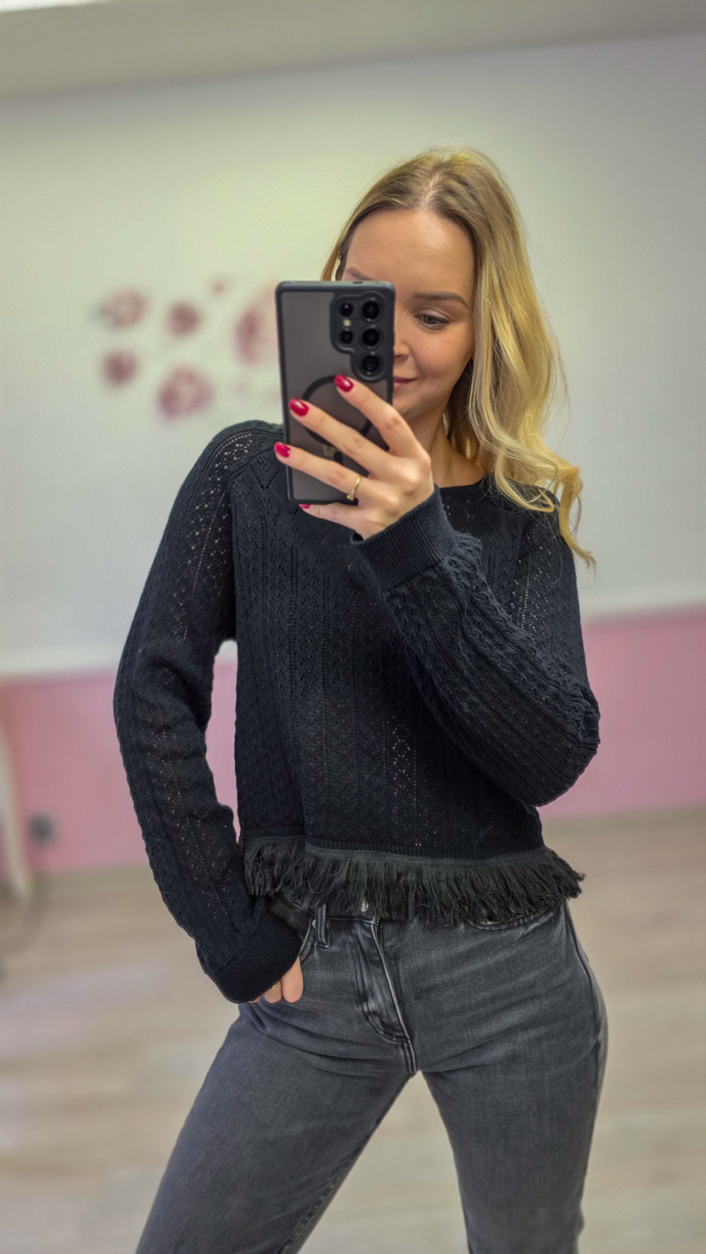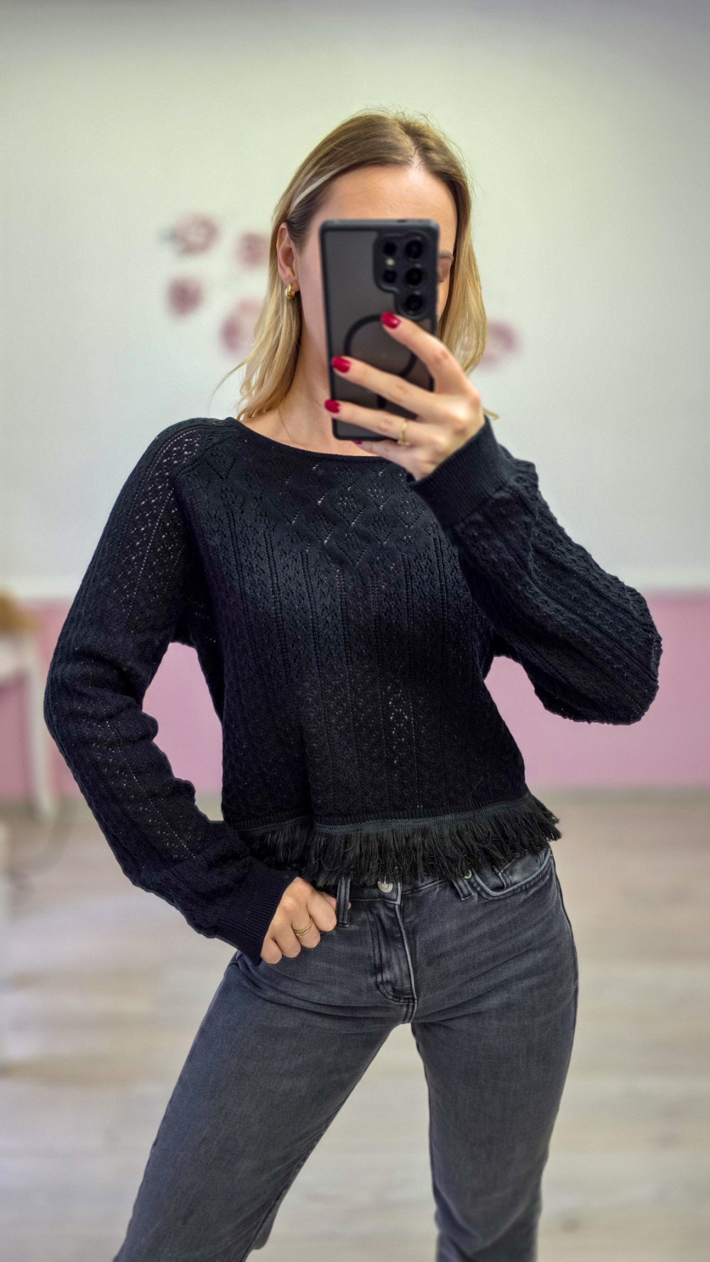Czarny ażurowy sweter z dekoracyjnym dołem to wyjątkowa propozycja dla kobiet, które lubią łączyć wygodę z modnym, niebanalnym stylem. Delikatny ażur dodaje mu lekkości, a frędzle u dołu nadają całości oryginalnego charakteru. Sweter świetnie prezentuje się w codziennych stylizacjach, tworząc przytulny, a jednocześnie efektowny look. To idealny wybór na sezon przejściowy, kiedy liczy się komfort i styl w jednym.