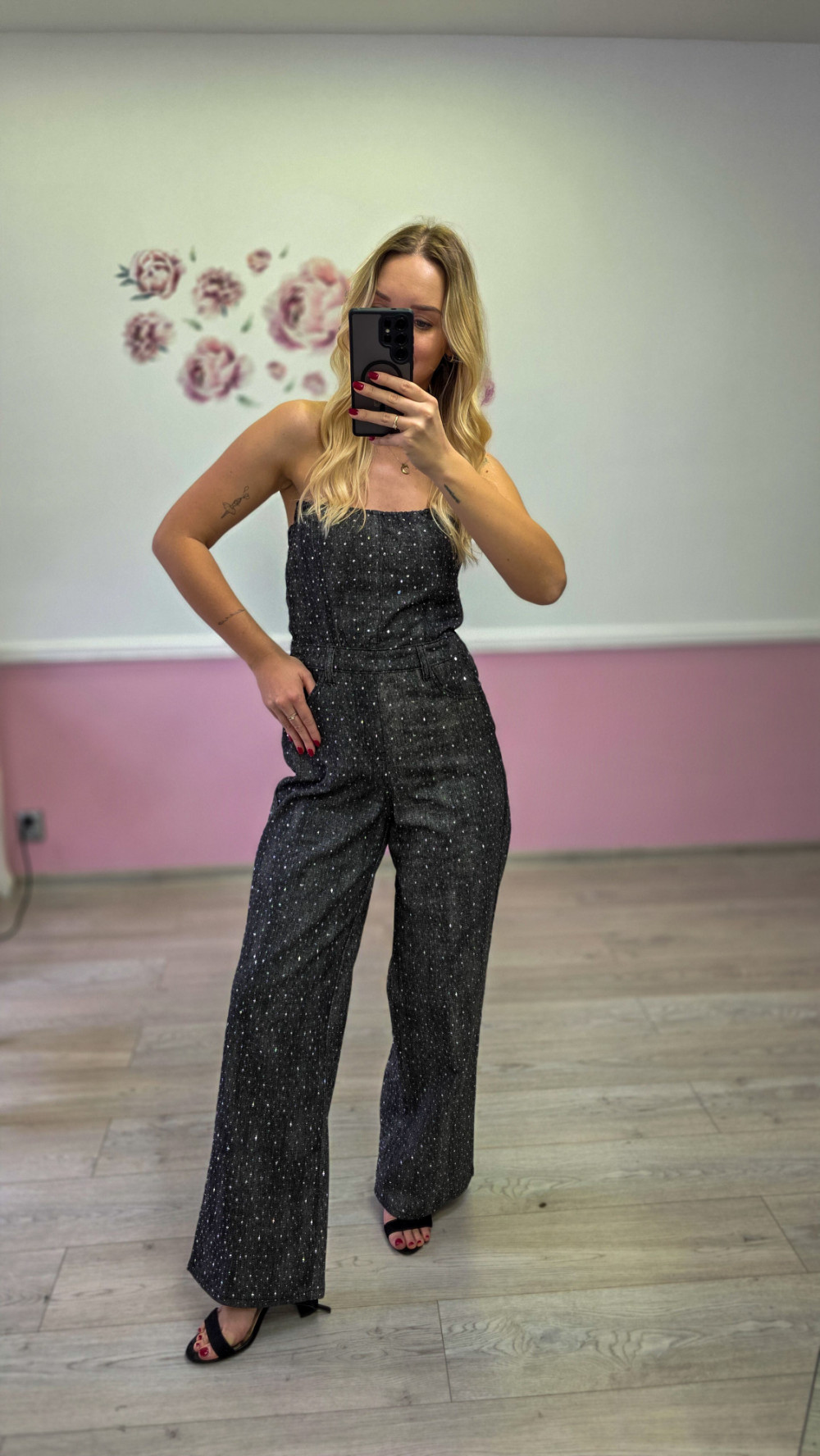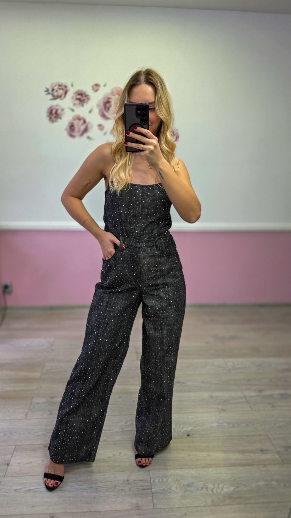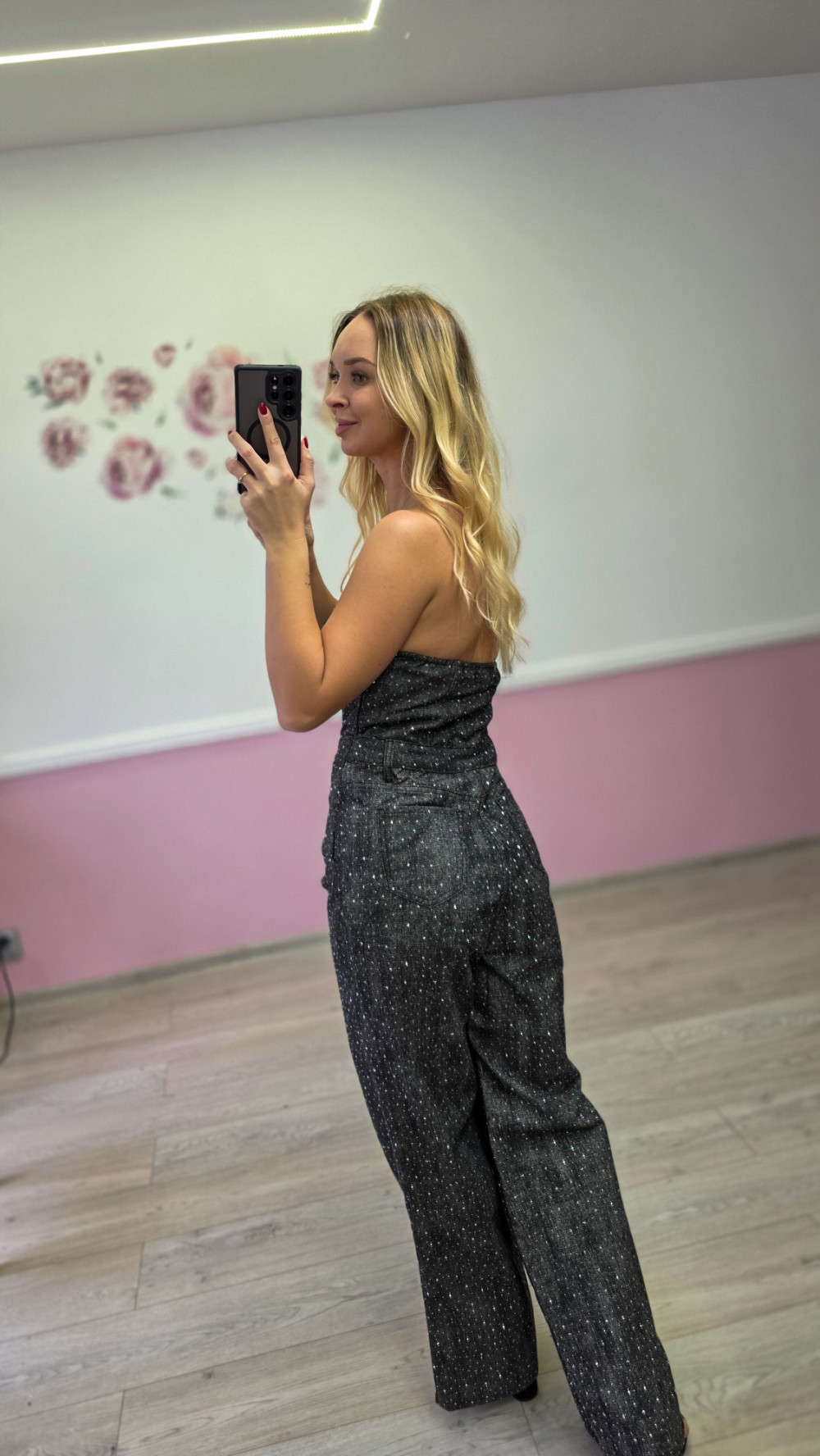 Czarny kombinezon z subtelnym, drobnym połyskiem to efektowna propozycja idealna na wieczorne wyjścia i specjalne okazje. Góra bez ramiączek podkreśla ramiona, a luźniejszy, lekko rozszerzany dół dodaje całości lekkości i nowoczesnego charakteru. Kombinezon prezentuje się niezwykle stylowo, a jednocześnie pozostaje wygodny w noszeniu. To świetny wybór, gdy chcesz wyglądać elegancko, ale w bardziej nowoczesnej odsłonie niż klasyczna sukienka.