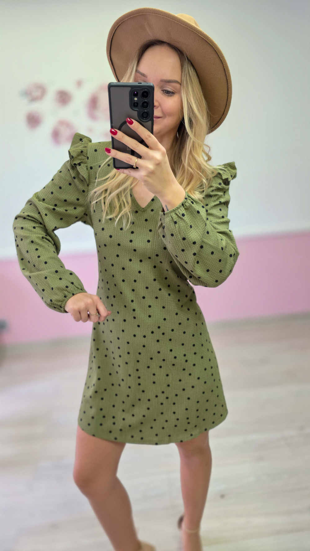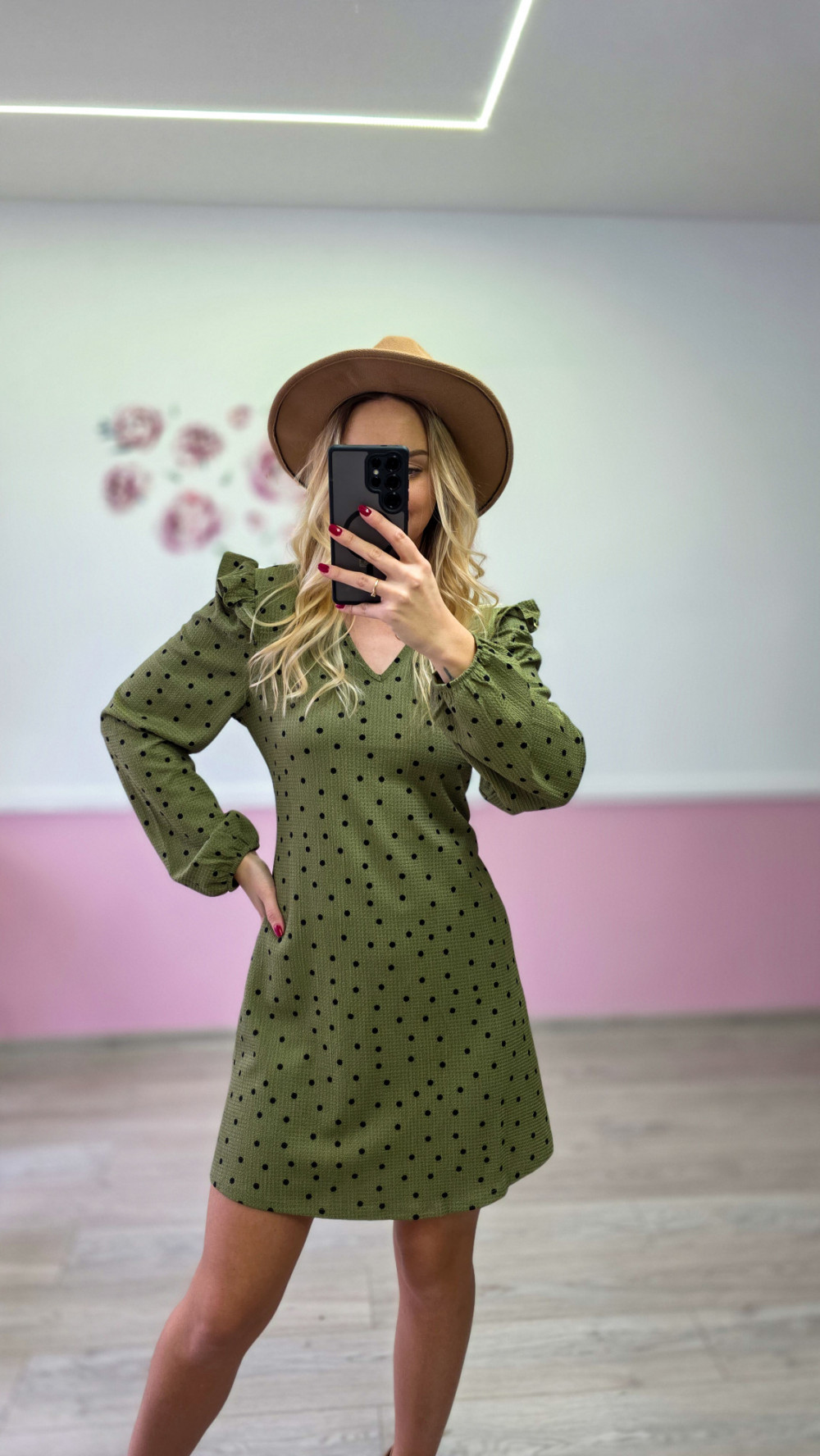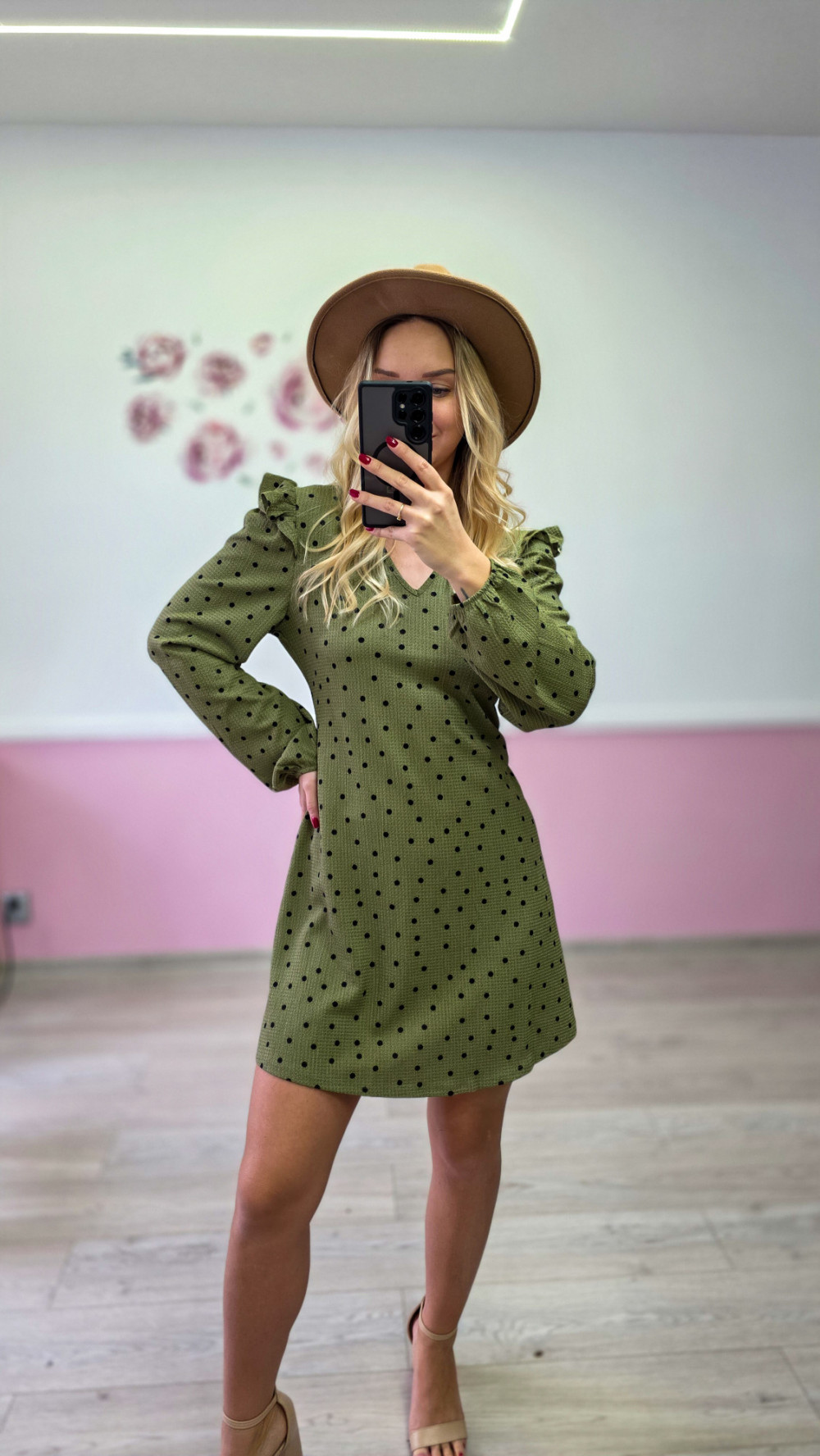 Zielona sukienka w czarne groszki to urocza i kobieca propozycja, która świetnie sprawdzi się na co dzień, do pracy czy na spotkania. Delikatne falbanki na ramionach dodają jej subtelnego, romantycznego charakteru, a lekko rozkloszowany fason pięknie układa się na sylwetce. Materiał jest wygodny, lekki i przyjemny w noszeniu. To model, który wyróżnia się kolorem i ponadczasowym wzorem, dzięki czemu łatwo stworzysz z nim modne stylizacje.