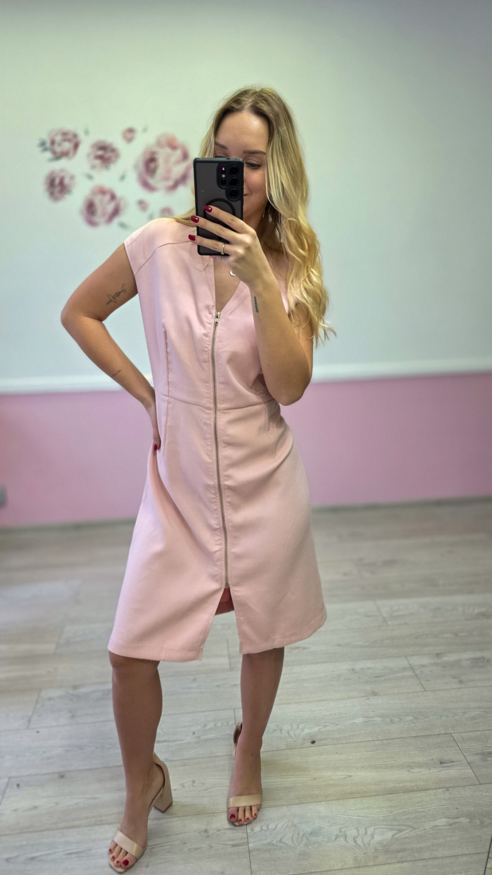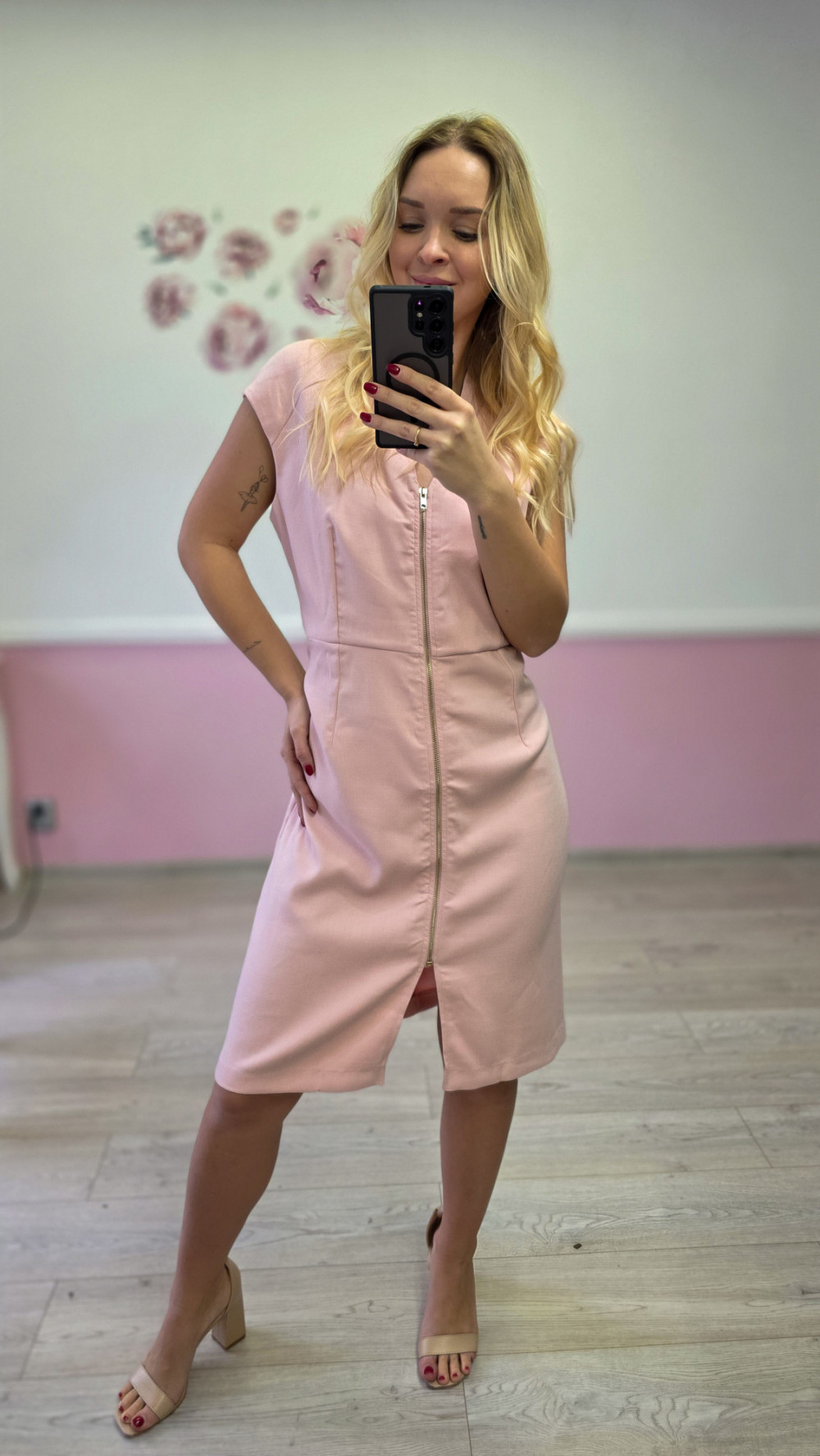 Pudrowo-różowa sukienka midi to elegancka, subtelna propozycja, która świetnie sprawdzi się zarówno na co dzień, jak i na bardziej oficjalne okazje. Zamek na całej długości nadaje jej nowoczesnego charakteru i pozwala regulować głębokość rozcięcia. Fason pięknie podkreśla talię, a delikatny kolor dodaje całości lekkości i dziewczęcego uroku. To idealny model dla kobiet, które cenią wygodę i elegancję w jednym.
