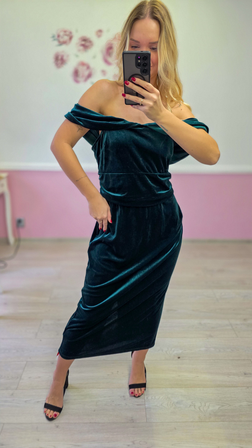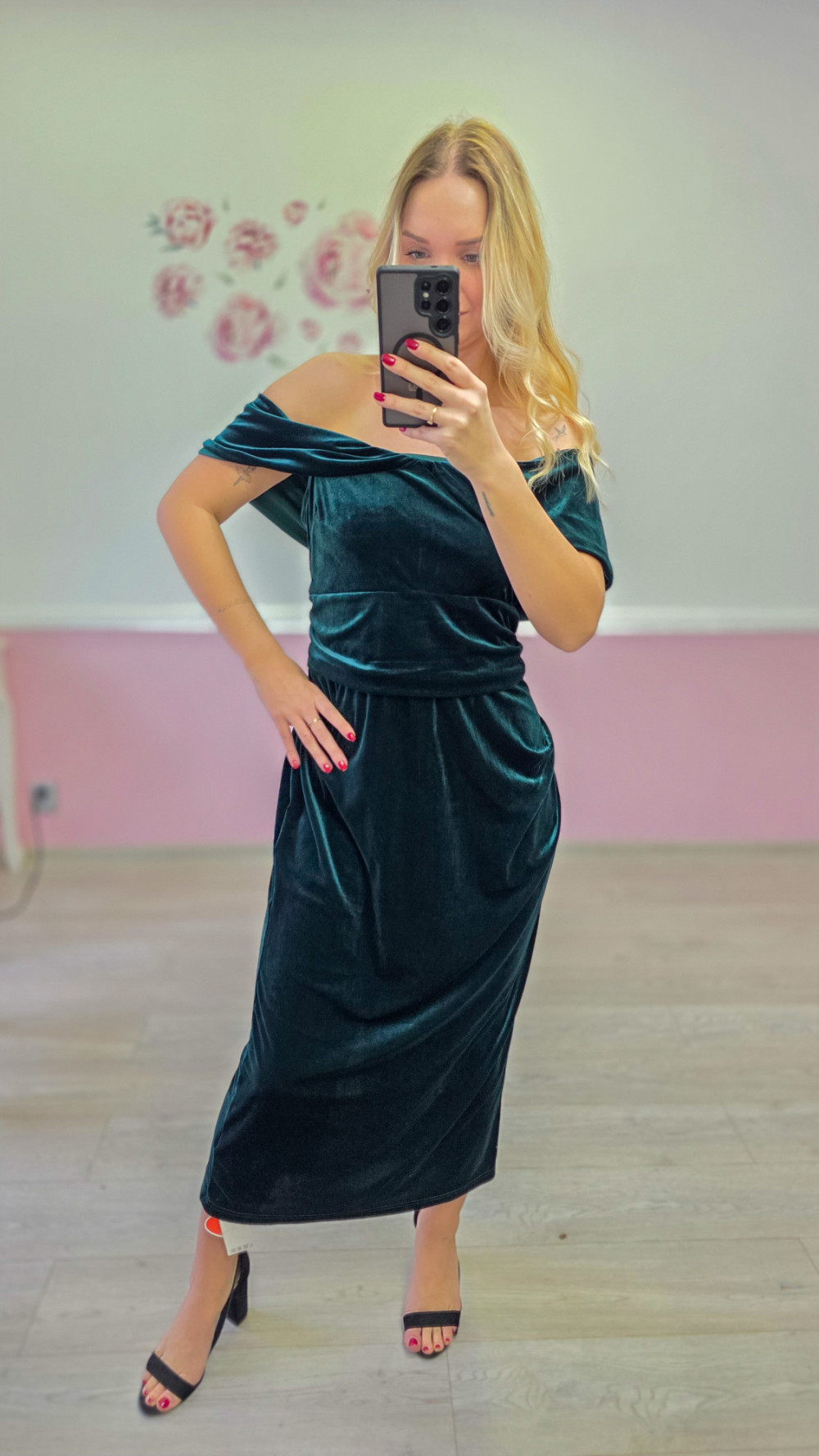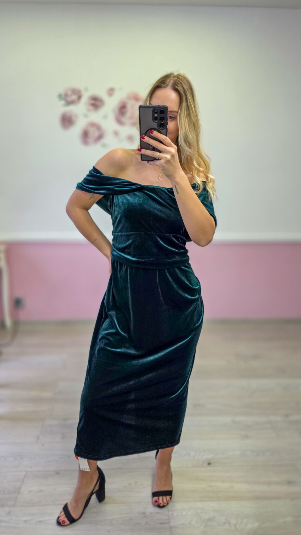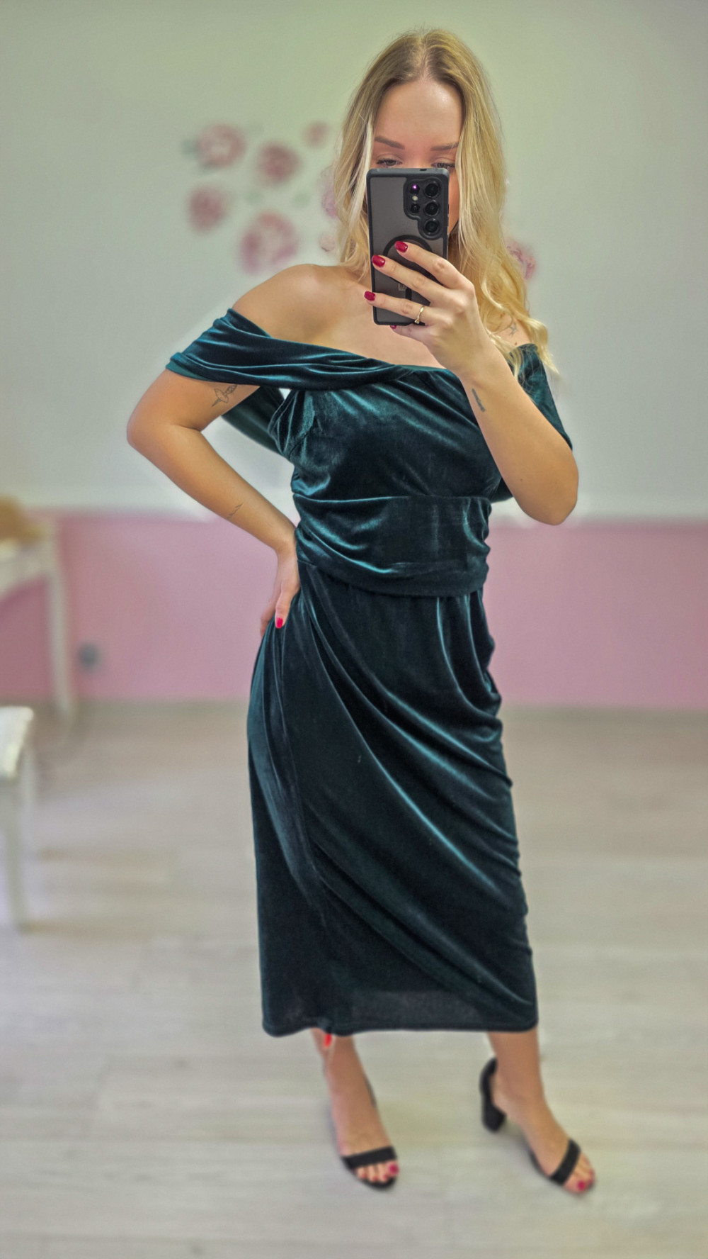 Butelkowa sukienka welurowa w stylu hiszpanki to idealna propozycja na eleganckie wyjścia, święta, kolacje czy imprezy. Miękki, połyskujący welur pięknie odbija światło i podkreśla kobiecą sylwetkę, a dekolt opadający na ramiona nadaje całości zmysłowego charakteru. Długość midi wysmukla nogi, a marszczenia dodają klasy i subtelnej elegancji. To model, który łączy wygodę z wyjątkowym efektem WOW.