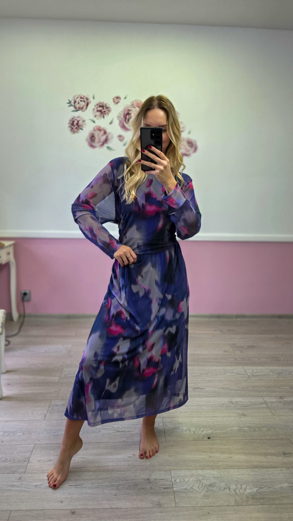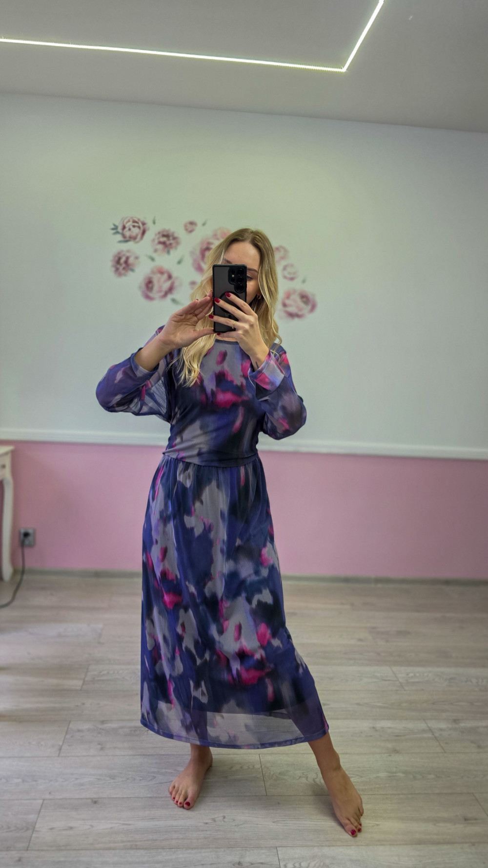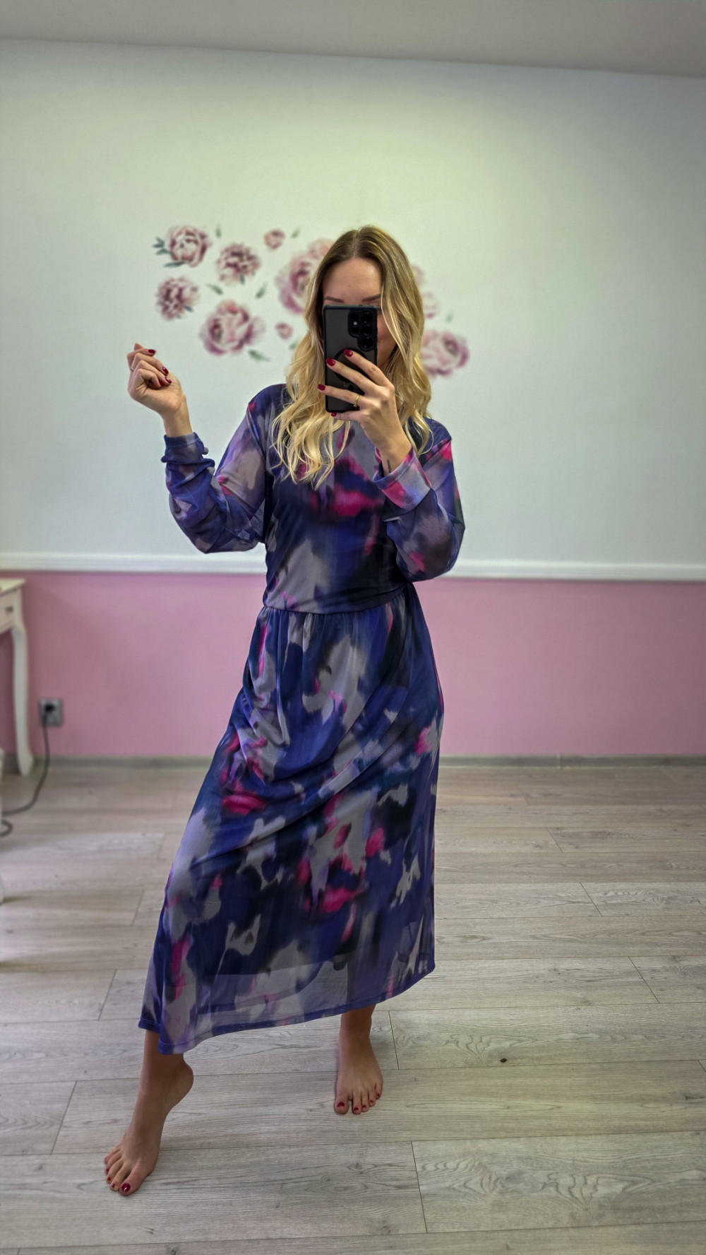 Długa, zwiewna sukienka maxi w akwarelowy print to wyjątkowa propozycja, która łączy lekkość z elegancją. Przenikające się odcienie granatu, różu i fioletu tworzą niepowtarzalny efekt, a transparentna tkanina nadaje modelowi lekkości i subtelności. Elastyczna talia delikatnie podkreśla figurę, a luźny krój sprawia, że sukienka jest niezwykle wygodna. Idealna na wakacje, letnie przyjęcia, spacery i romantyczne wyjścia.