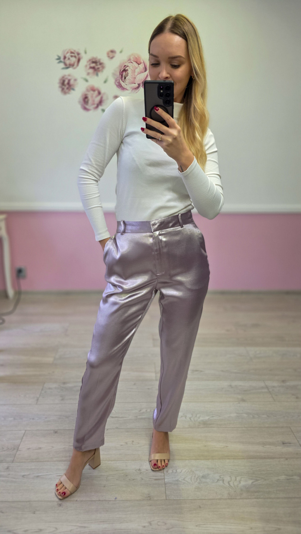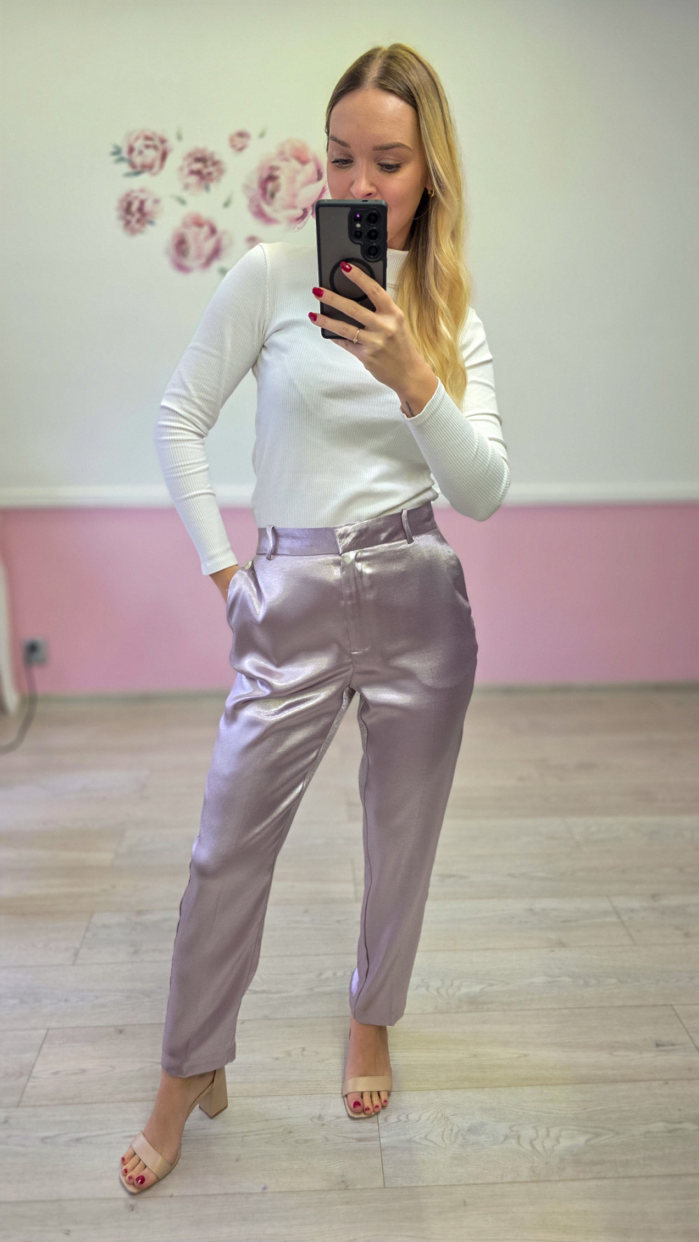 Jeśli szukasz spodni, które są jednocześnie eleganckie, nowoczesne i bardzo kobiece — ten satynowy model będzie idealnym wyborem.