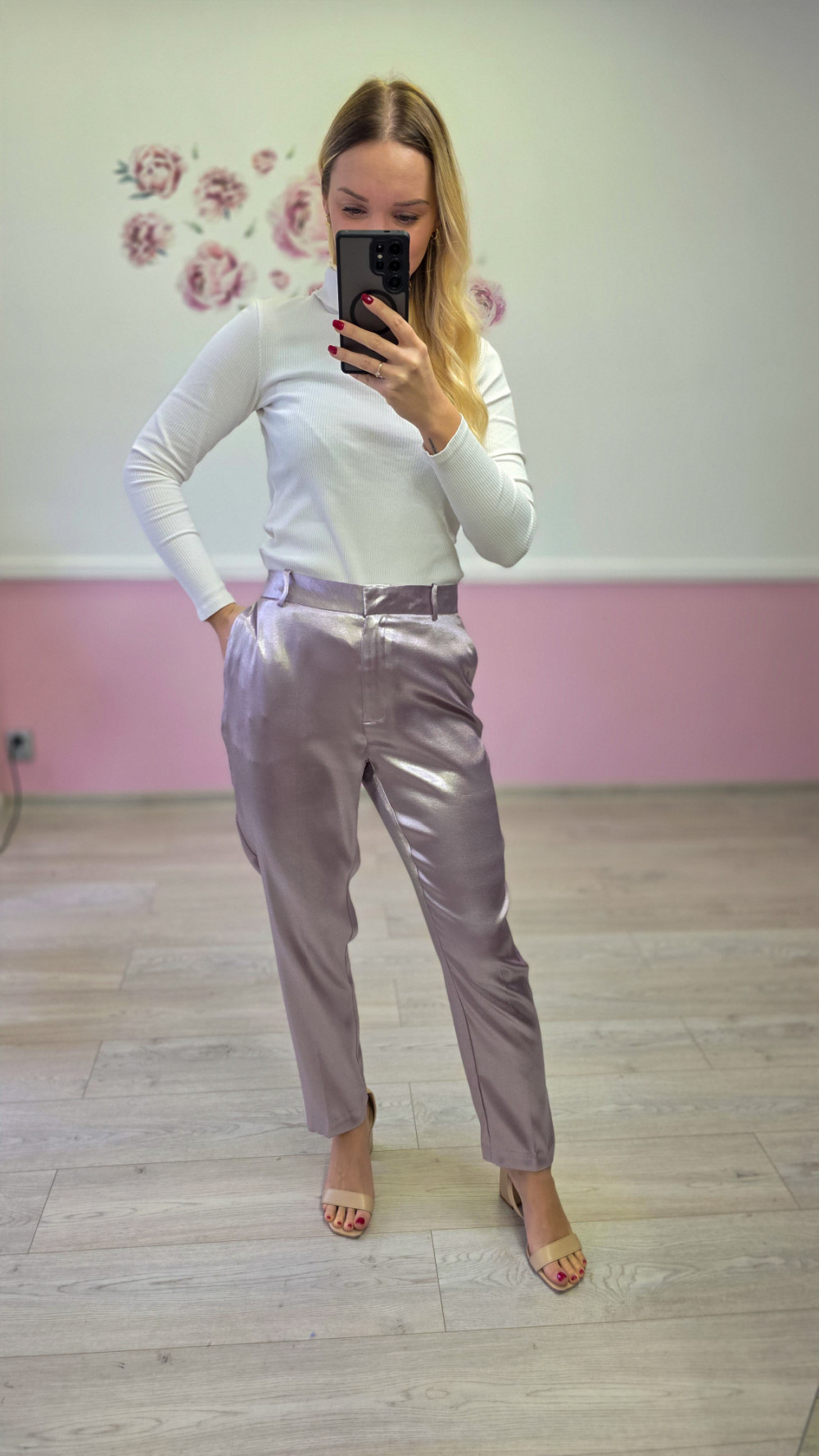 Spodnie rewelacyjnie prezentują się w duecie z gładkim body, klasycznym golfem lub elegancką koszulą. Świetnie komponują się zarówno ze szpilkami, jak i butami na niższym obcasie. To model, który pozwoli Ci stworzyć stylizacje na wesele, randkę, wieczorne wyjście, ale także do pracy w bardziej glamour wydaniu.