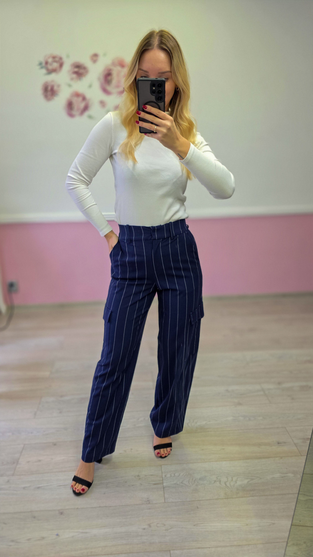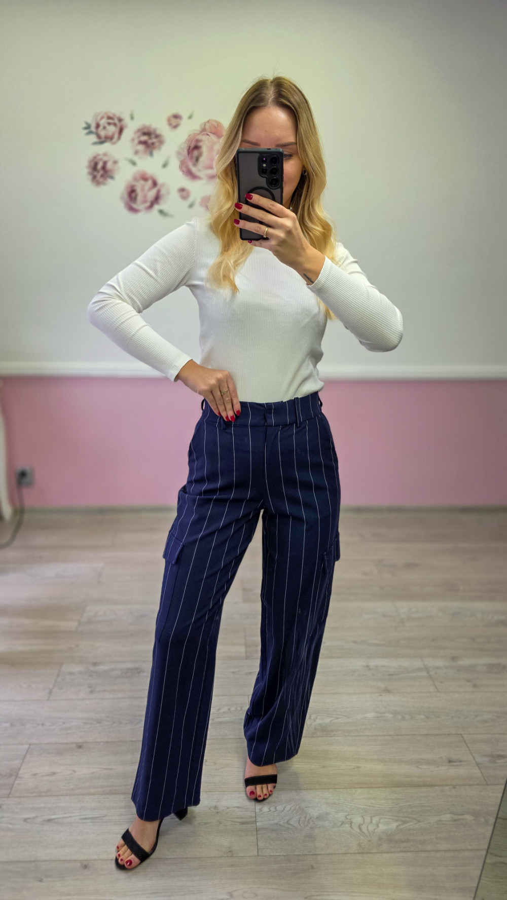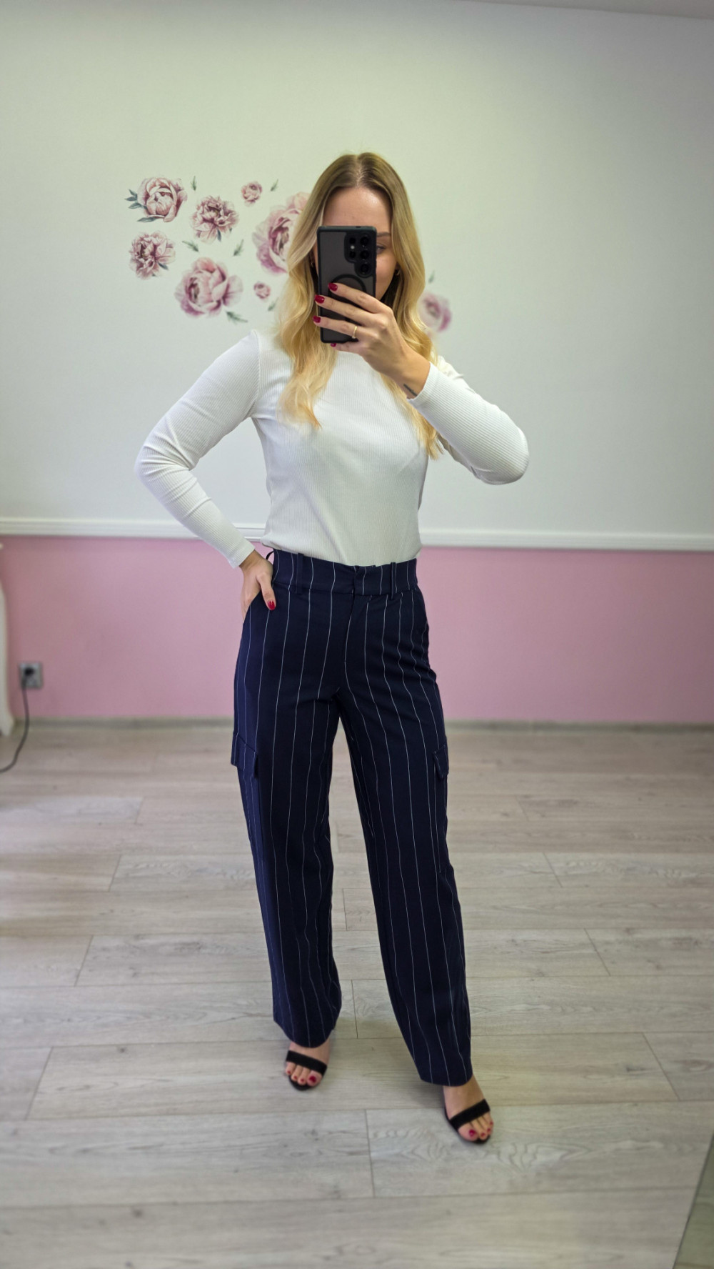 Granatowe spodnie w białe, pionowe paski to idealne połączenie elegancji i luzu, które świetnie sprawdza się w codziennych stylizacjach oraz bardziej oficjalnych okazjach. Model posiada szerokie nogawki, które pięknie układają się podczas ruchu, wysmuklają sylwetkę i dodają jej lekkości. Wysoki stan podkreśla talię i zapewnia wygodne dopasowanie, a boczne kieszenie cargo nadają spodniom nowoczesnego, modowego charakteru.