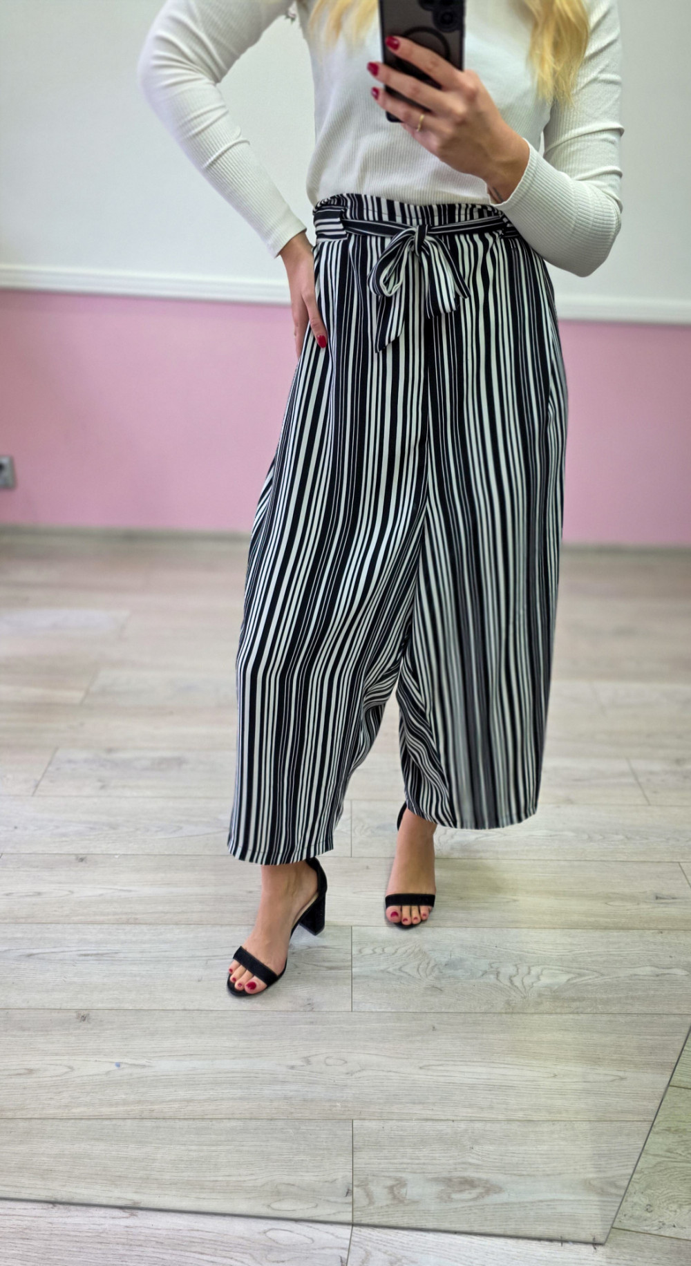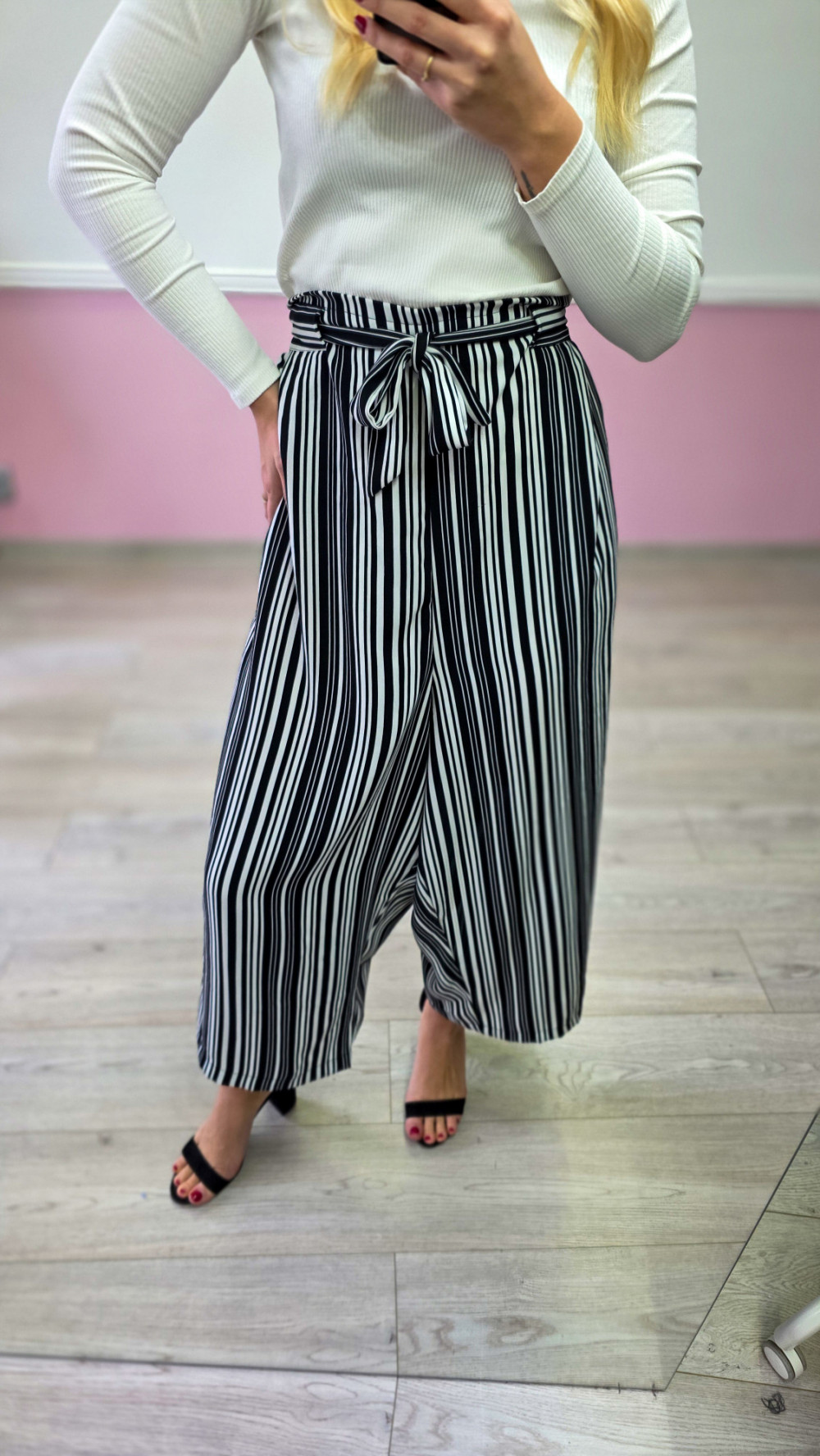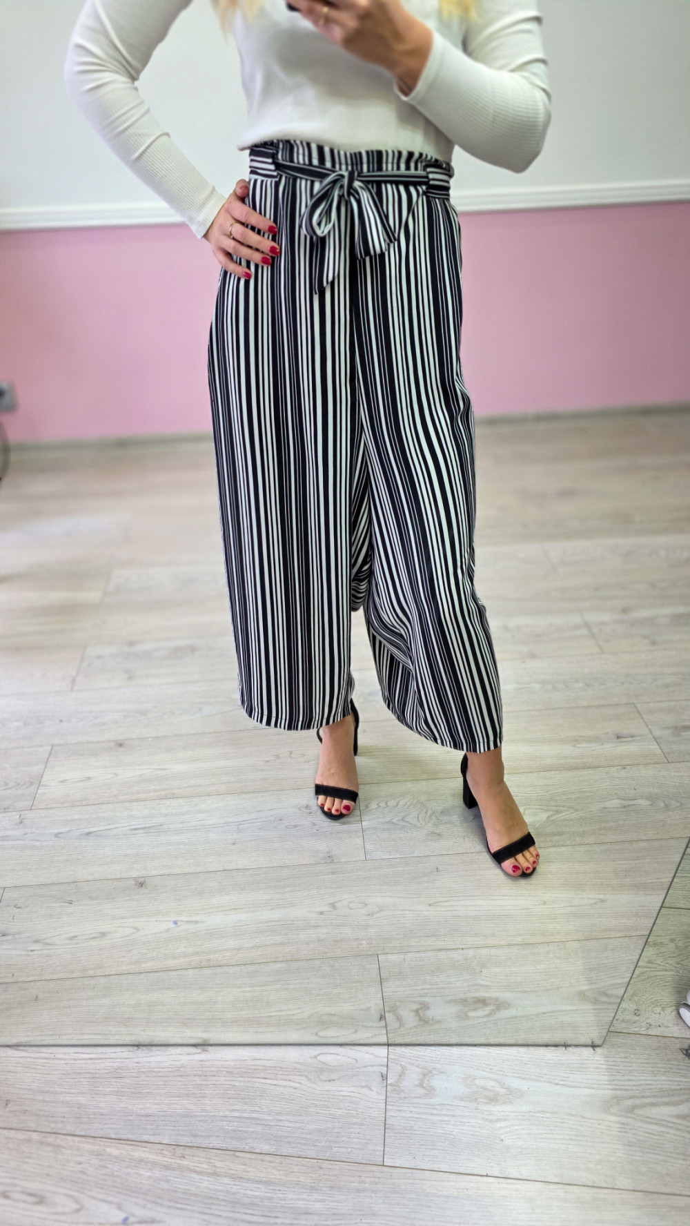 Odkryj komfort i lekkość dzięki szerokim spodniom damskim w paski. Model o luźnym kroju zapewnia swobodę ruchów i idealnie sprawdza się w cieplejsze dni. Wysoki stan z wiązaniem w talii pięknie podkreśla figurę, a pionowe paski optycznie wysmuklają sylwetkę. Doskonałe do eleganckich stylizacji z sandałkami na obcasie oraz do codziennych, bardziej luźnych zestawów.