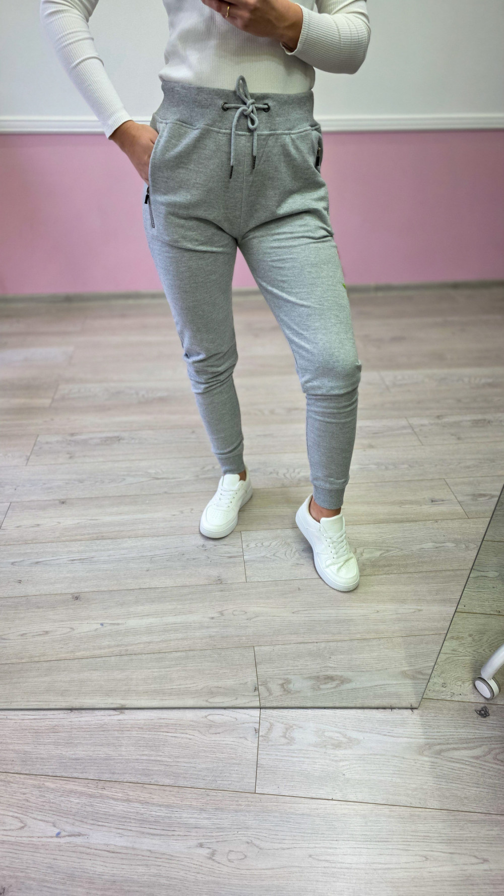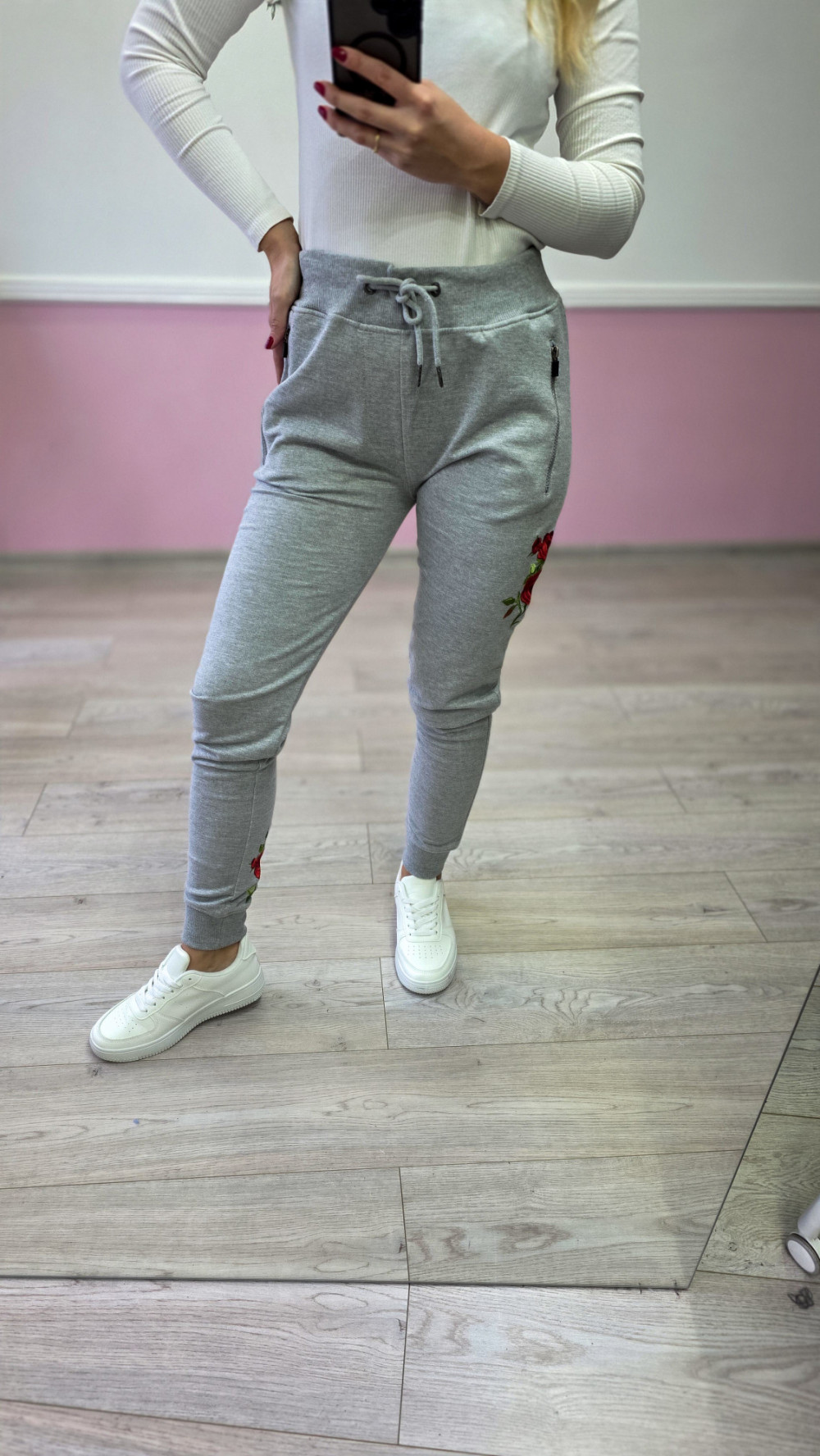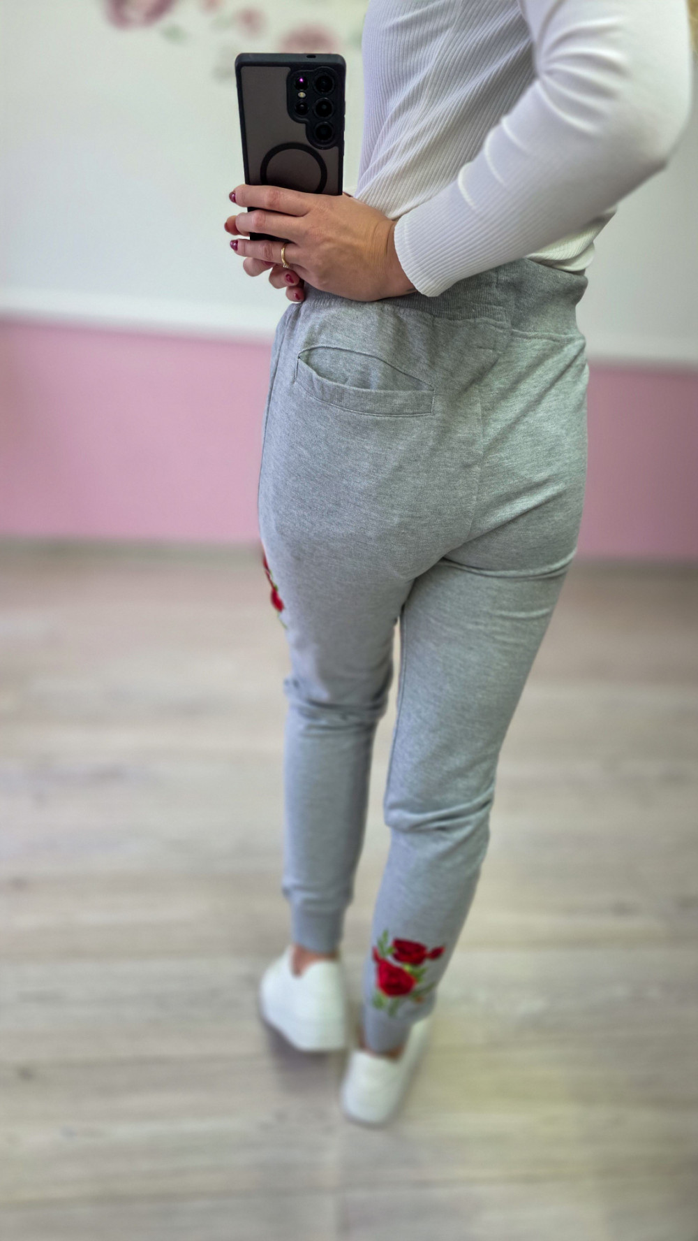 Szare spodnie dresowe z haftem – wygodne joggery z różami