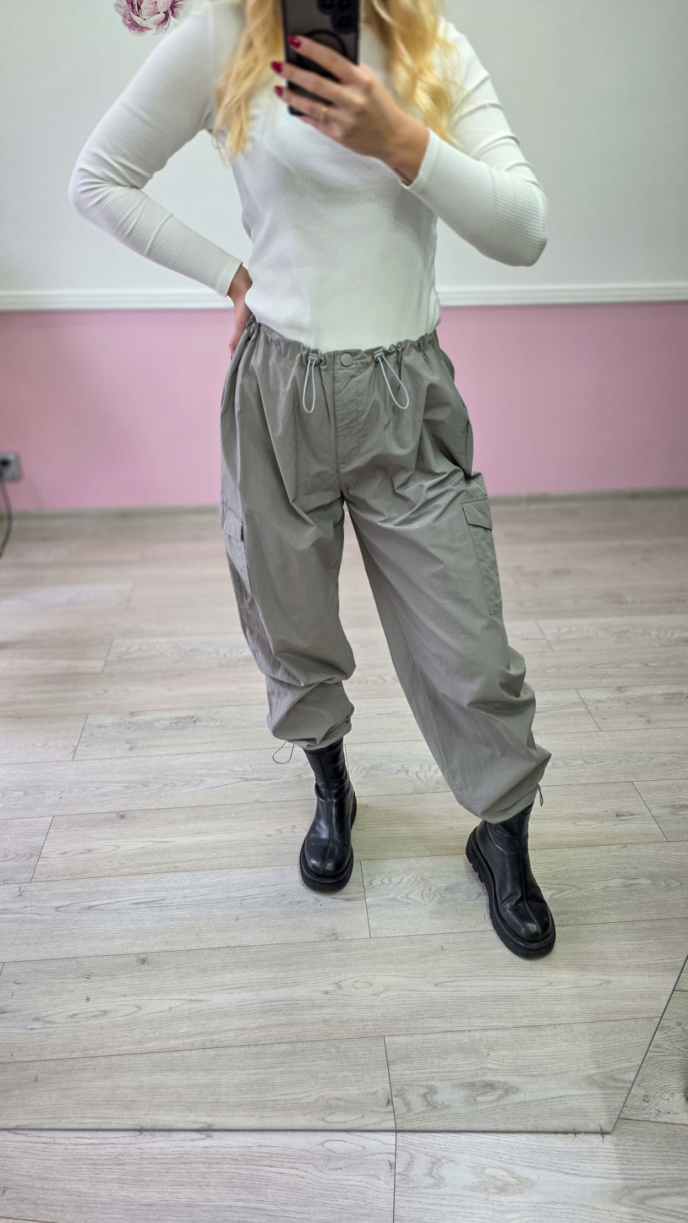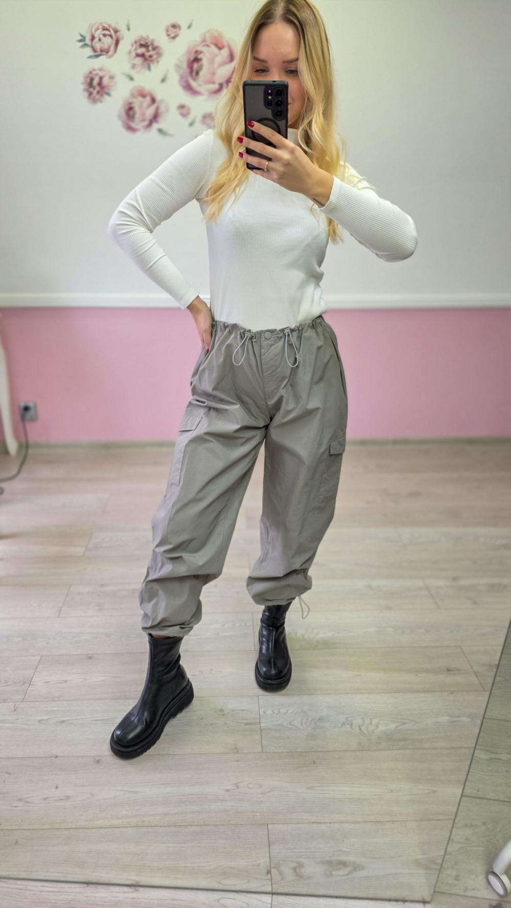 Szare spodnie cargo damskie – luźny krój, regulowana talia
