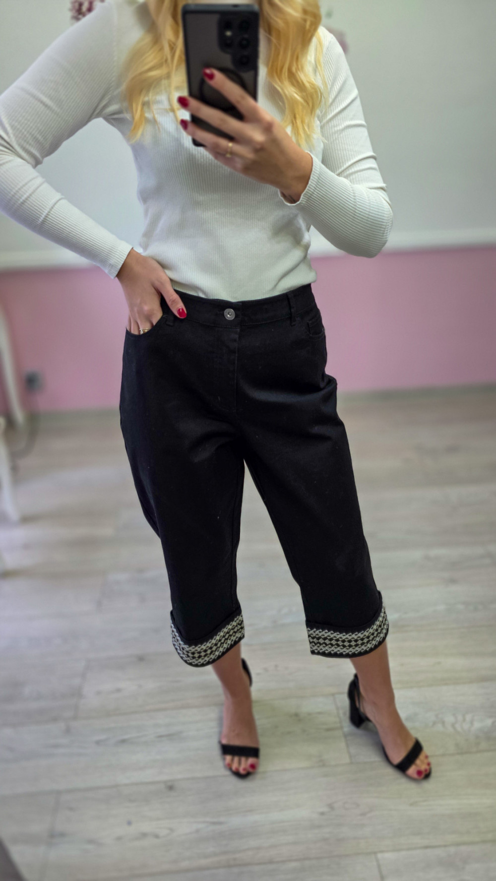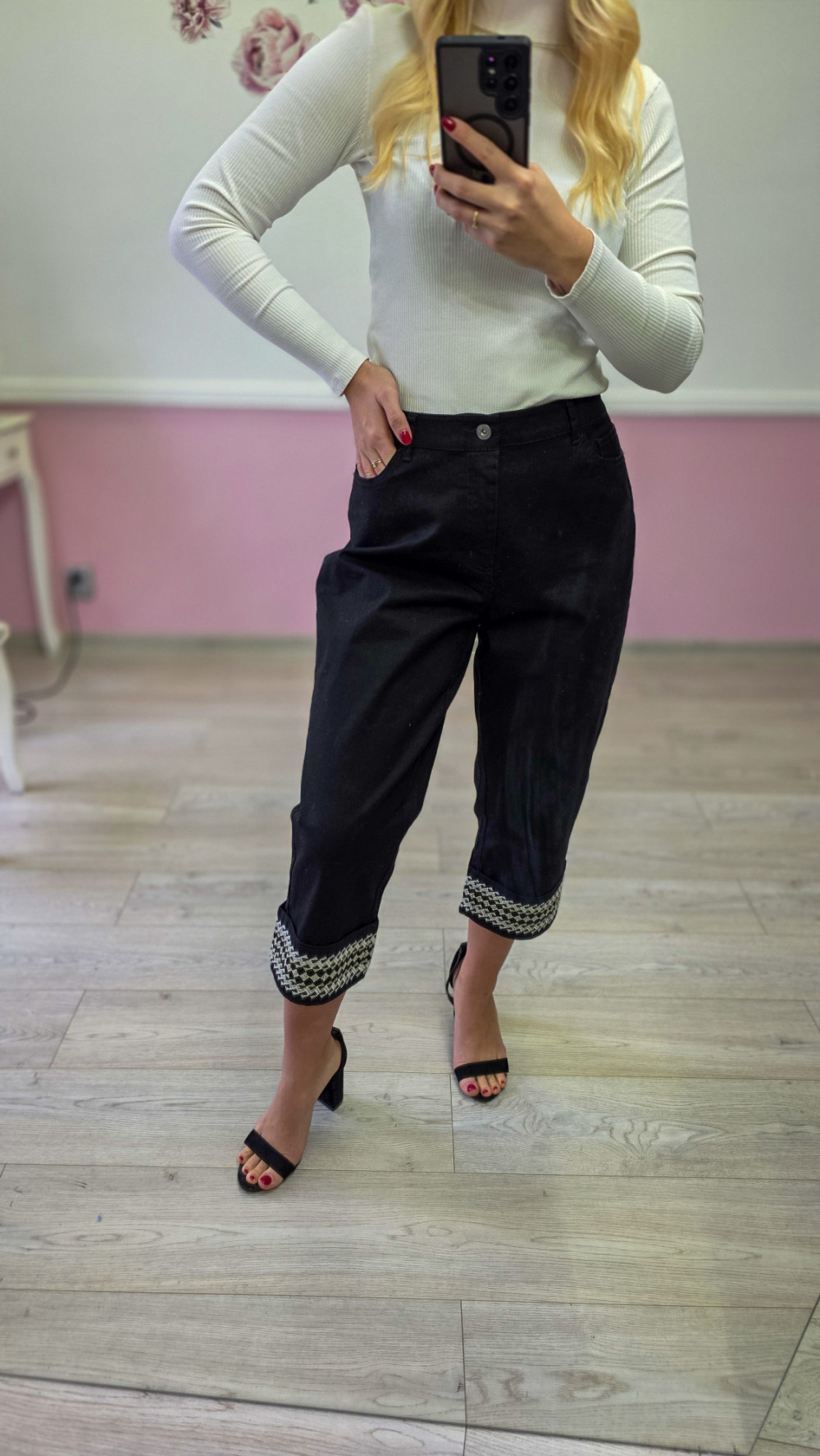 Czarne spodnie damskie 3/4 – z ozdobnym mankietem