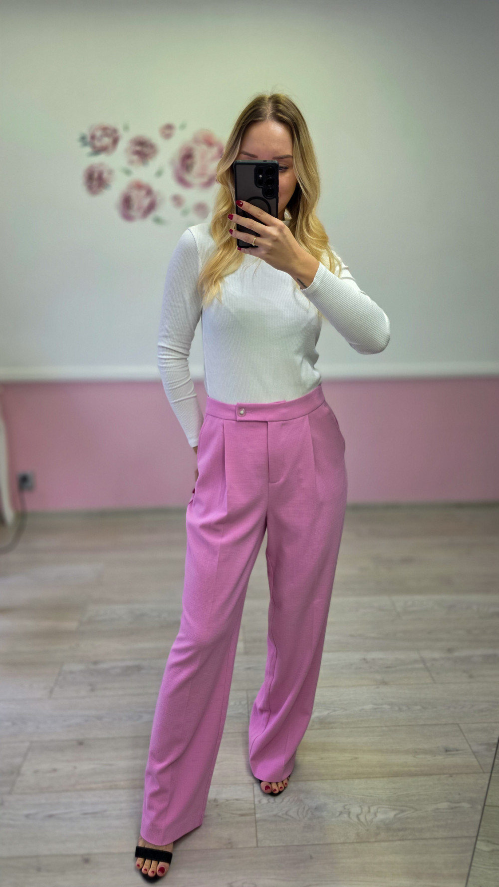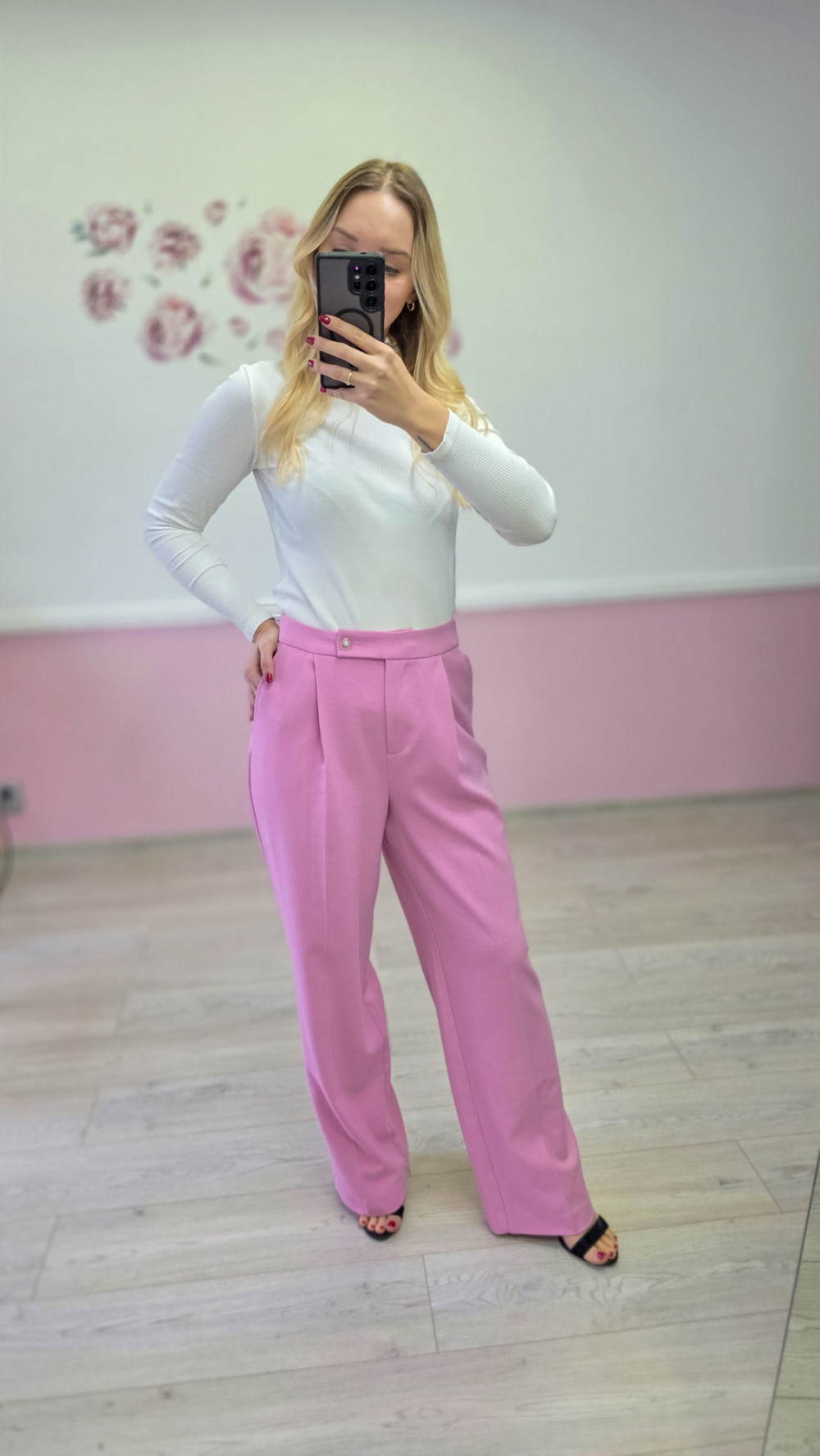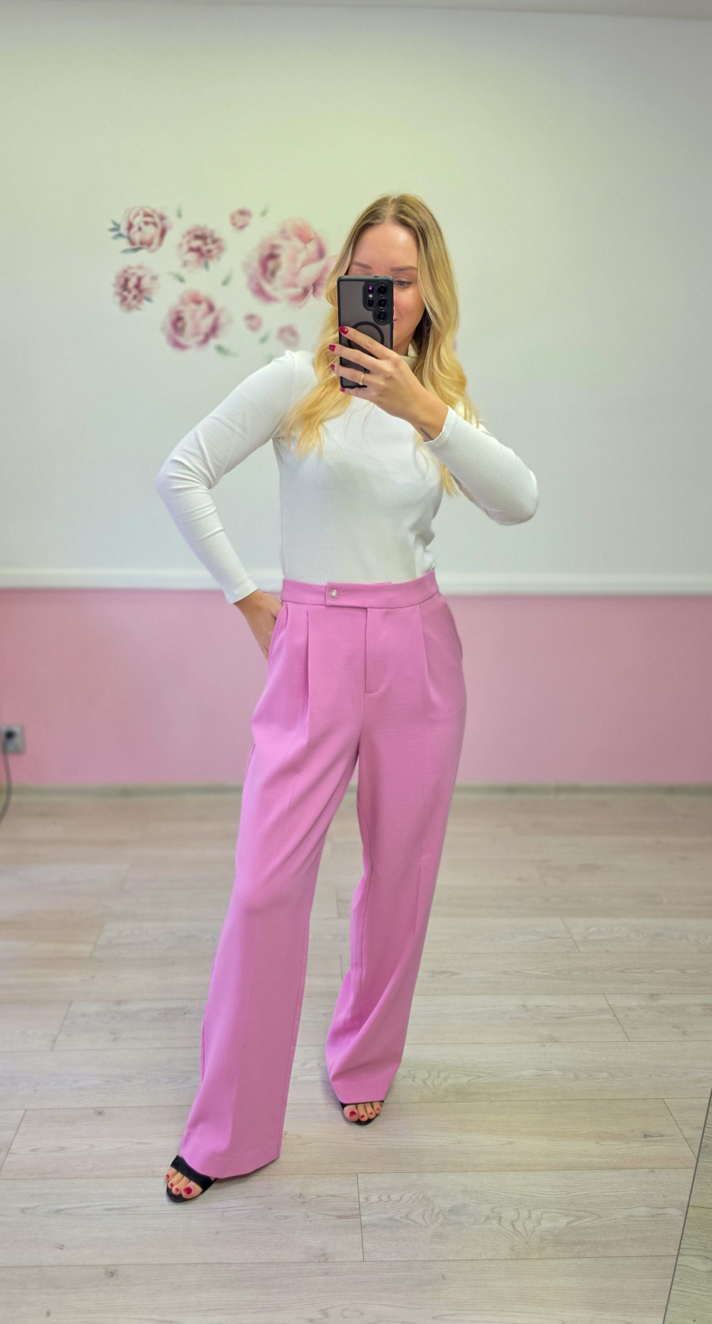 Różowe eleganckie spodnie damskie – szerokie, wysoki stan