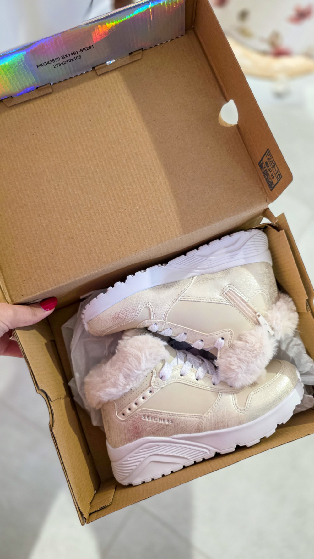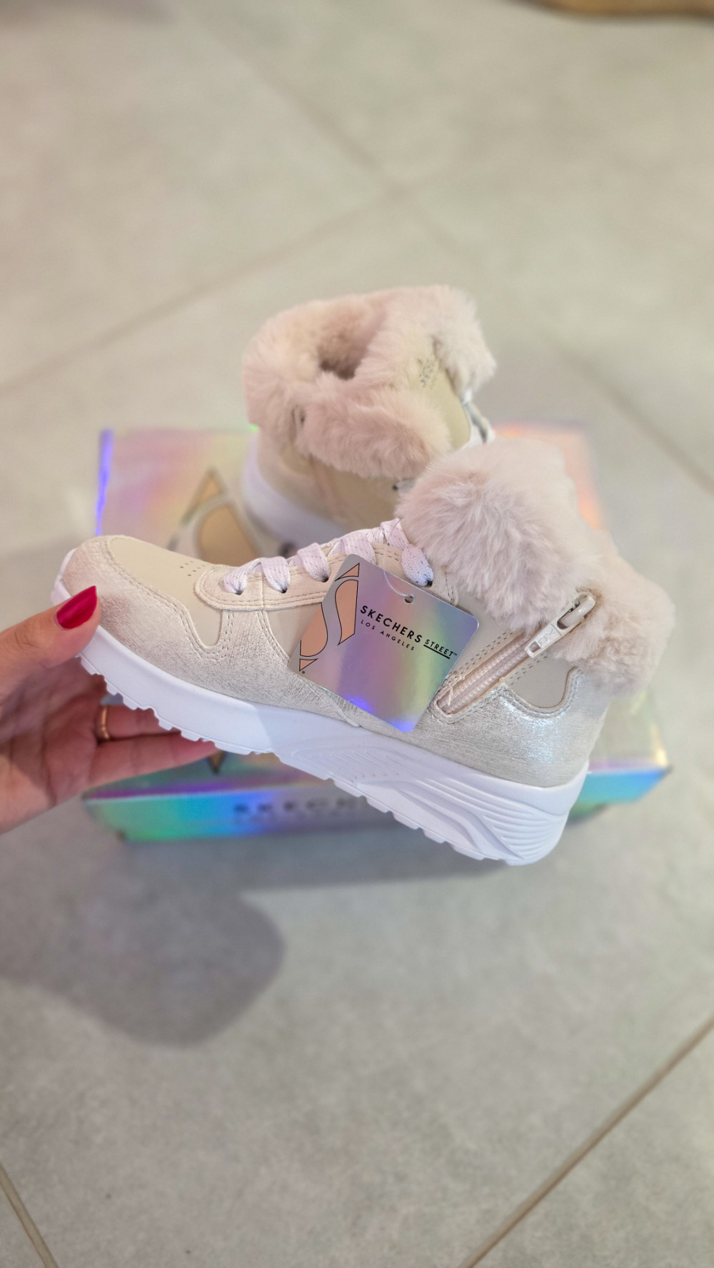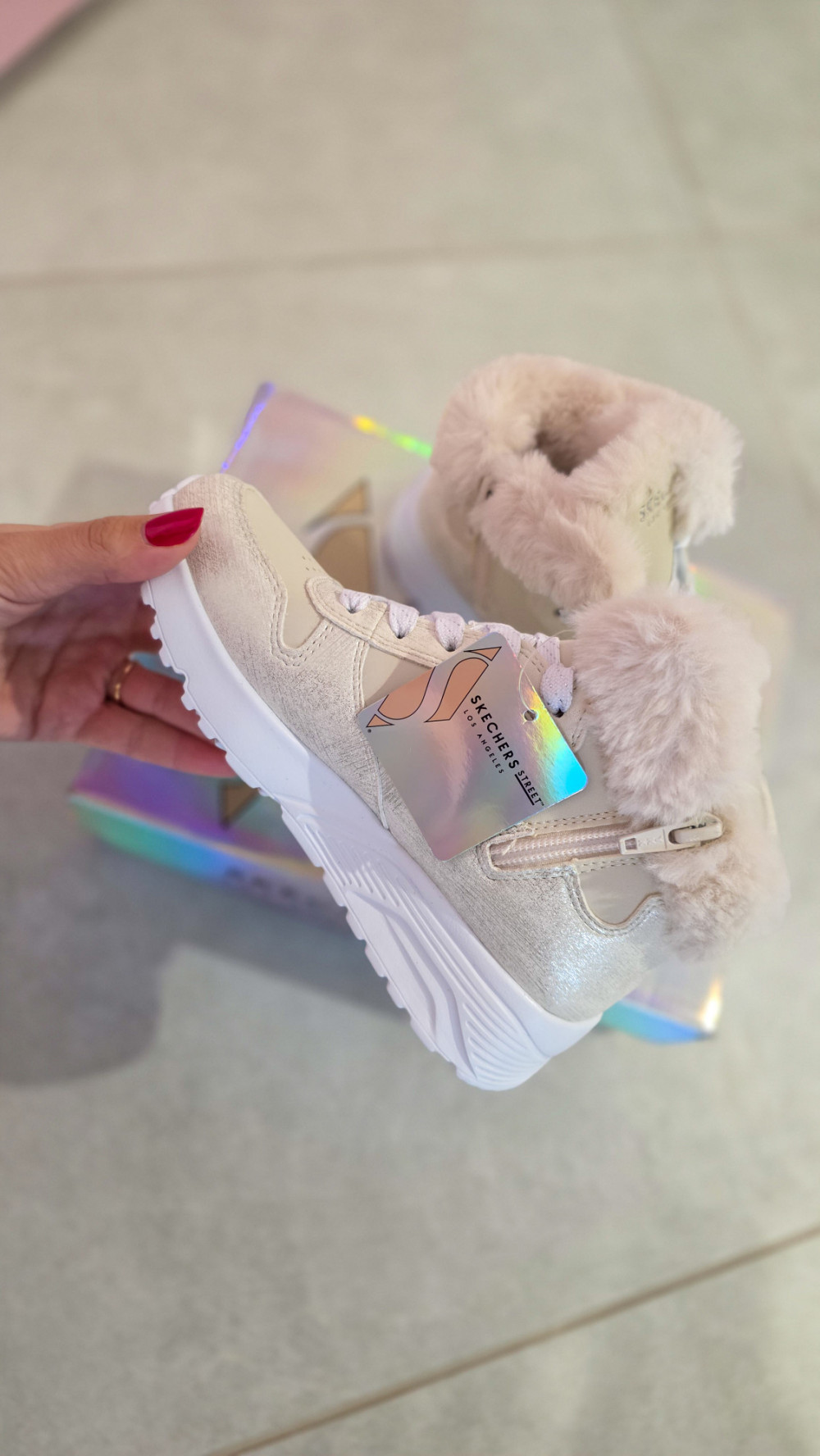 Stylowe i wygodne buty zimowe dla dziewczynki marki Skechers w kolorze kremowo-złotym to idealny wybór na chłodniejsze dni. Model typu sneakers z miękkim futerkiem przy kostce, który zapewnia ciepło i komfort noszenia. Buty są fabrycznie nowe, z metką oraz w oryginalnym pudełku.