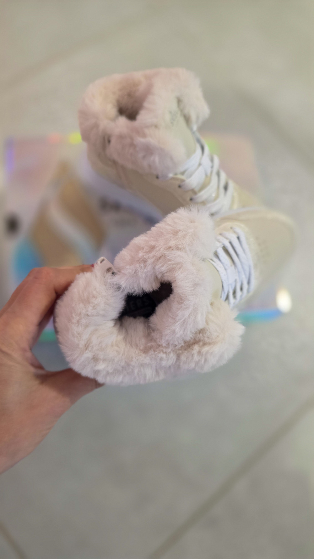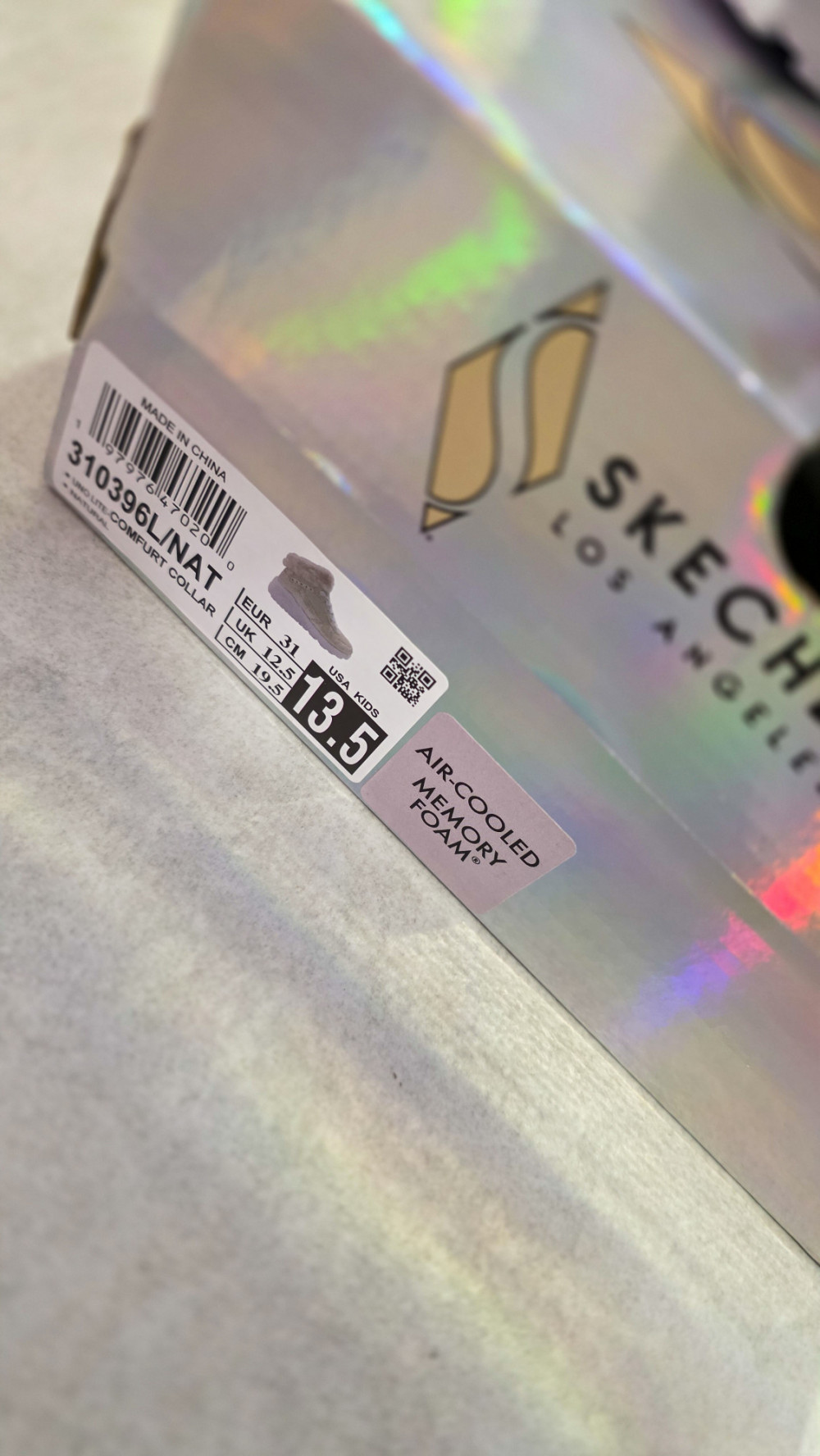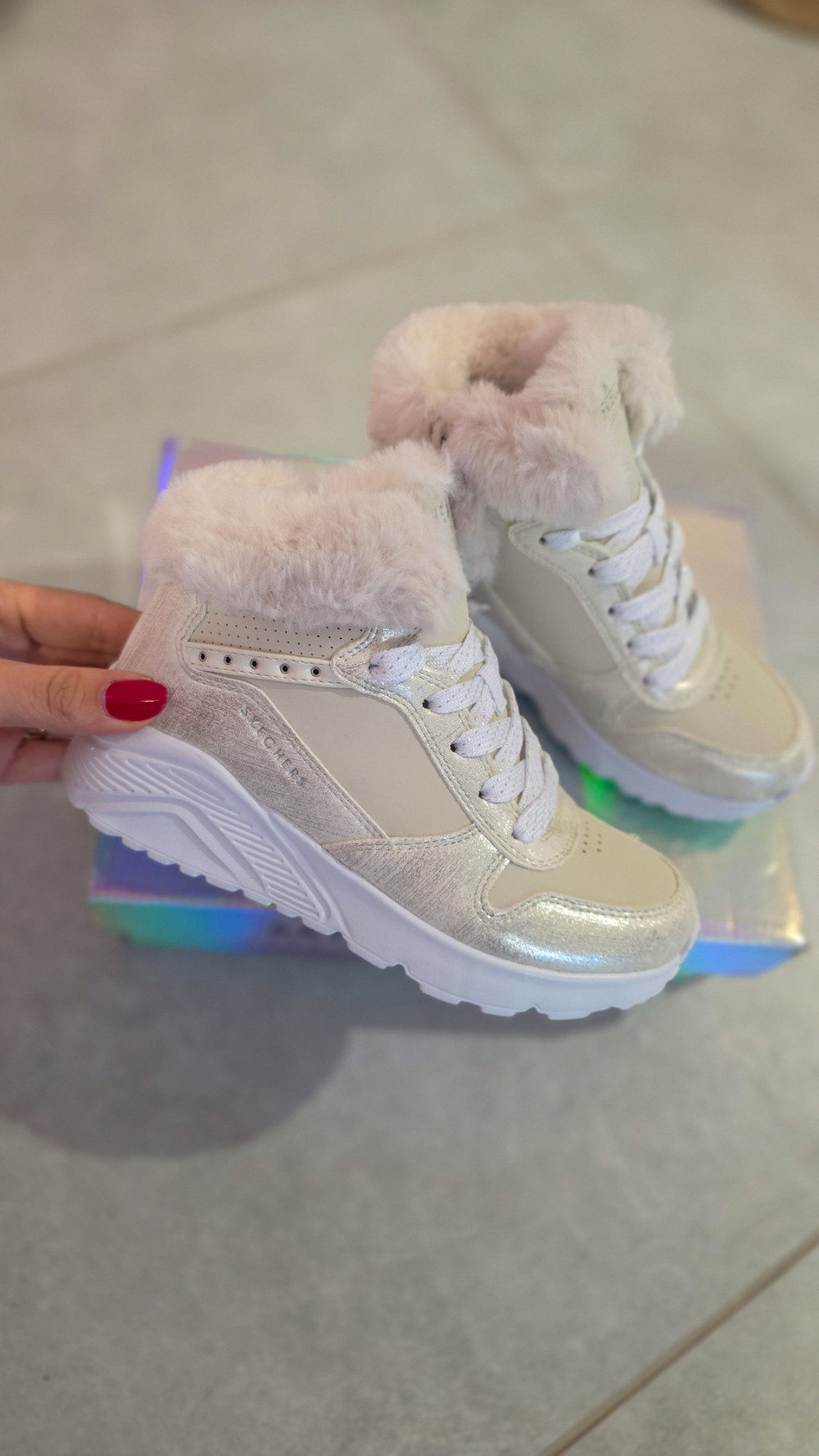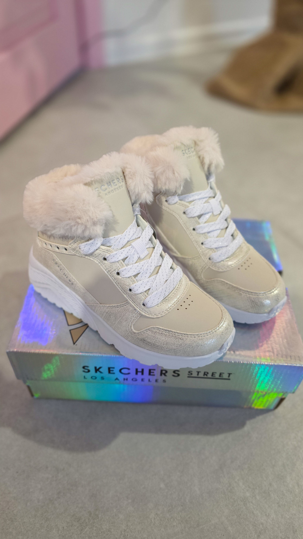 Stylowe i wygodne buty zimowe dla dziewczynki marki Skechers w kolorze kremowo-złotym to idealny wybór na chłodniejsze dni. Model typu sneakers z miękkim futerkiem przy kostce, który zapewnia ciepło i komfort noszenia. Buty są fabrycznie nowe, z metką oraz w oryginalnym pudełku.
