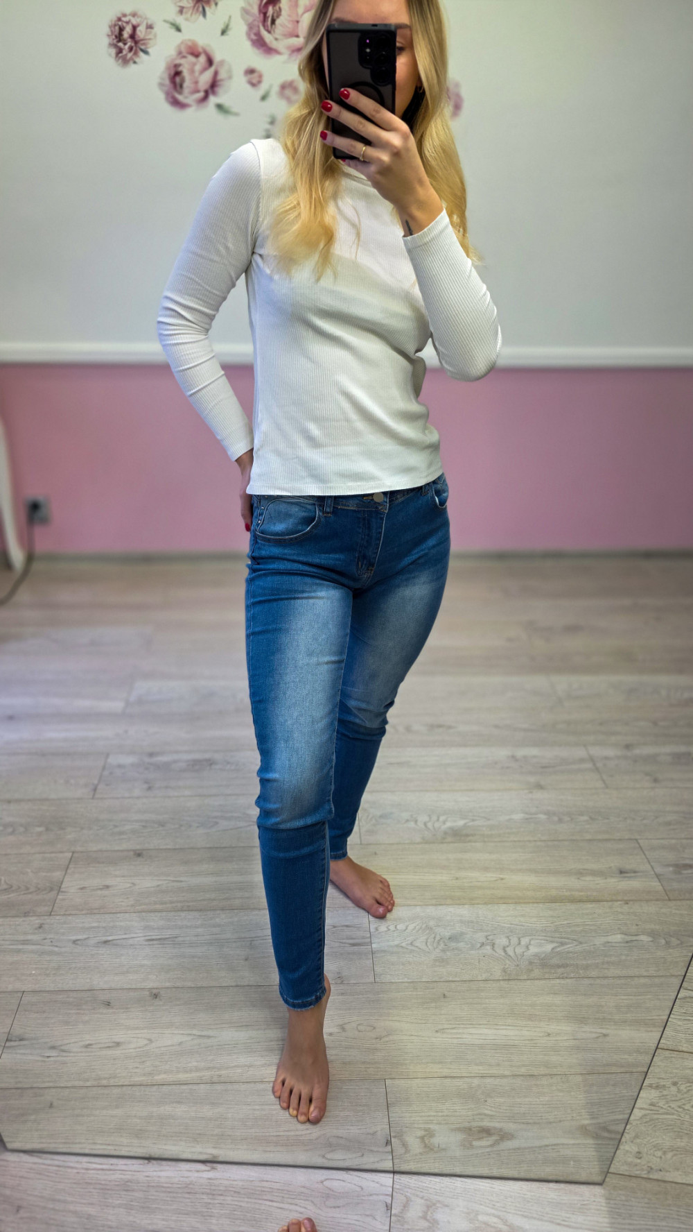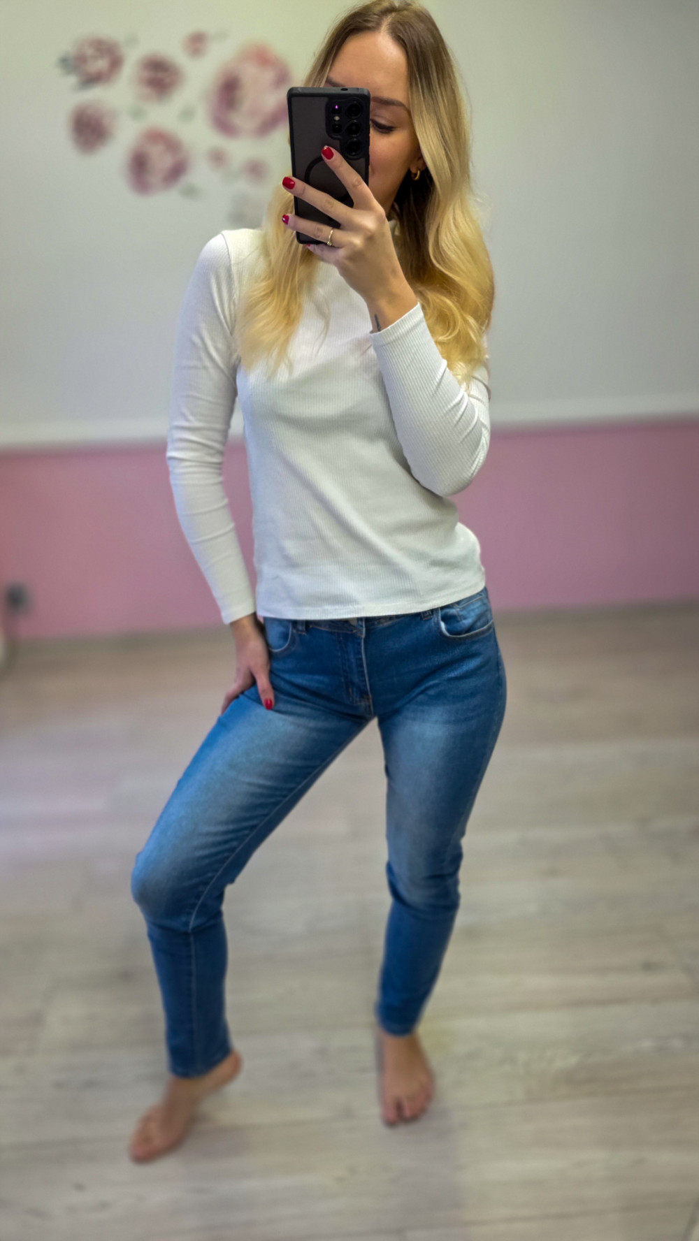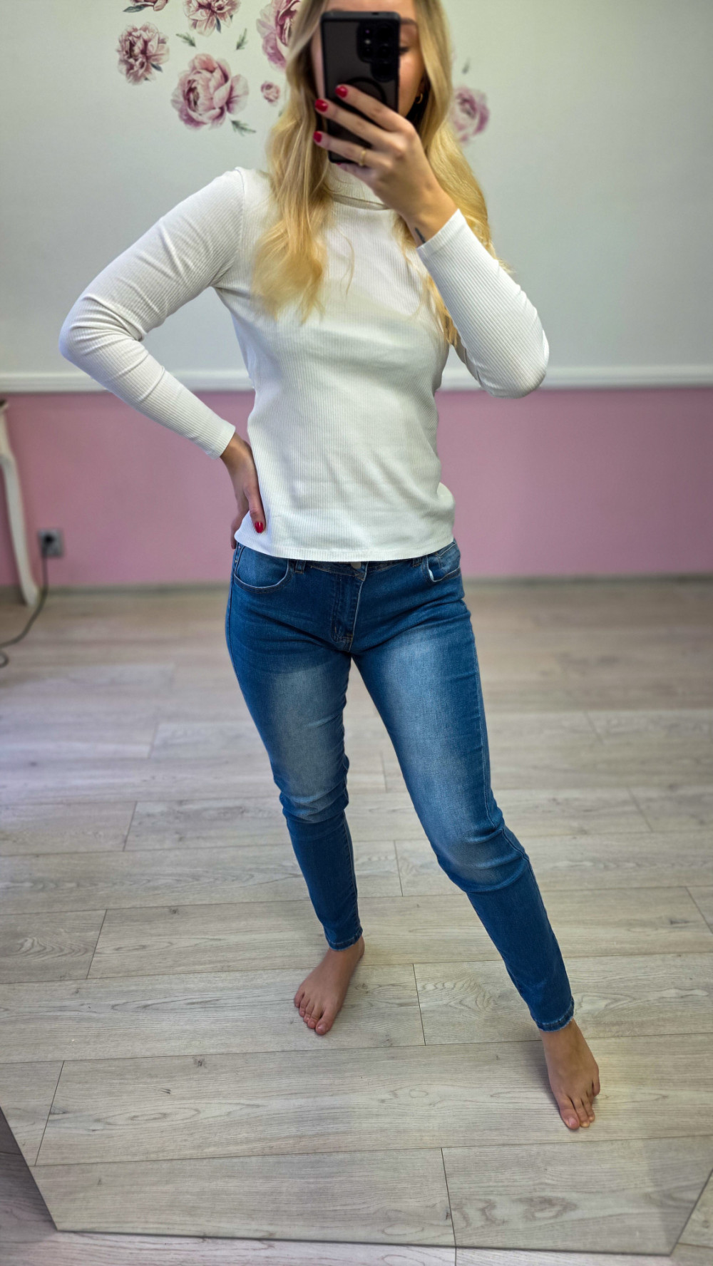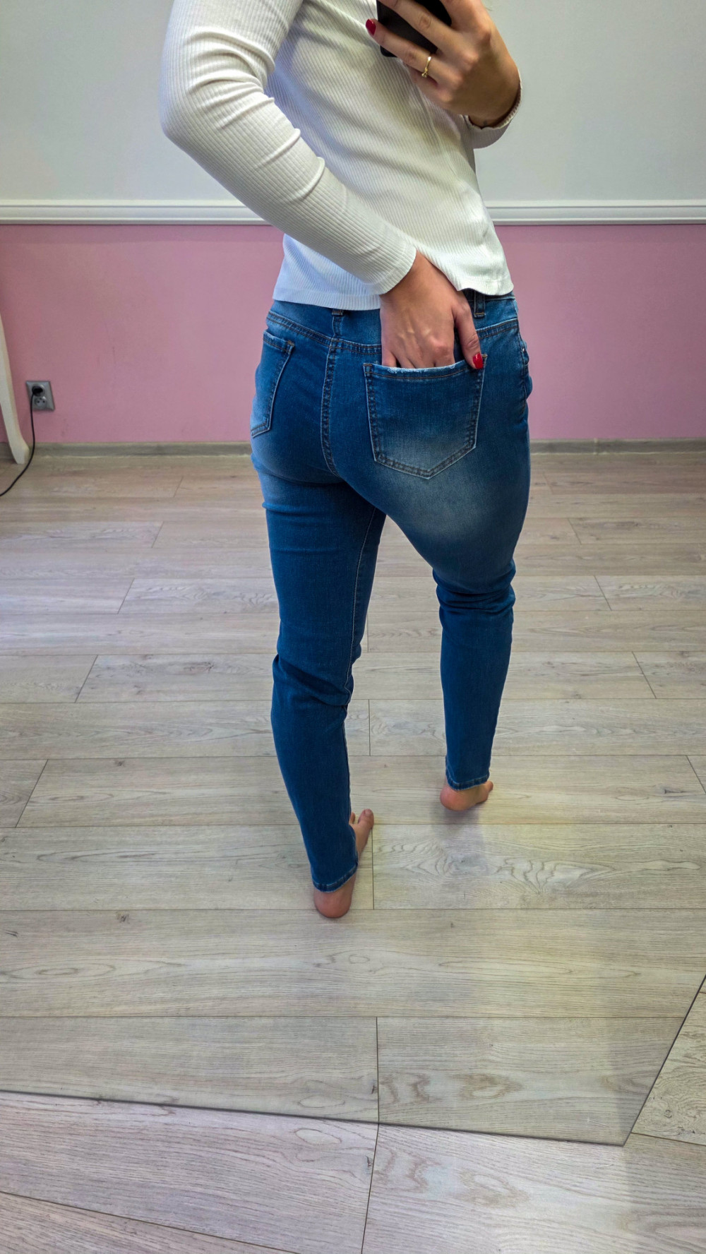 Klasyczne granatowe jeansy damskie o fasonie slim to idealna baza do wielu codziennych stylizacji. Dopasowany krój pięknie podkreśla sylwetkę, modelując nogi i zapewniając wygodę noszenia przez cały dzień. To ponadczasowy model, który świetnie sprawdzi się w zestawieniu z t-shirtem, swetrem, koszulą czy elegancką bluzką. Jeansy pasują zarówno do sportowych, jak i bardziej kobiecych stylizacji – sneakersów, botków czy szpilek. To uniwersalne spodnie, które z łatwością dopasujesz do swojego stylu.
