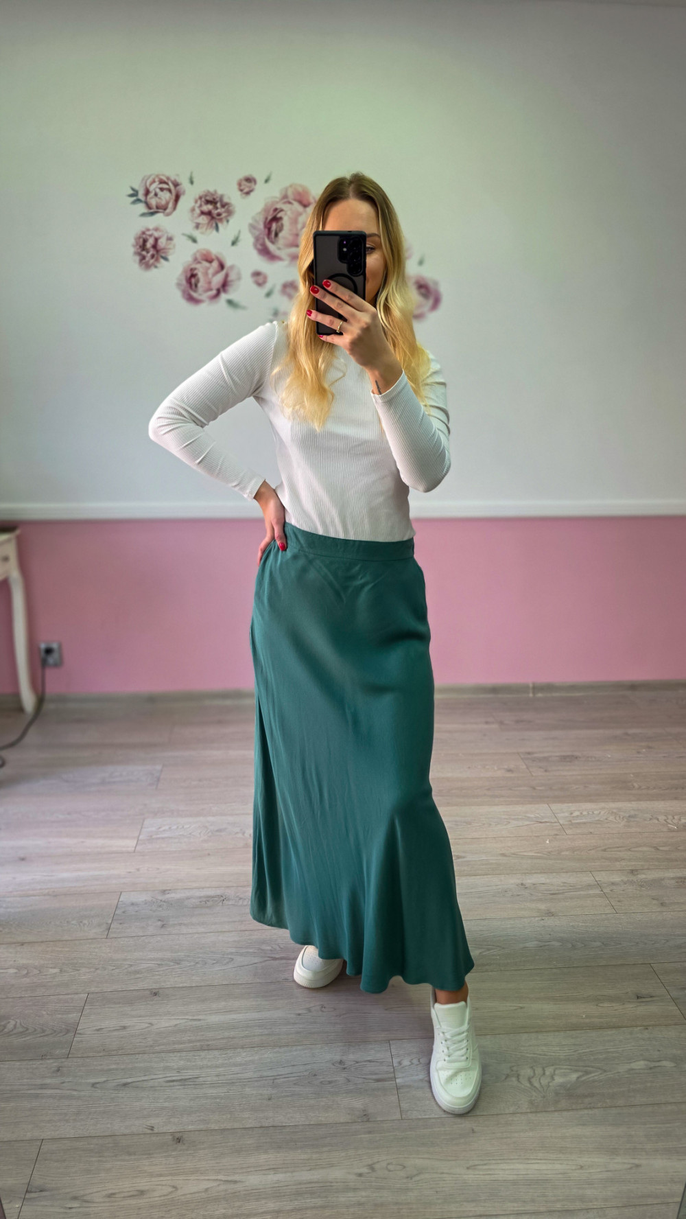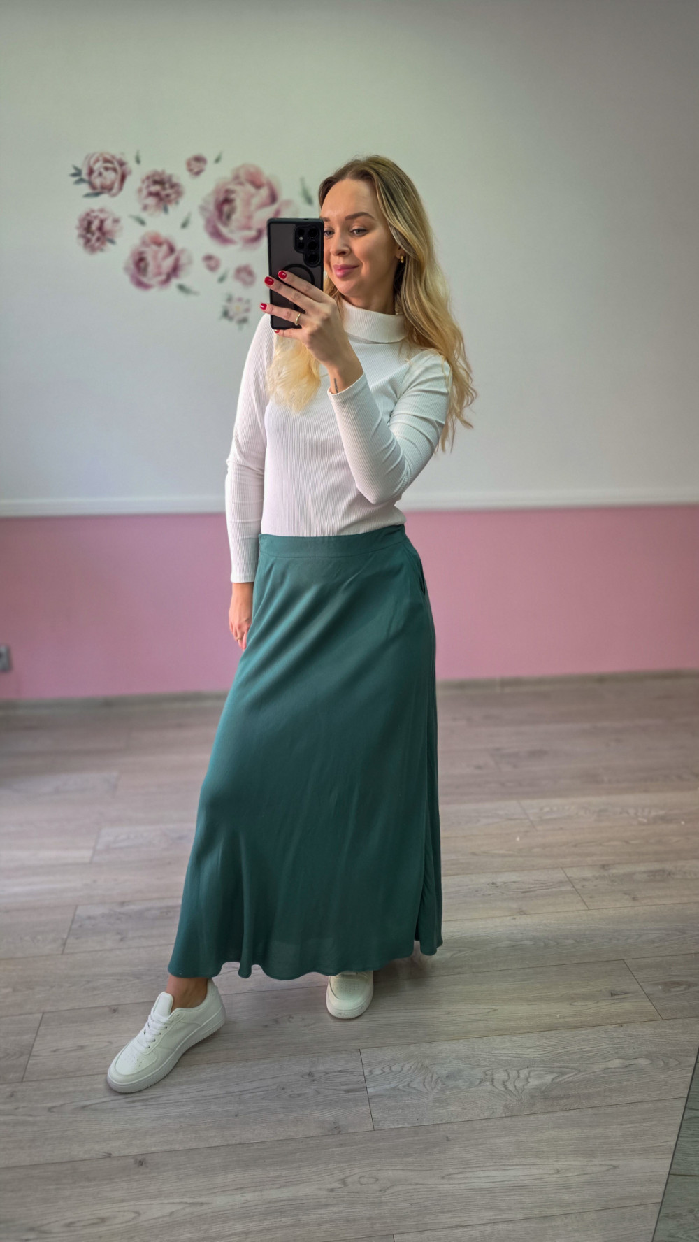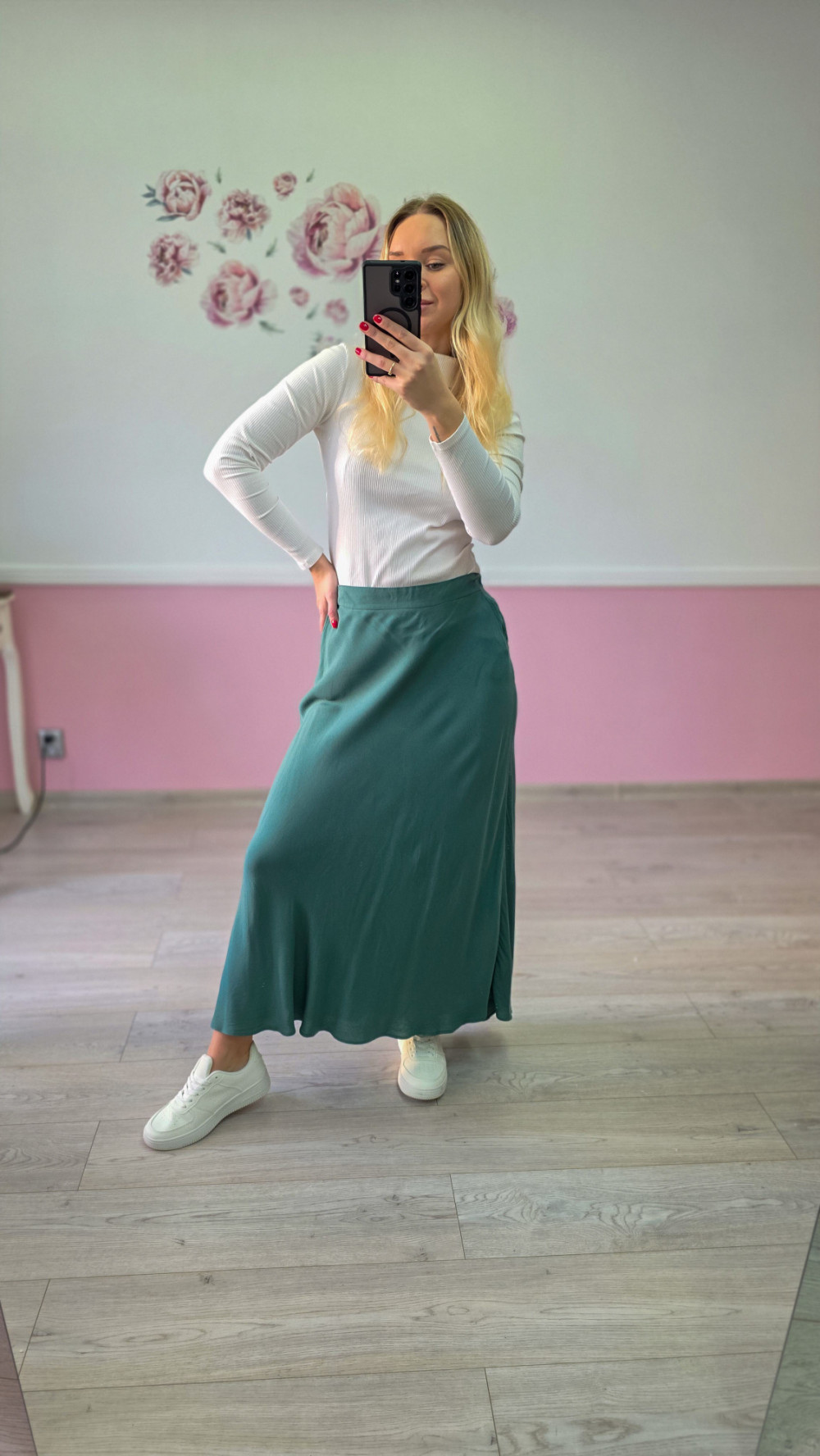 Zielona spódnica maxi to idealny wybór dla kobiet, które kochają swobodę, wygodę i naturalną elegancję. Długość maxi pięknie wydłuża sylwetkę, a miękko układający się materiał dodaje całości lekkości i subtelności. Ten model doskonale sprawdzi się w codziennych stylizacjach – do sneakersów, sandałów czy klapek, ale również w bardziej kobiecych zestawieniach z butami na obcasie. To spódnica idealna na wiosnę, lato i wczesną jesień.