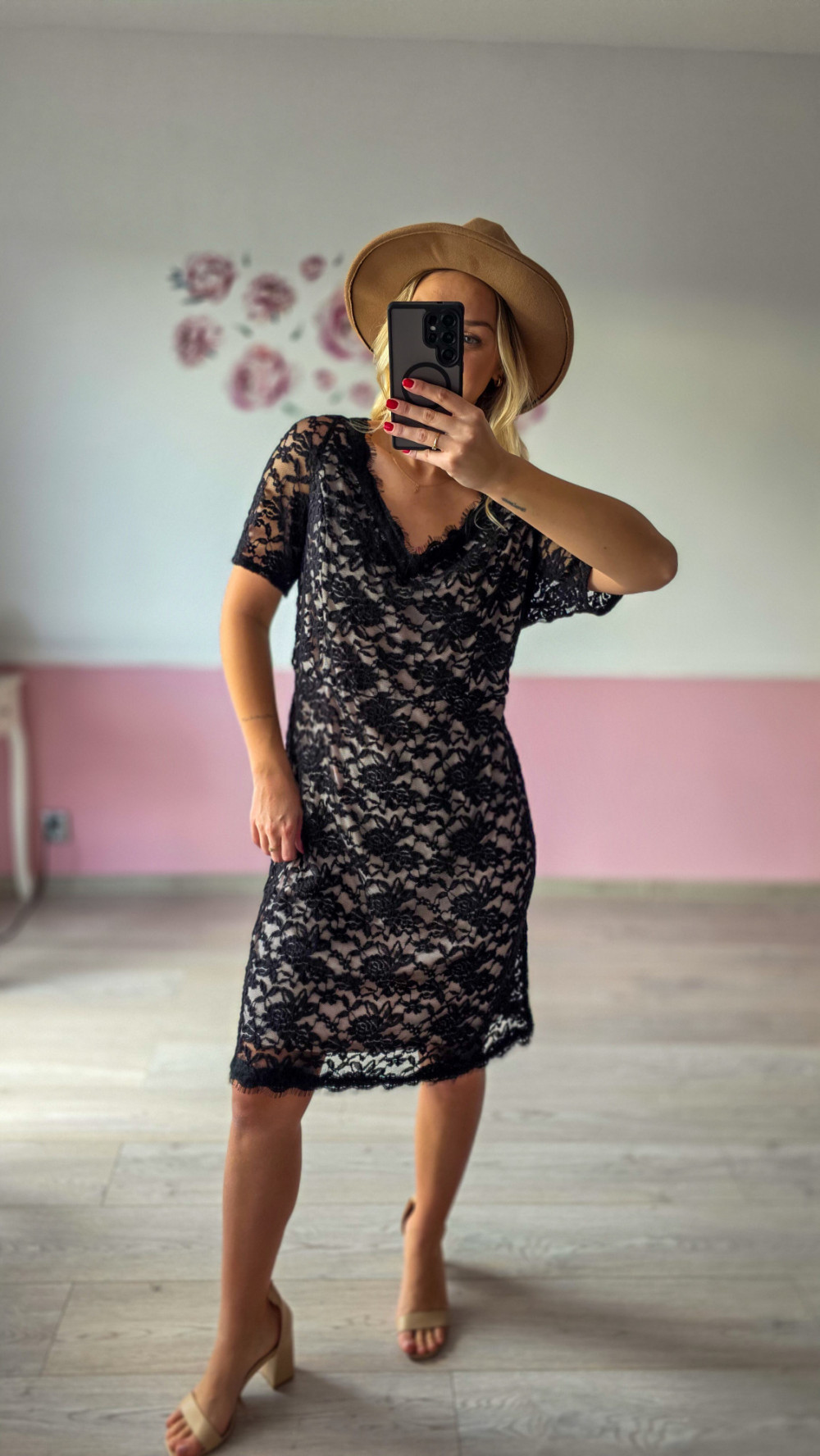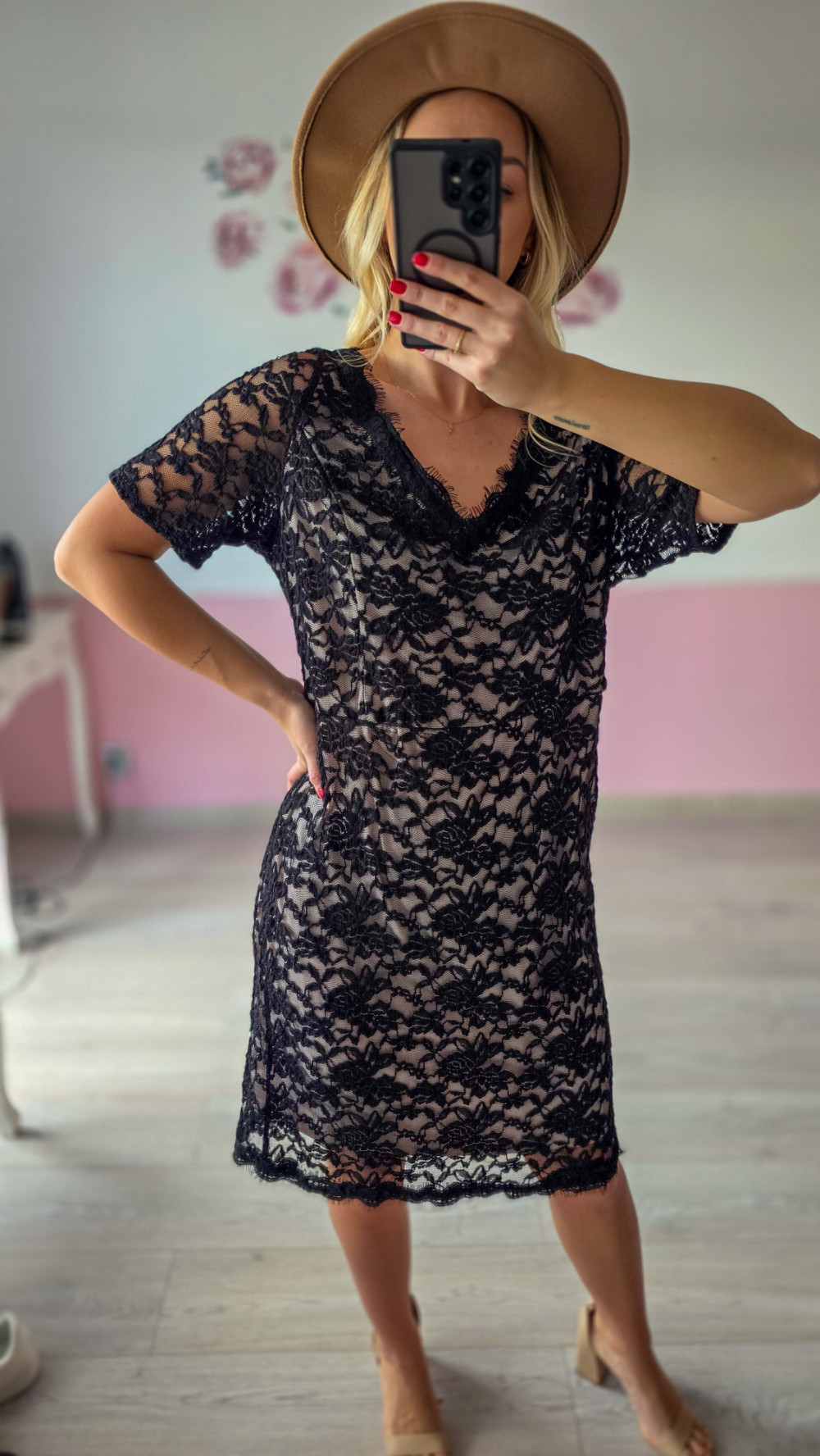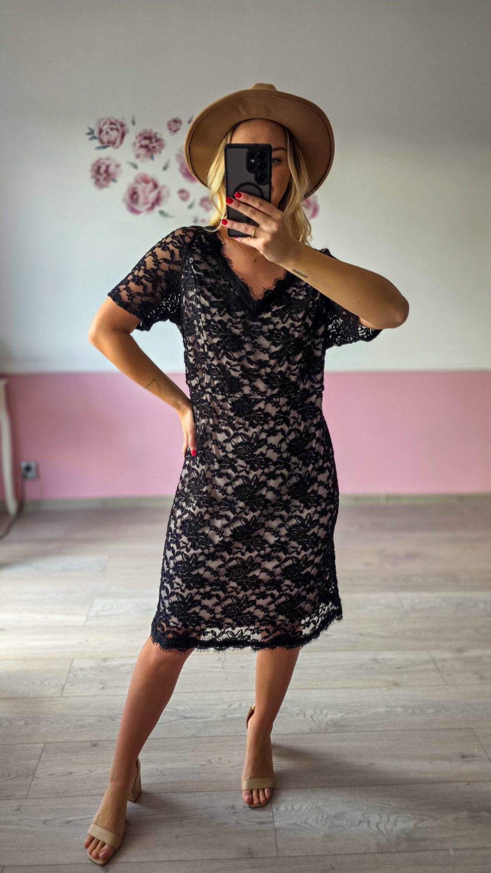 Czarna sukienka koronkowa midi z krótkim rękawem – klasyczna elegancja