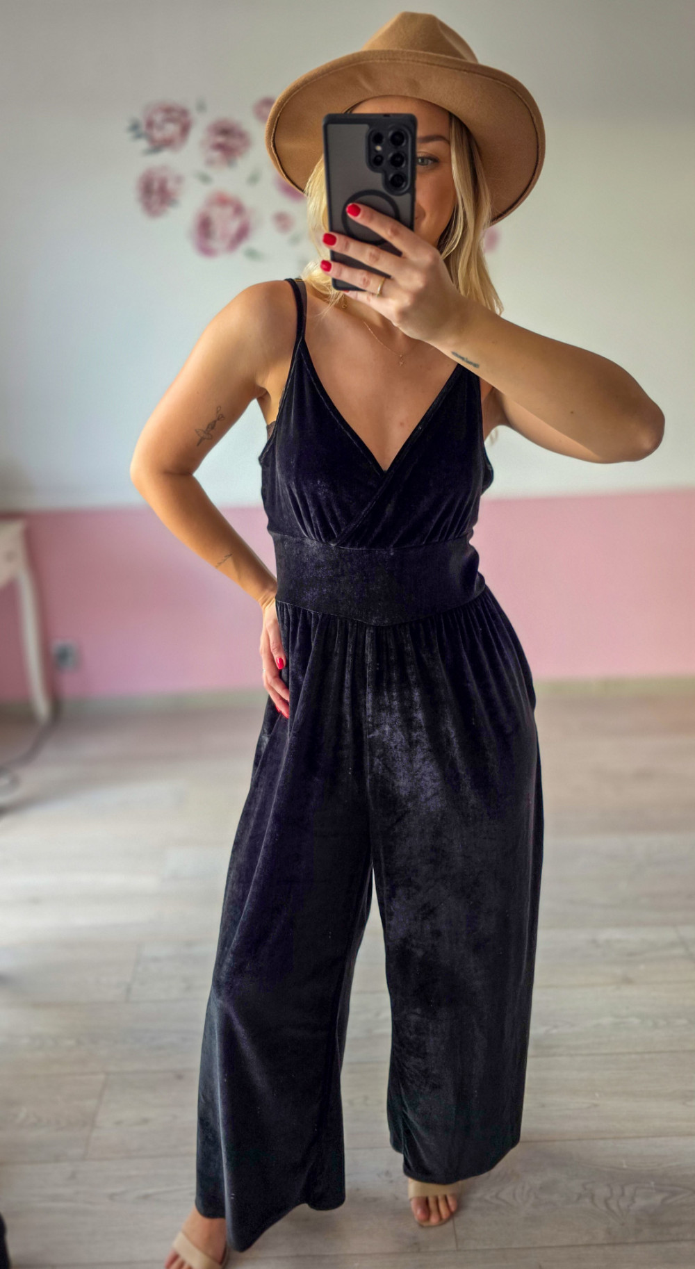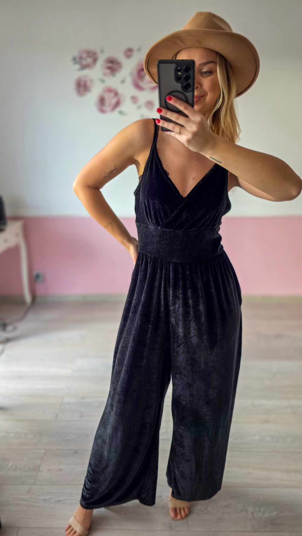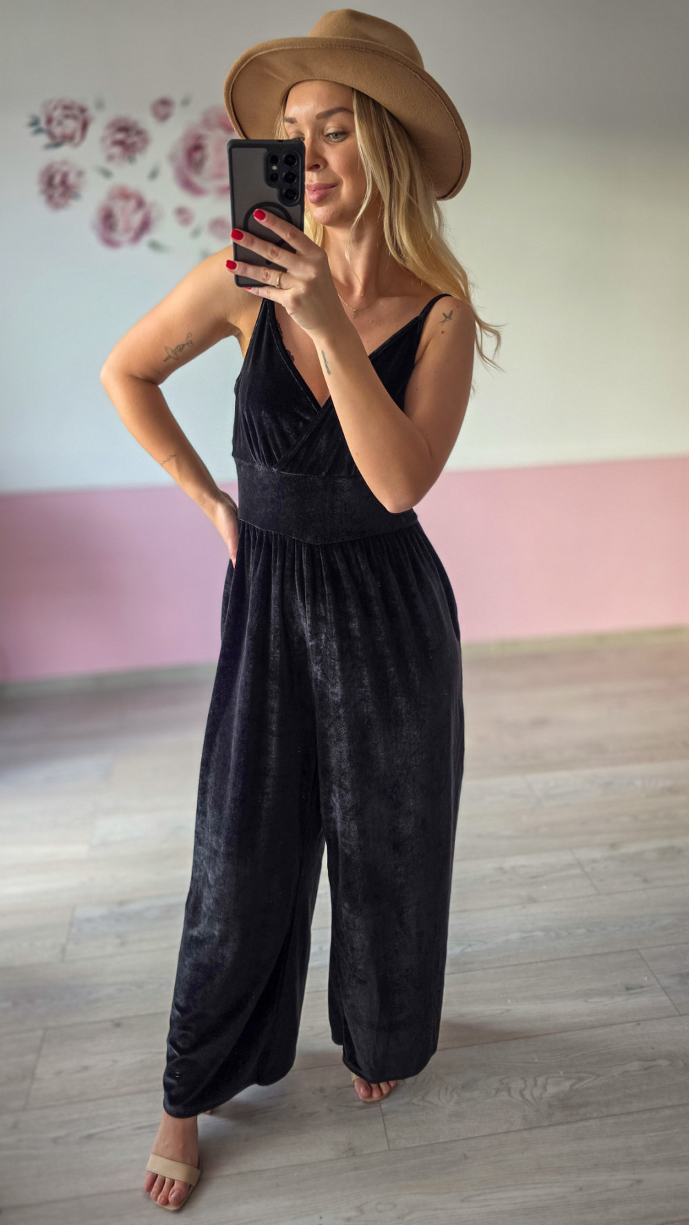 Czarny kombinezon welurowy z kopertowym dekoltem – elegancki i wygodny
