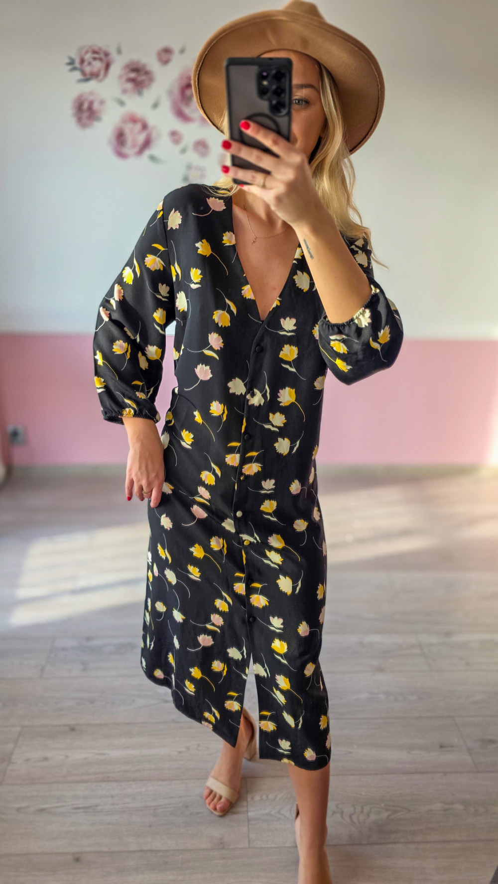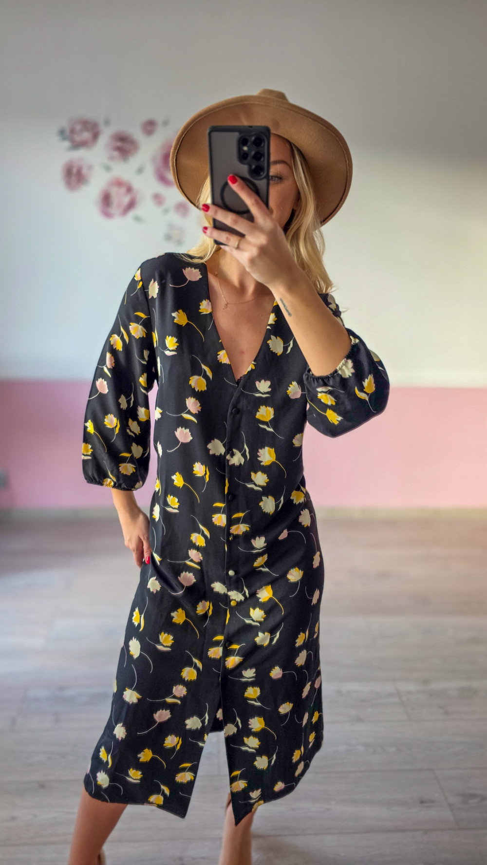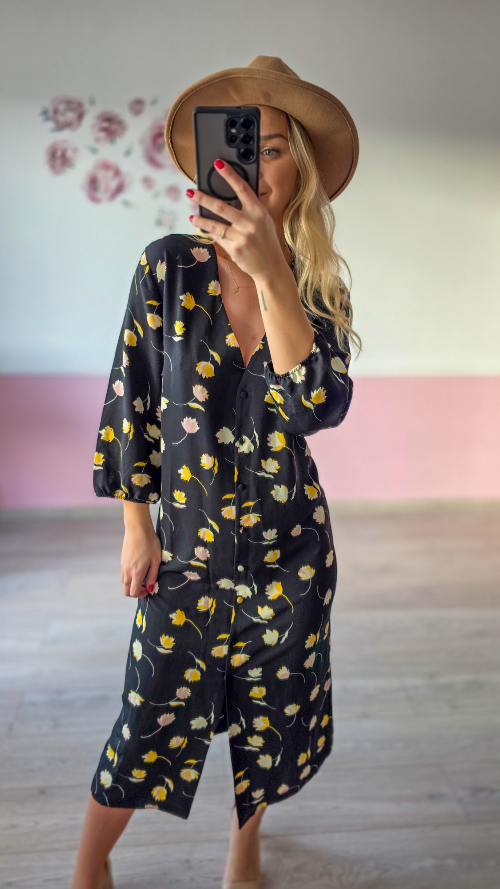 Czarna sukienka koszulowa w kwiaty midi – kobieca i stylowa
