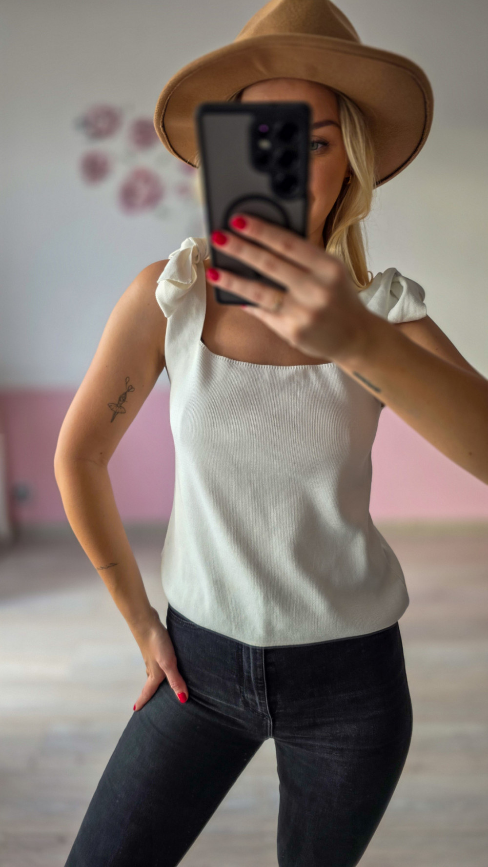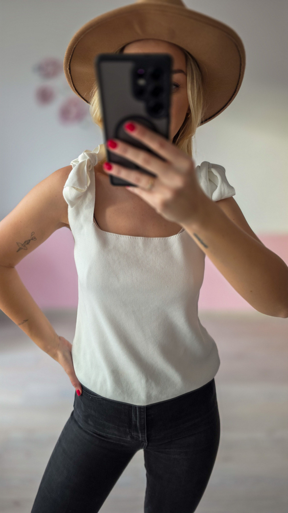 Biała bluzka na ramiączkach z wiązaniami – klasyczna i dziewczęca