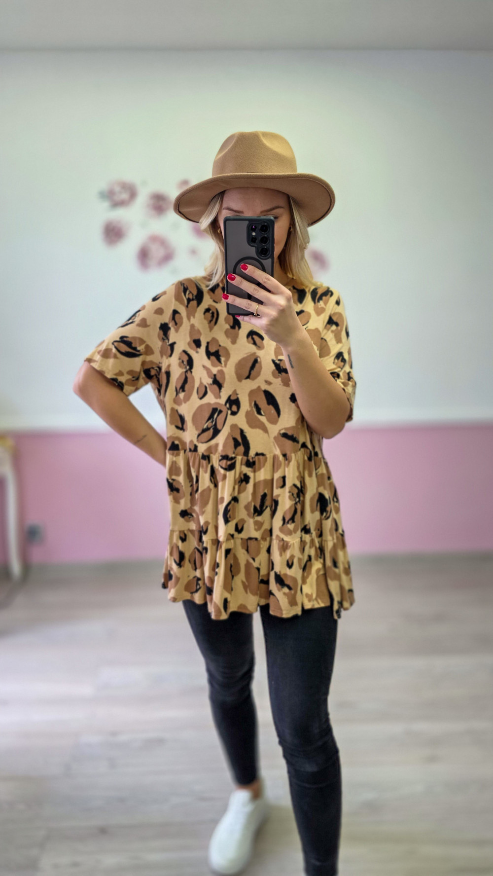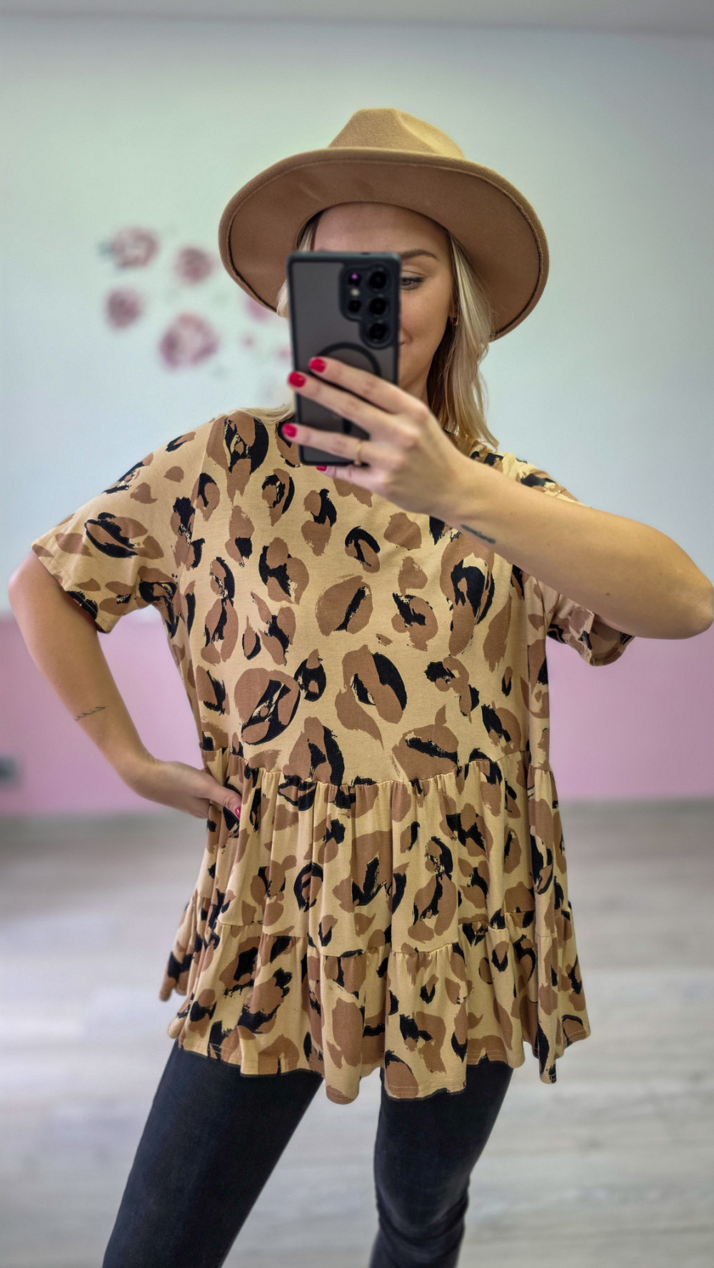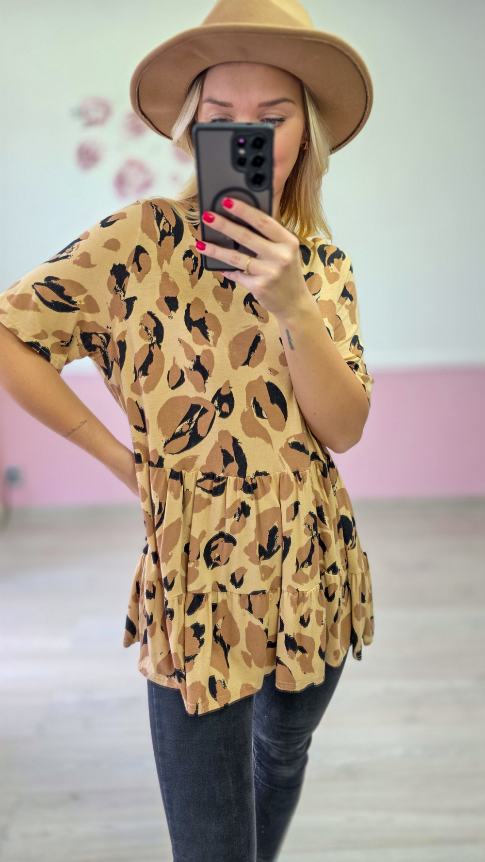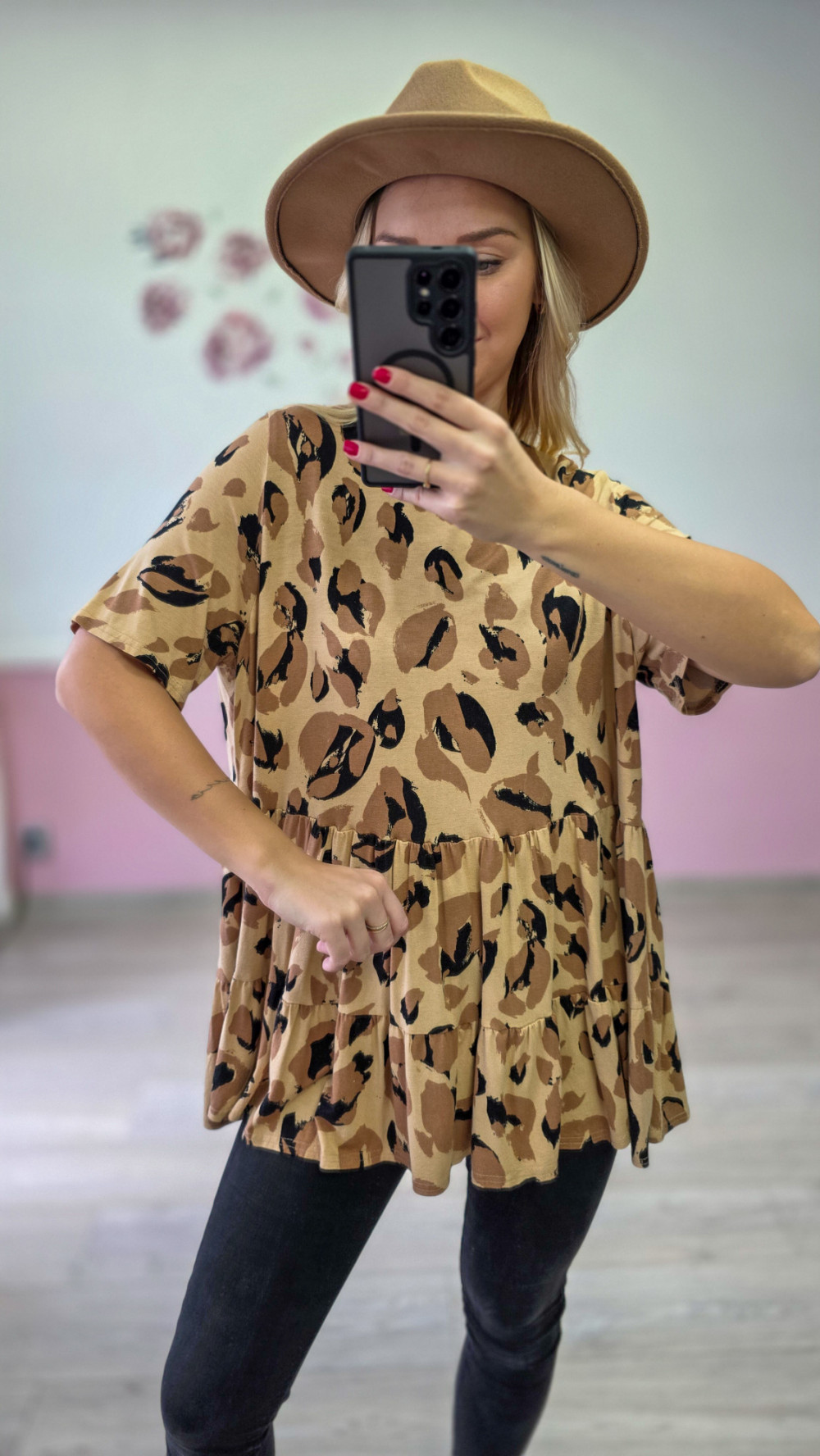 Bluzka damska w panterkę z krótkim rękawem – z rozkloszowaną falbaną