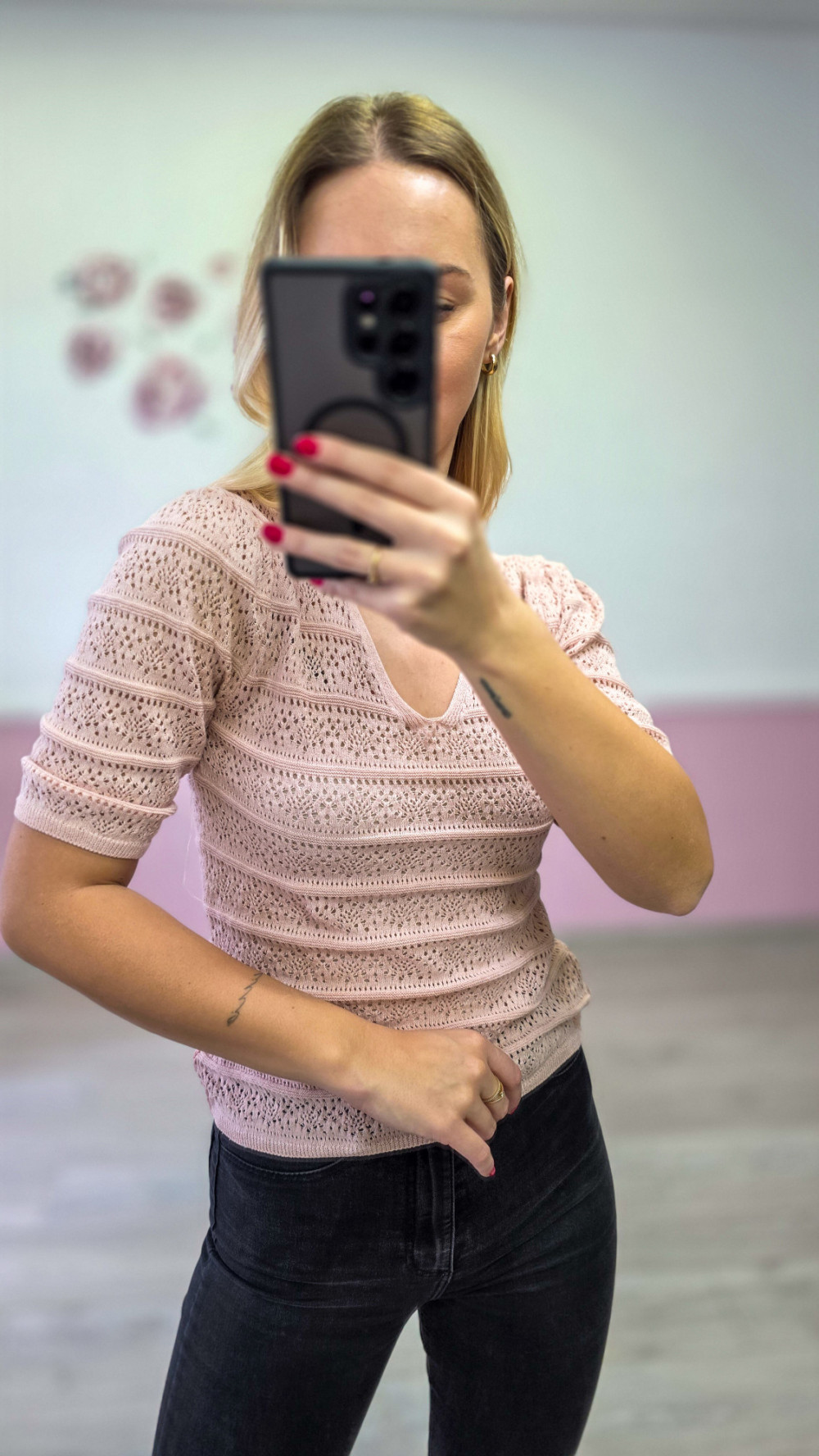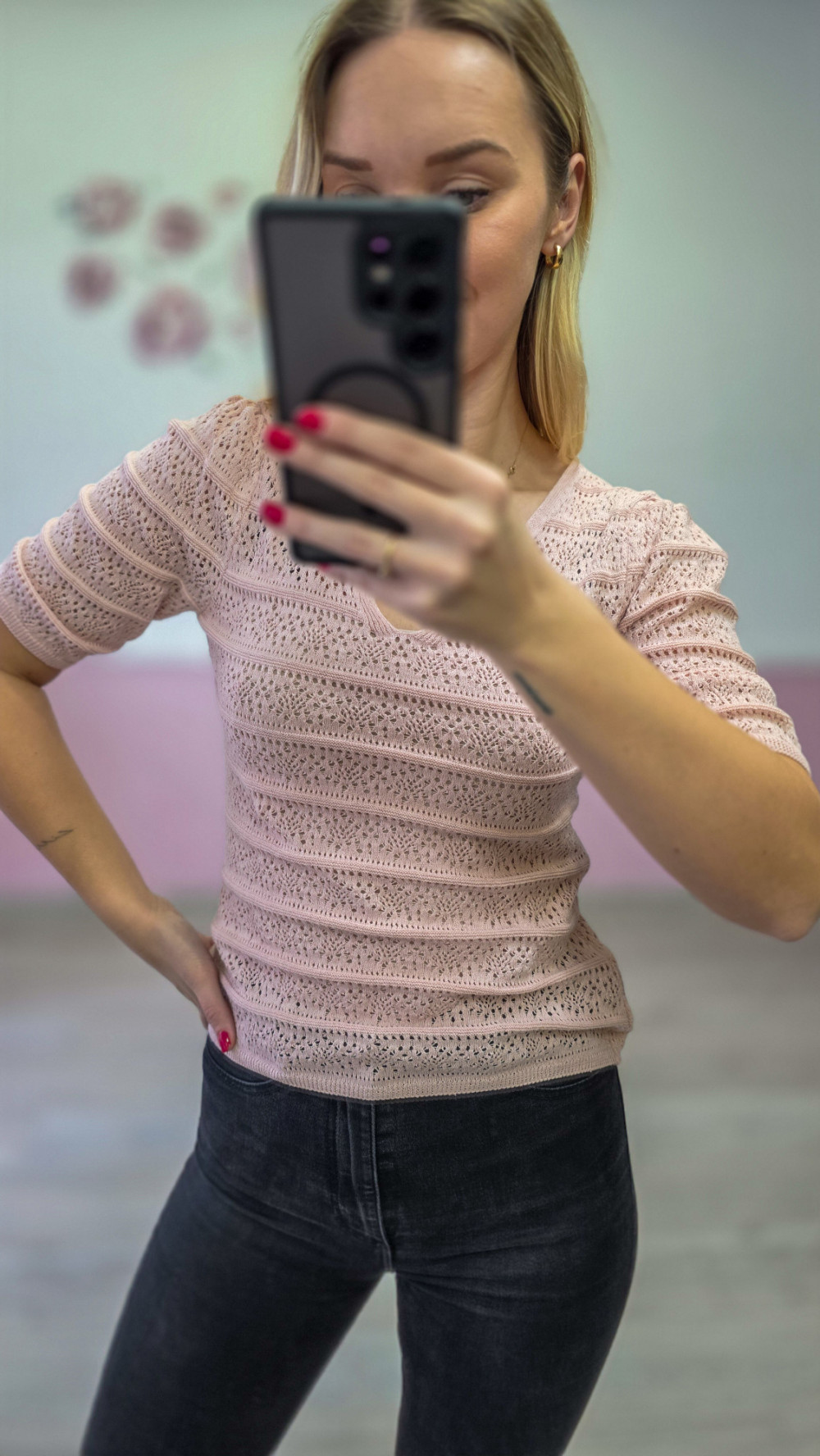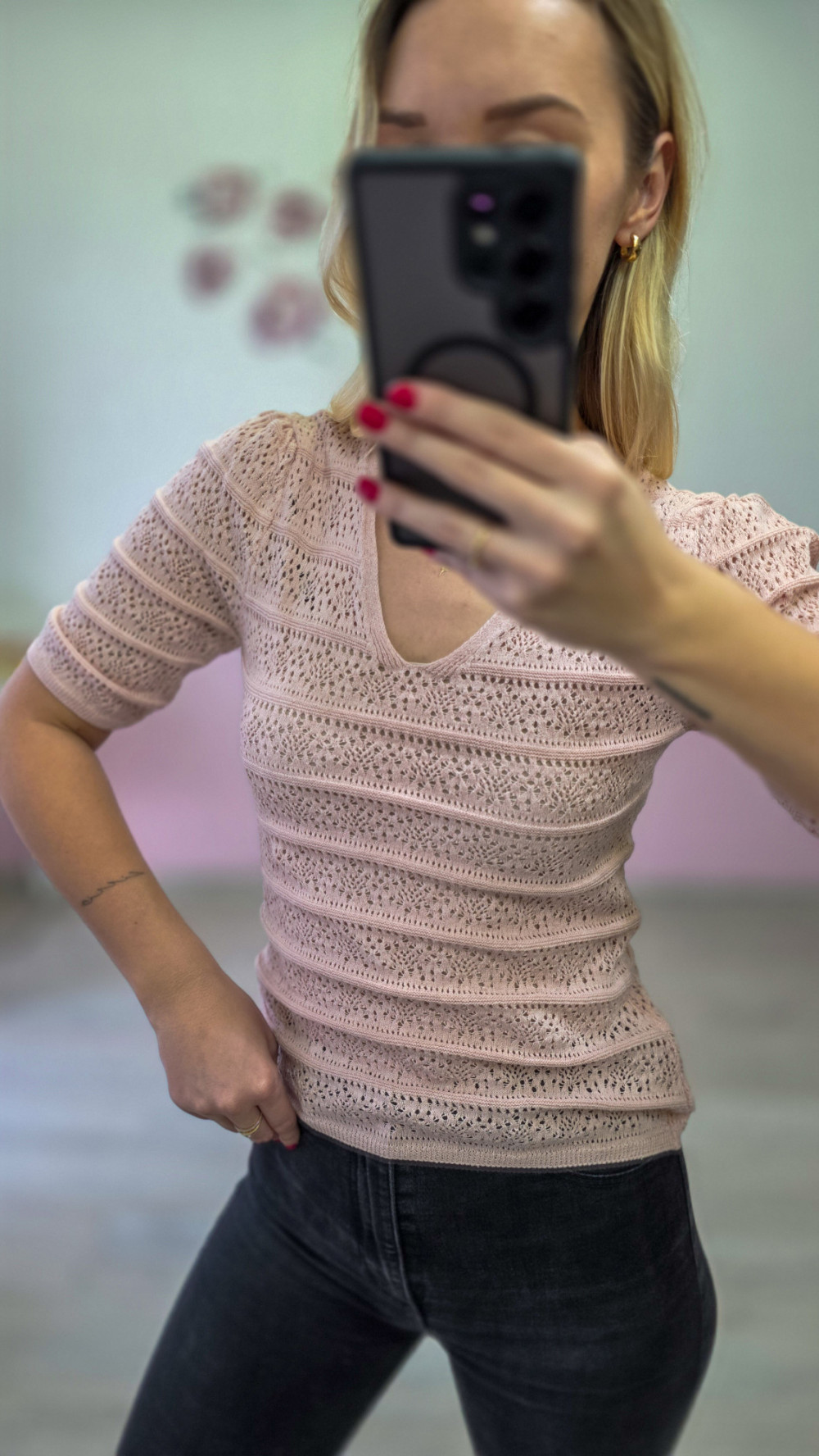 Ażurowa bluzka damska z krótkim rękawem – różowa, dzianinowa