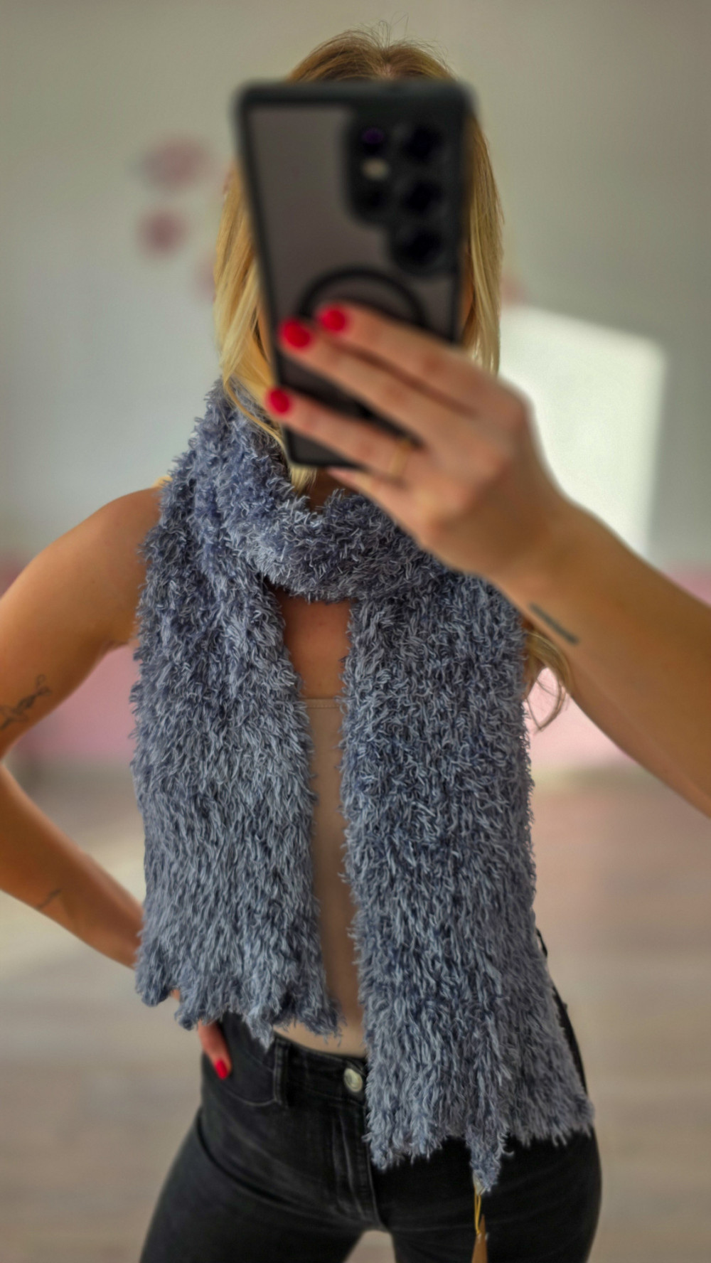 Stylowy szary puszysty szalik damski to idealny wybór na jesień, zimę i chłodniejsze wiosenne poranki. Jego wyjątkowo miękka, przyjemna w dotyku struktura pięknie układa się wokół szyi, zapewniając ciepło i komfort noszenia przez cały dzień. Neutralny odcień szarości doskonale komponuje się z jasnymi i ciemnymi stylizacjami.
