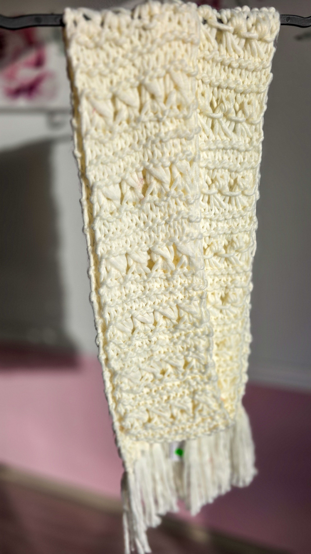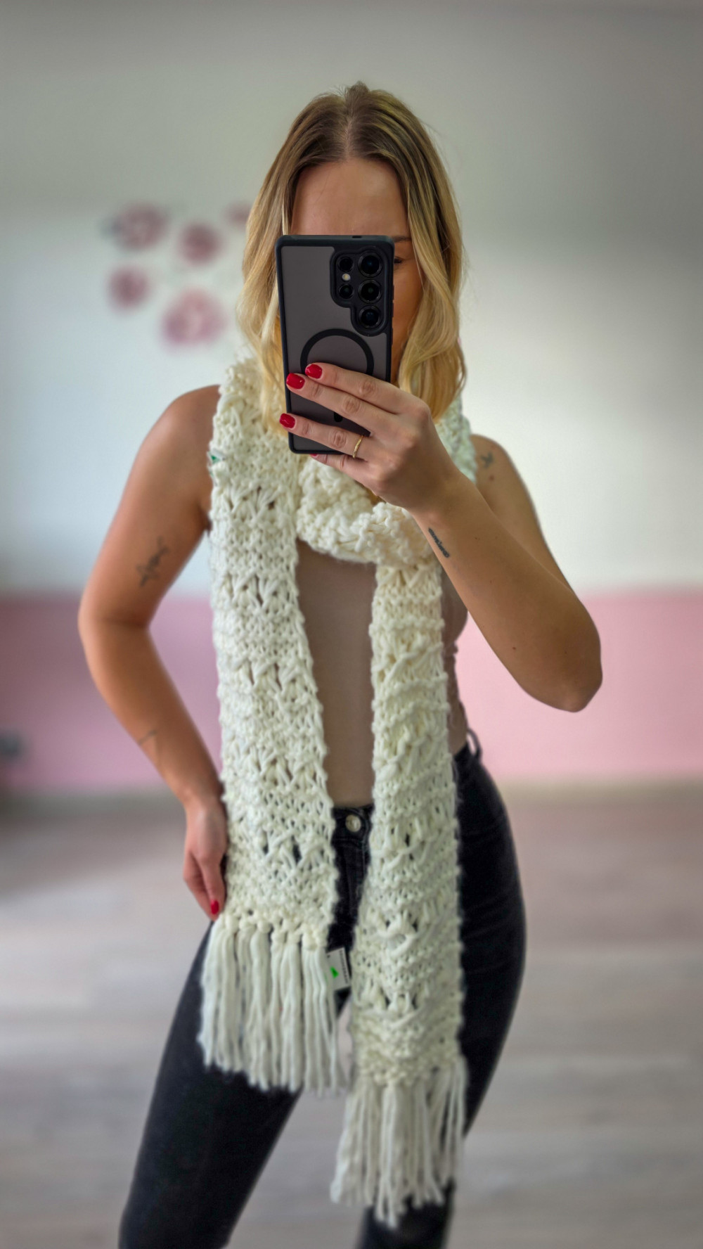 Kremowy ręcznie pleciony szalik damski z frędzlami – naturalna elegancja na chłodne dni